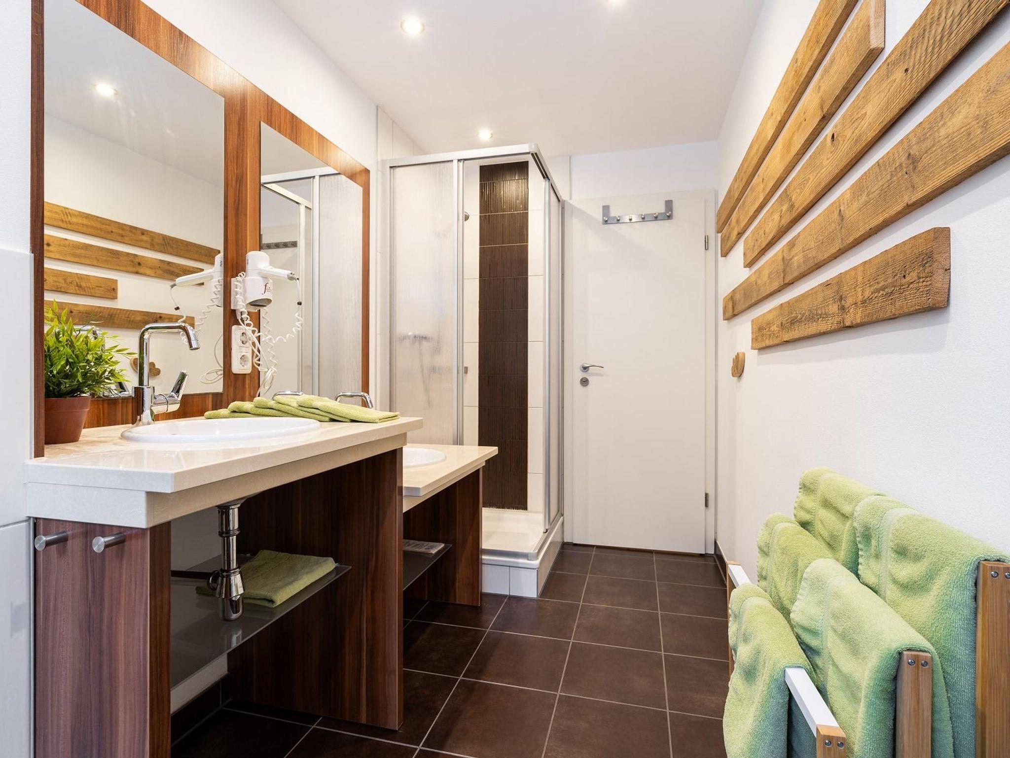 Das Bad hat ein Kinder- und Elternwaschbecken, Dusche, Fön und Tageslicht.