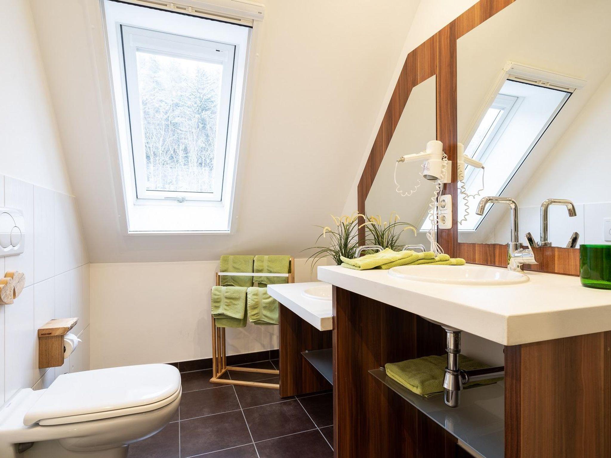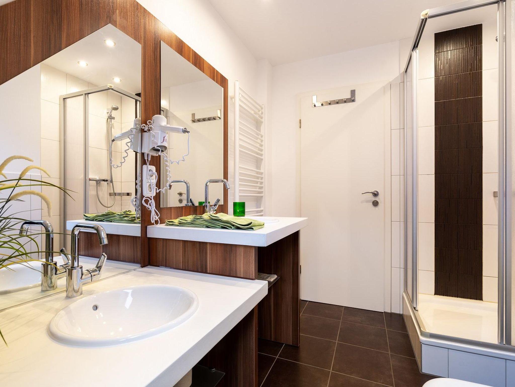 Das Bad hat ein Kinder- und Elternwaschbecken, Dusche, Fön und Tageslicht.