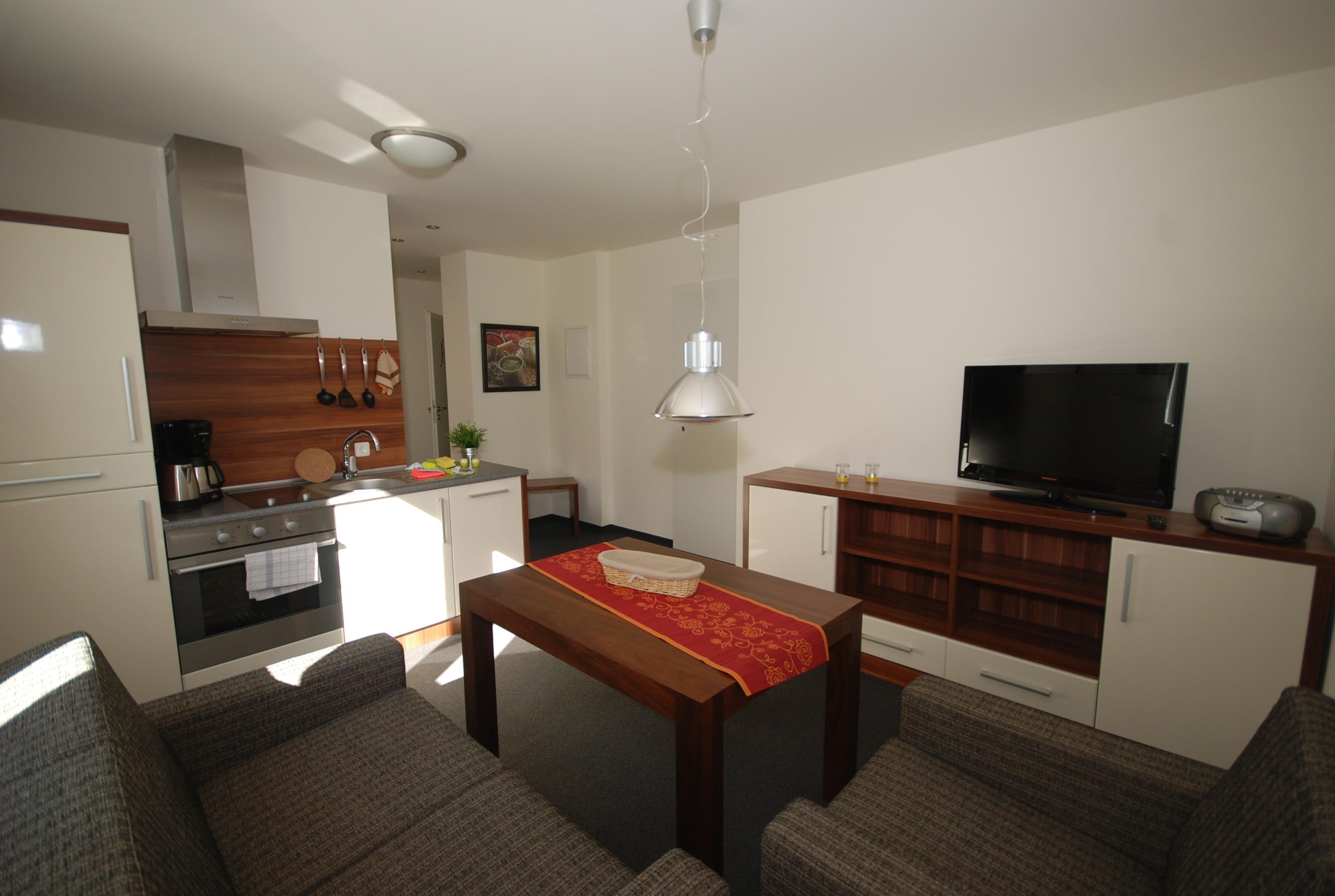 moderner Esstisch, 1 Sofa, Sssel und Sideboard,Spülmaschine, Cerankochfeld, Kühlschrank mit Gefrierfach, Wasserkocher, Kaffeemaschine,