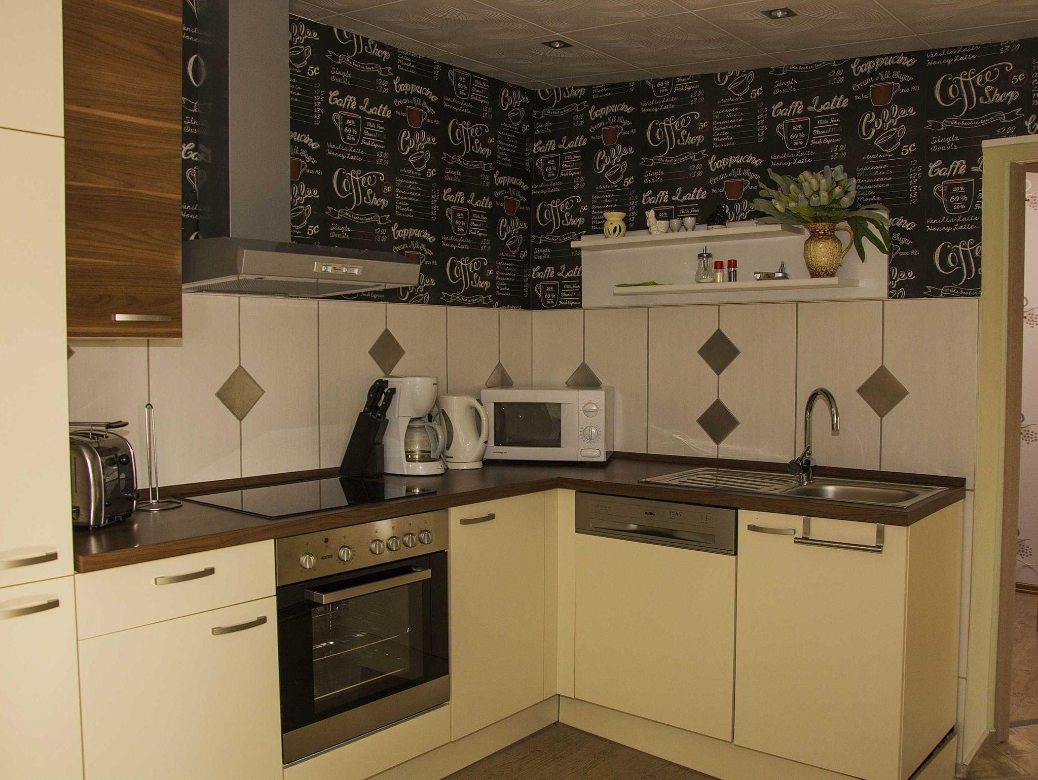 Die Küche ist mit Elektroherd, Mikrowelle , Geschirrspülmaschine, Kühlschrank mit Gefrierfach, Kaffeemaschine, Toaster und Wasserkocher,Geschirr, Besteck und Gläsern bestens bestückt.