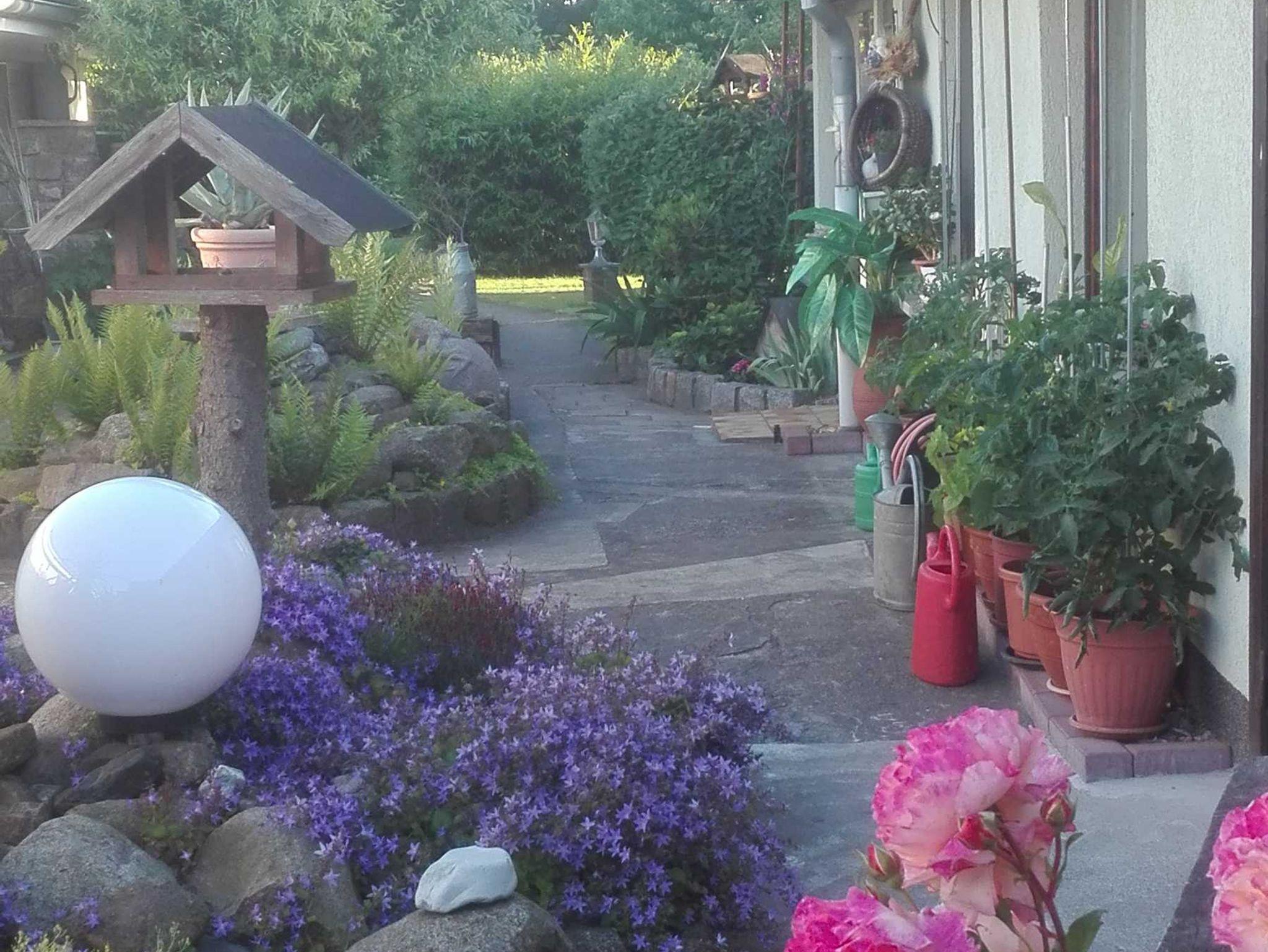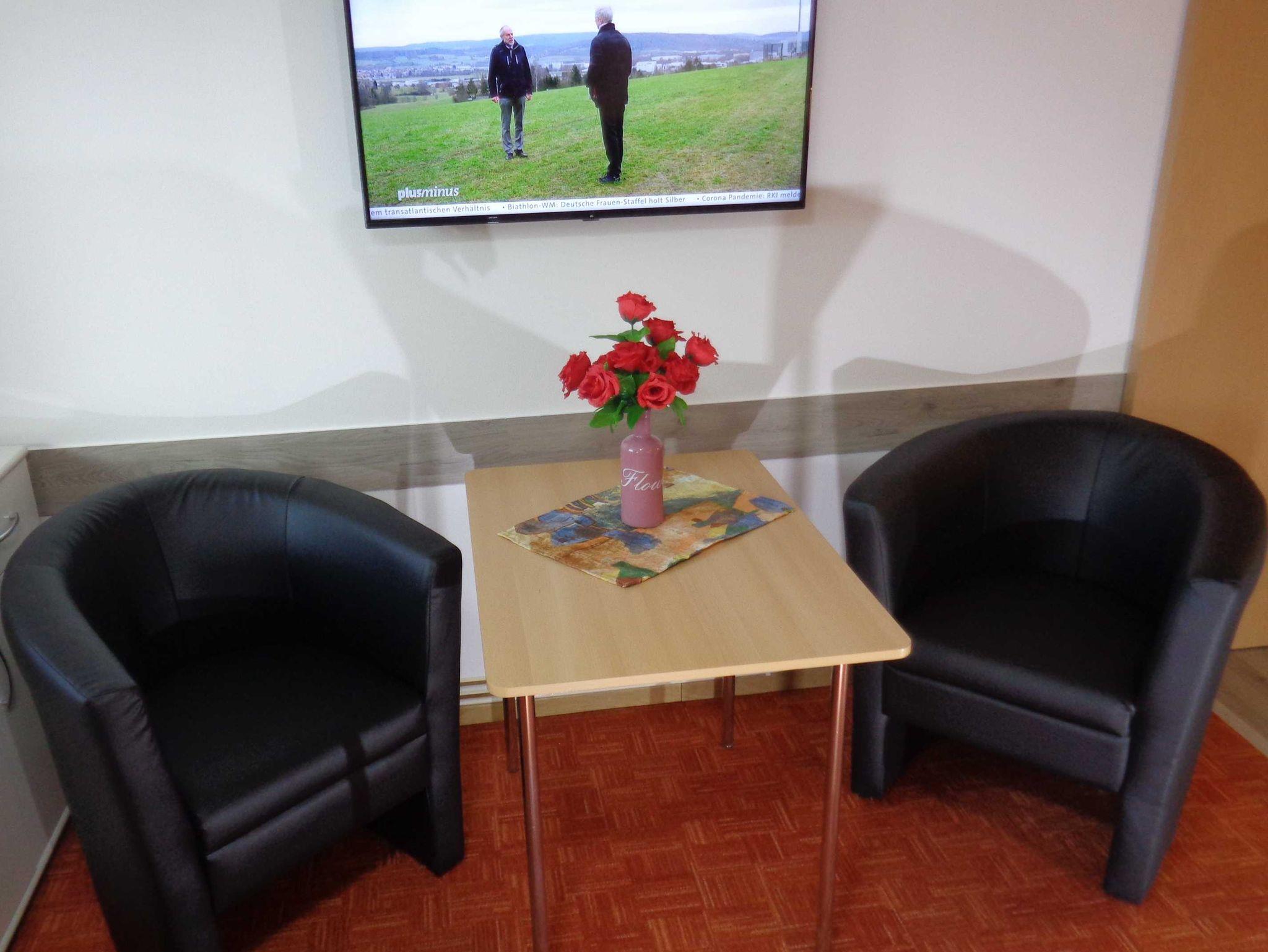 Kleine Ferienunterkunft mit sep. Eingang auf eigenem Grundstück, Sitzen im Grünen (Gartenmöbel vorhanden) in ruhiger, aber doch zentraler Lage, Terrasse, ebenerdig. Kombination aus Wohn- und Schlafraum mit einem Einzelbett 90x200, moderner Tisch mit 2 Cocktailsessel