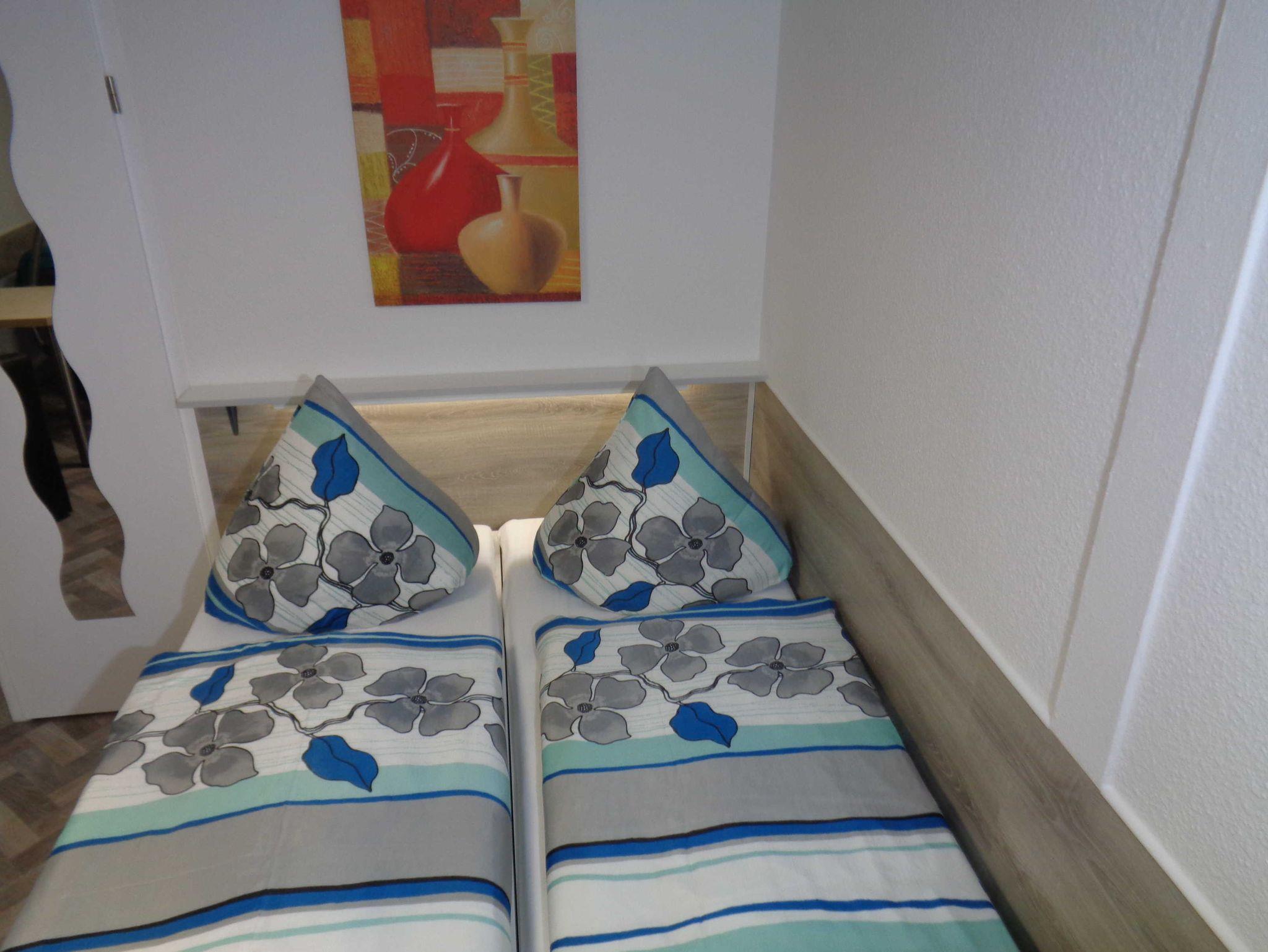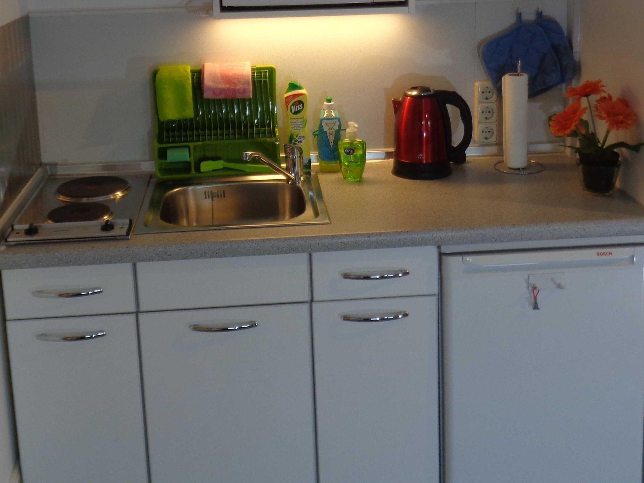 Kleine Ferienunterkunft mit sep. Eingang auf eigenem Grundstück, in ruhiger, aber doch zentraler Lage,10 Min. zum Stadthafen, ebenerdig., WLAN-kostenfrei, Kombination aus Wohn- und Schlafraum, Einzelbett 90x200, moderne Einbauküche neu 02/2022, Mikrowelle mit Grillfunktion, Kühlschrank, doppelte Kochstelle, Eierkocher, Toaster, Kaffeemasch. und Wasserkocher, Küchentisch mit 2 Cocktailsessel