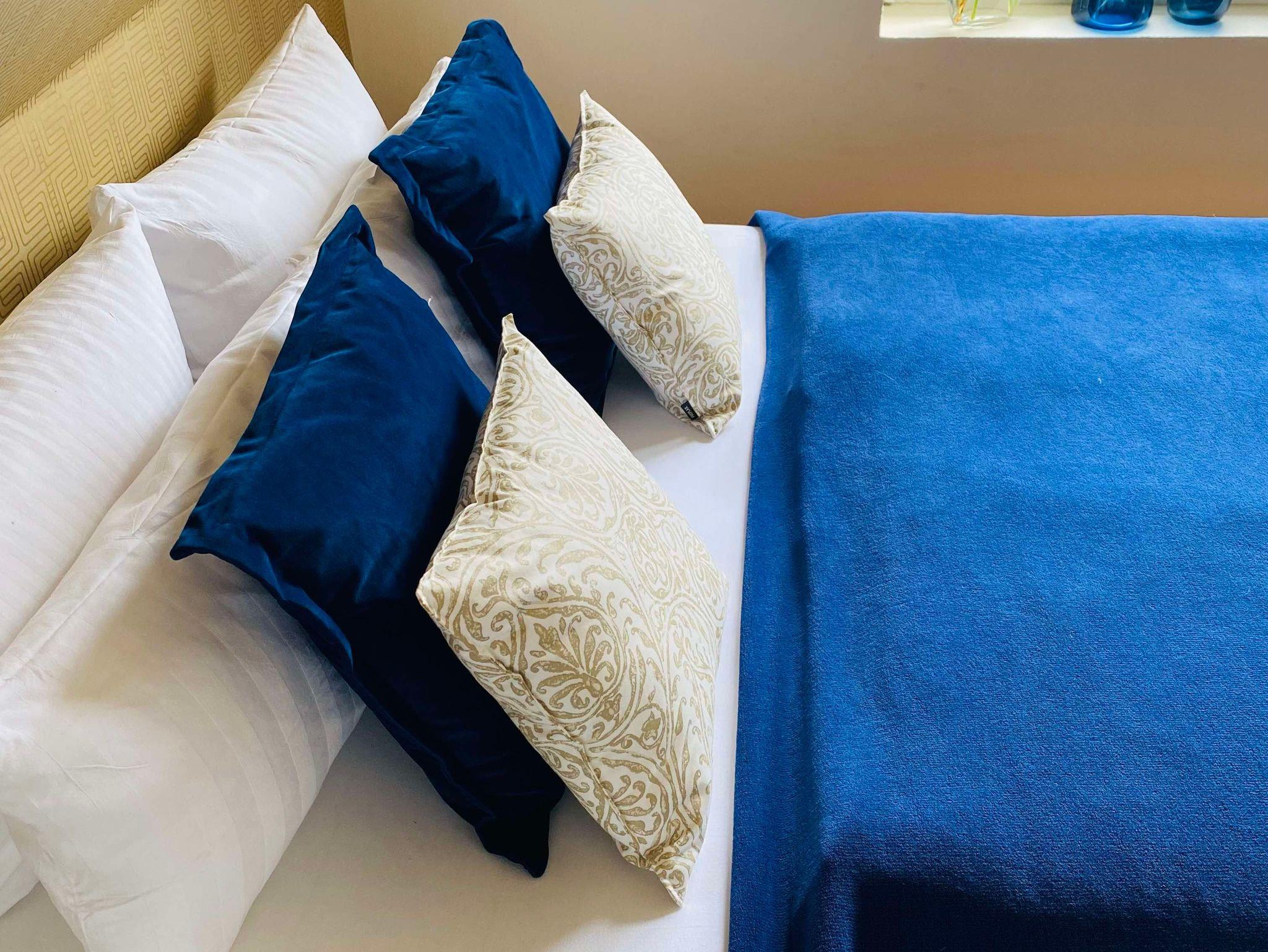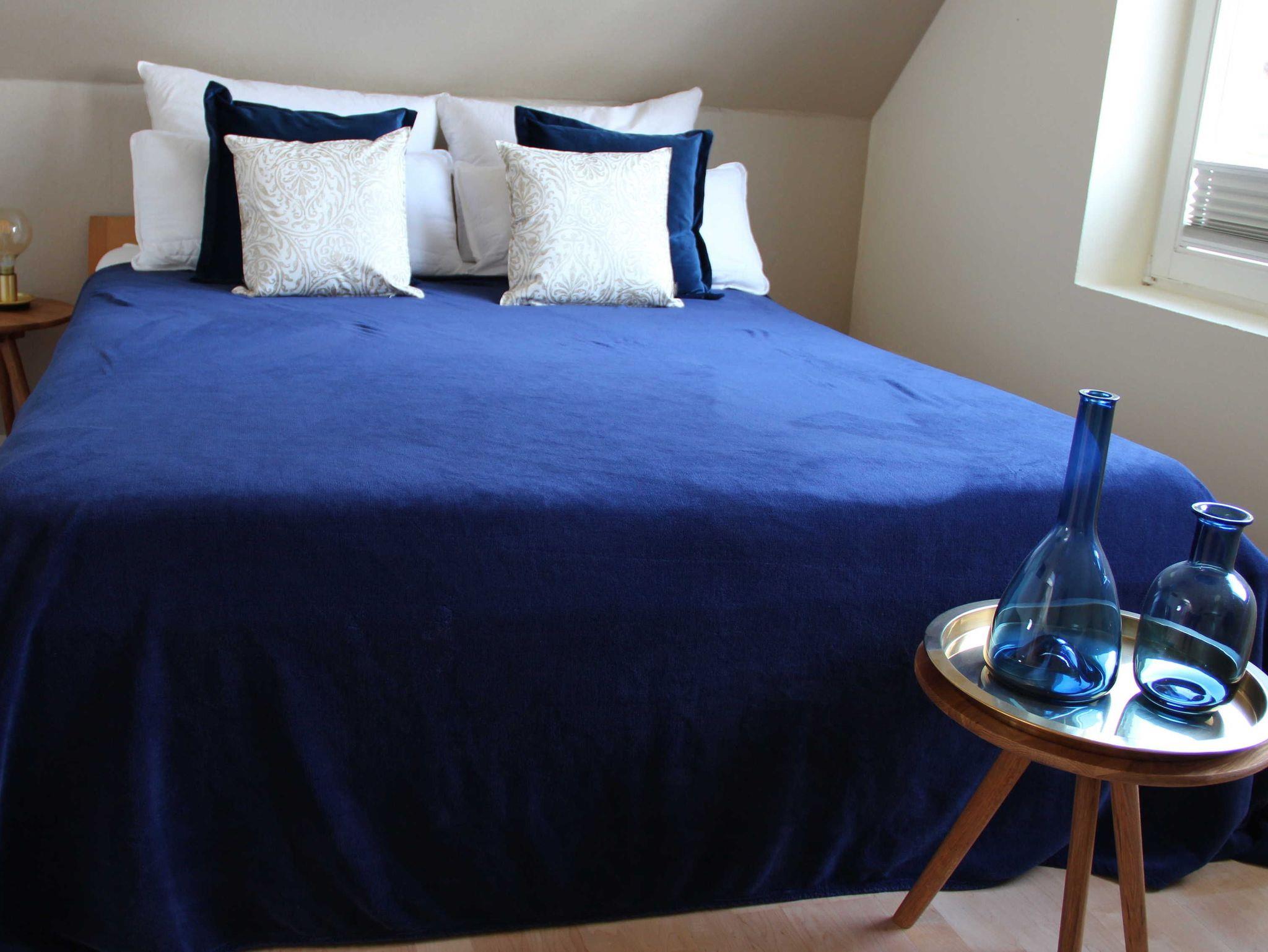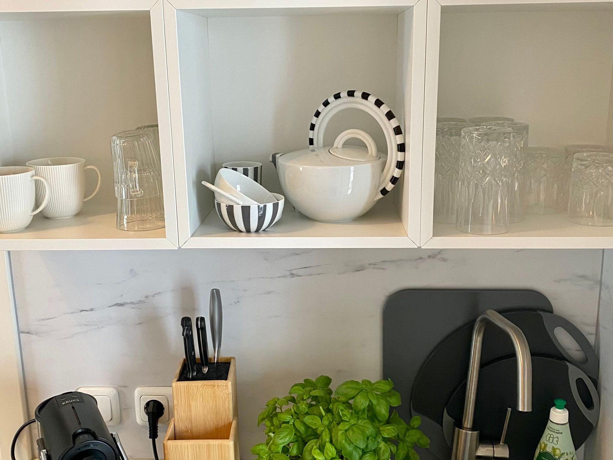 Doppelbett, Bettwäsche, Pantry Küche mit Kühlschrank & Herd, Duschbad mit Fön & Handtüchern, Smart - TV und Internet. Die Pantryküche ist mit Geschirr, Gläsern, Besteck, Töpfen und einer Pfanne, einer Kaffee- und einer Nespressomaschine, Toaster, Wasserkocher und anderen Gebrauchsgegenständen ausgestattet.