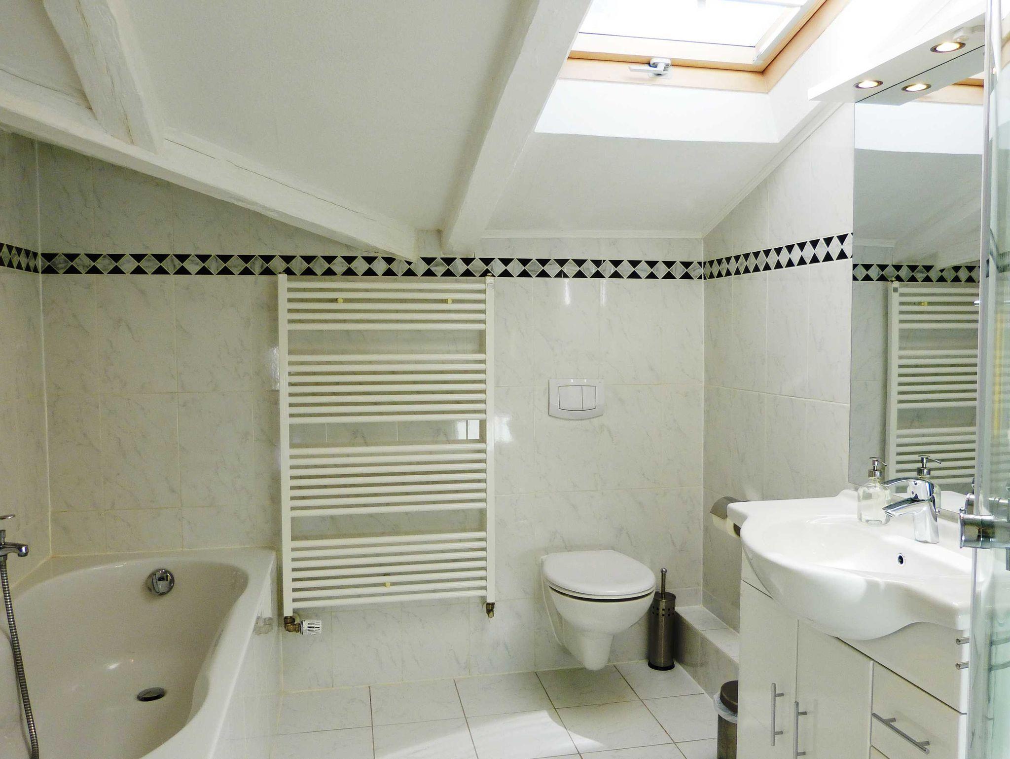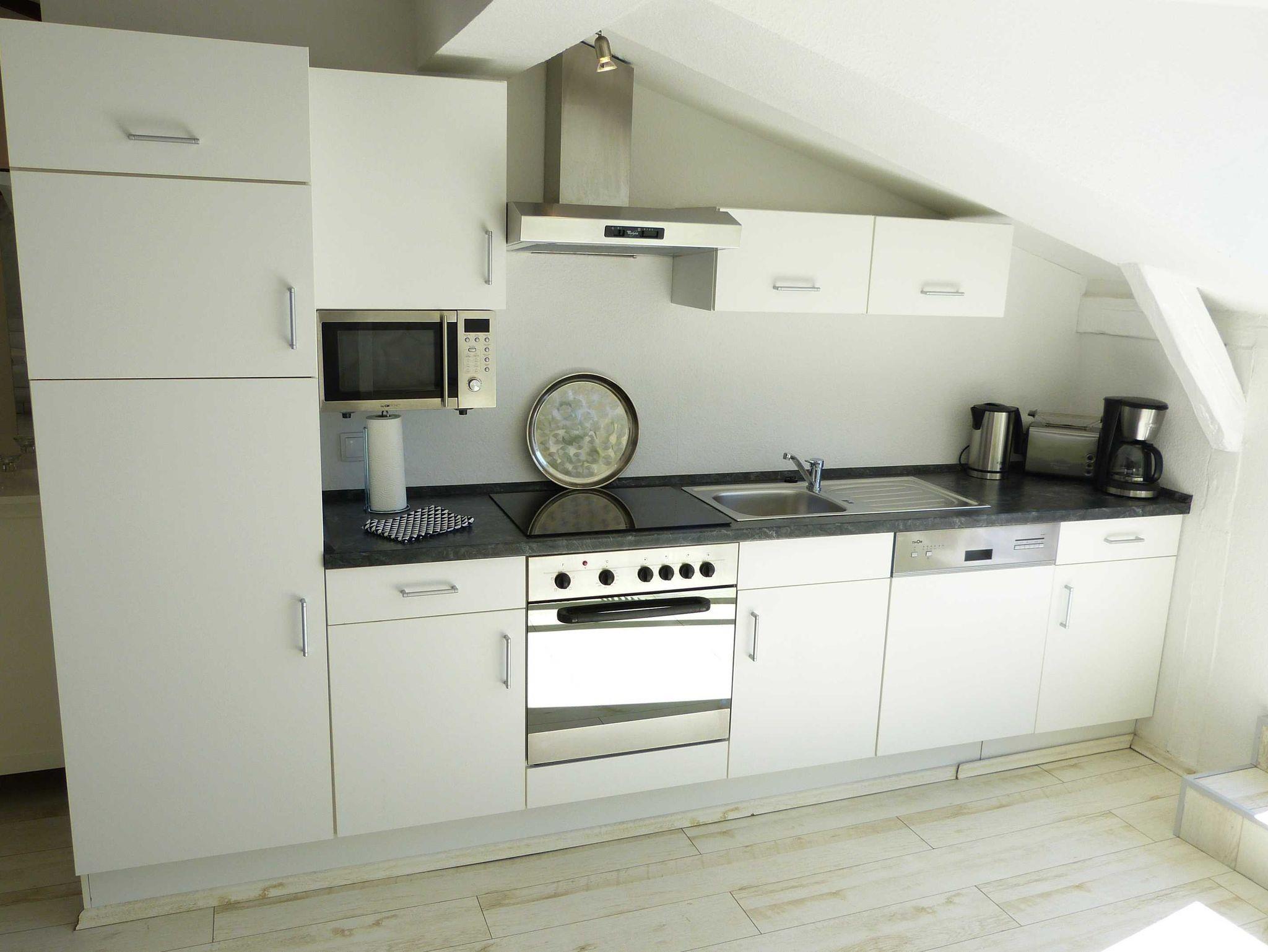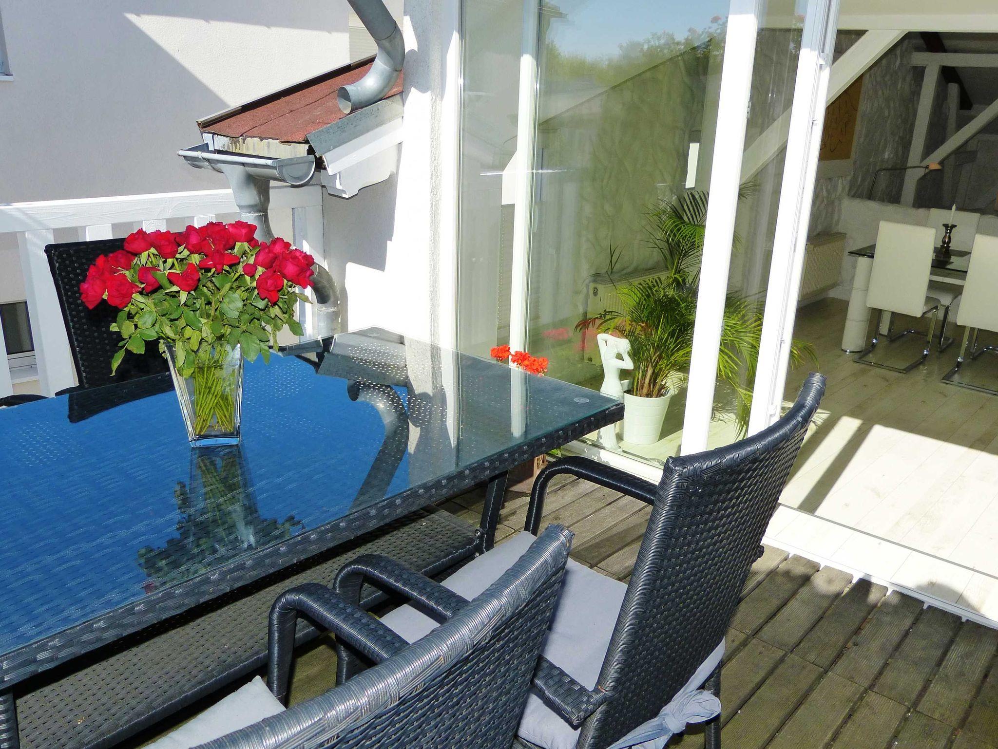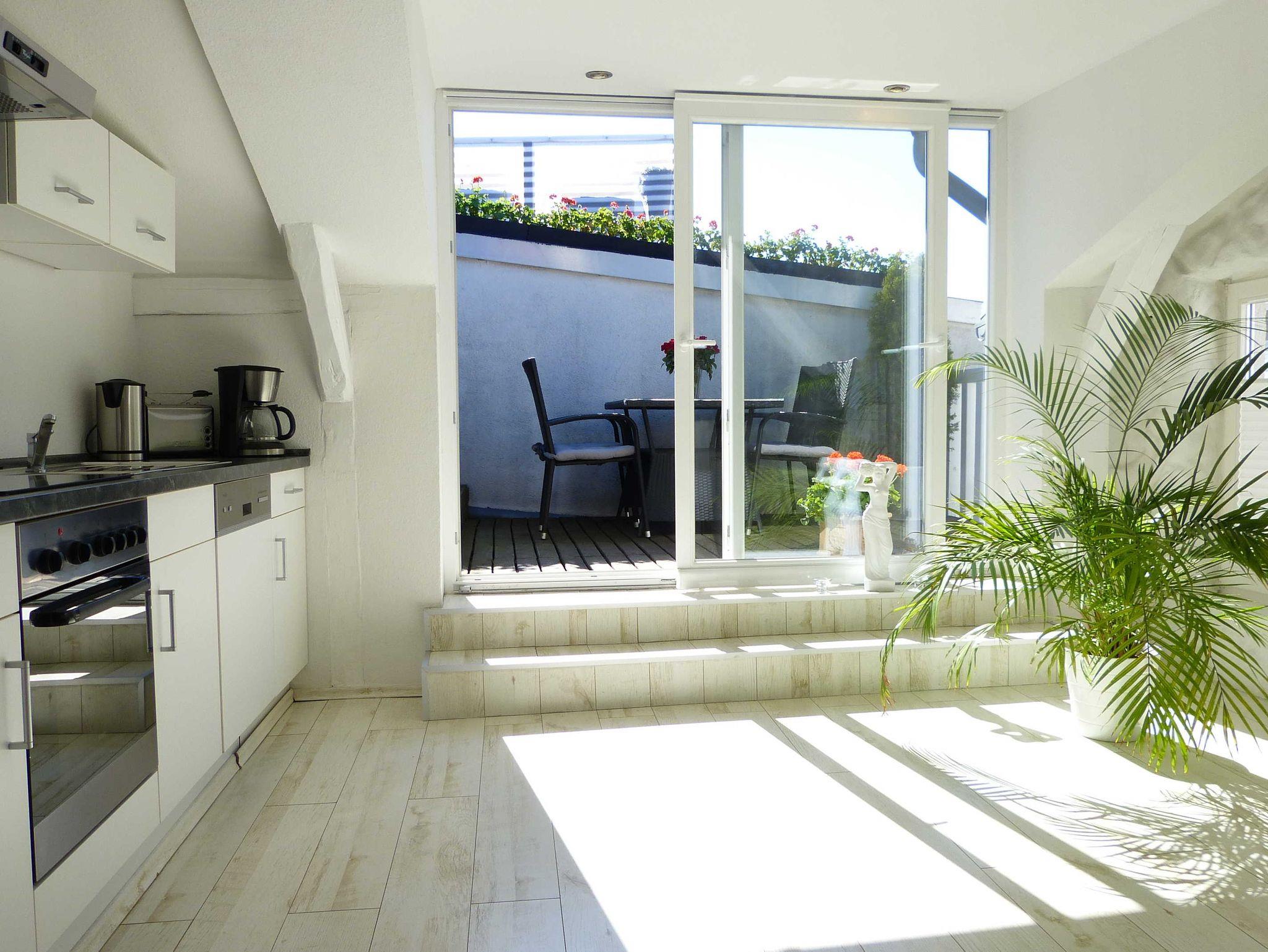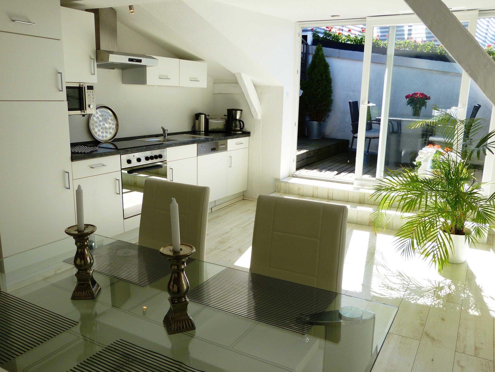 Das Bad ist ein Vollbad mit Dusche und Badewanne. Die Küche ist komplett ausgestattet. Auf der Terrasse können sich bis zu 4 Personen aufhalten.