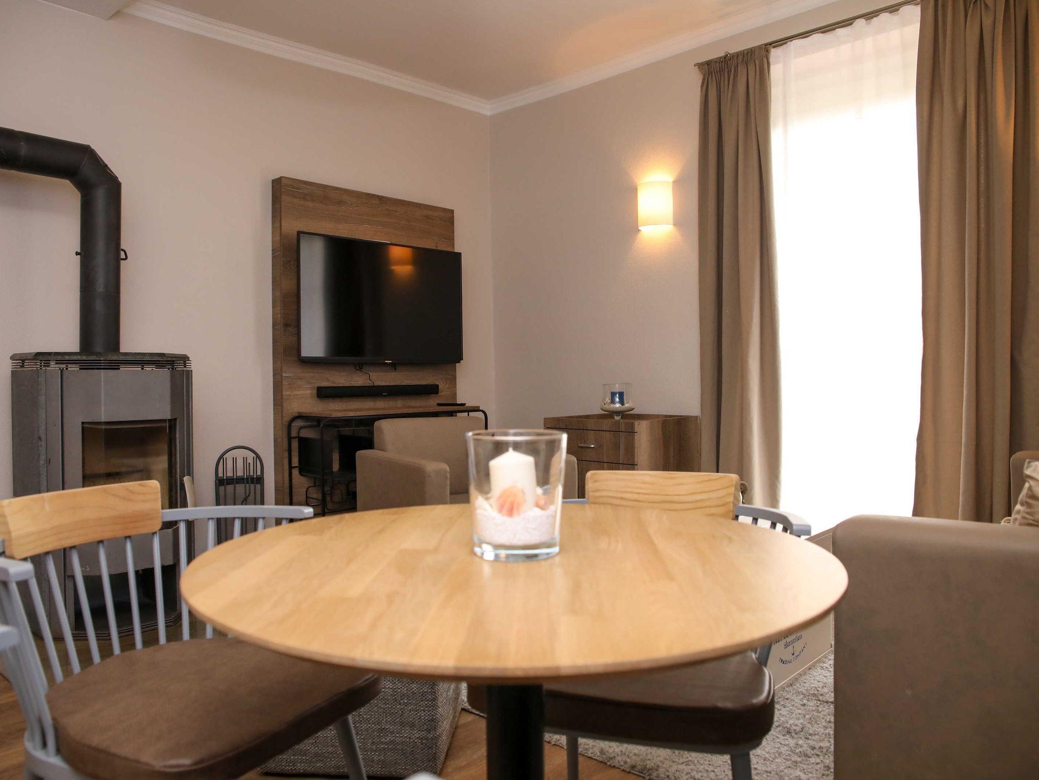 Im Wohn- und Essbereich befindet sich ein Doppelschlafsofa und eine hochwertig ausgestattete Einbauküche. Zusätzlich verzaubert ein Kamin Ihre gemütlichen Abende mit einer wohltuenden Wärme. Wohn -und Schlafzimmer verfügen jeweils über Flachbildfernseher.
