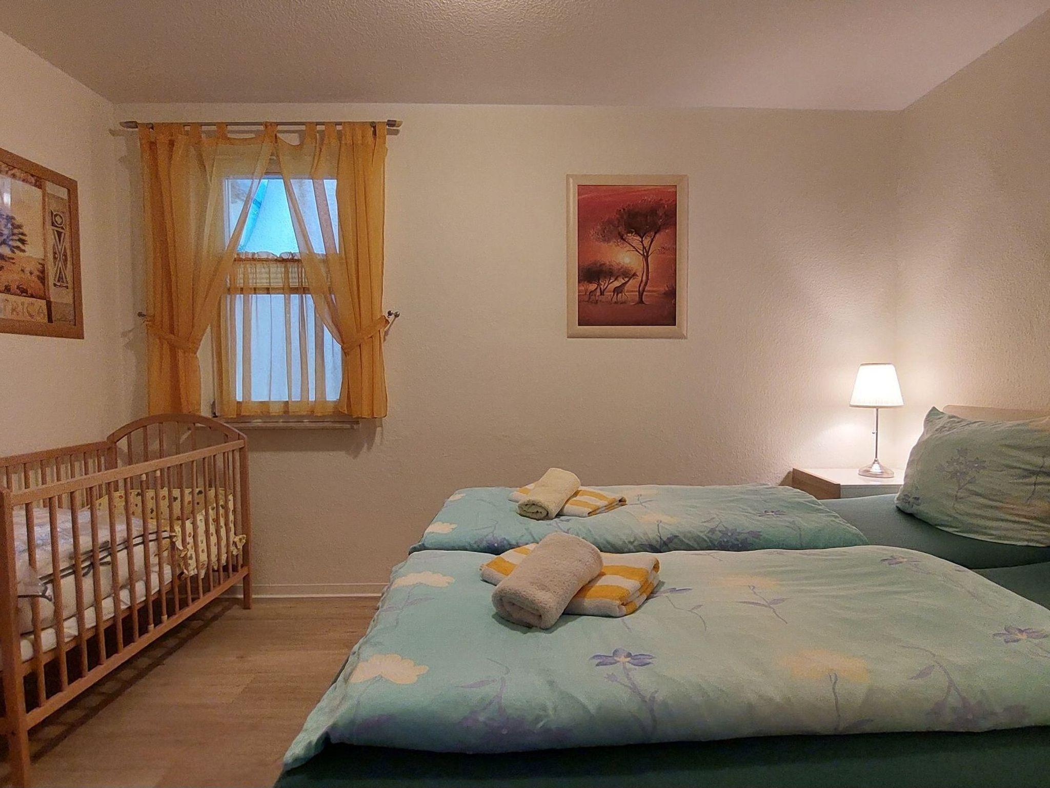 · 2. Schlafzimmer: Hier finden Sie ein komfortables Boxspringbett (1,60 m breit), sowie ein Kinderbett für die Kleinsten, geeignet für Kinder bis ca. 2 Jahre.