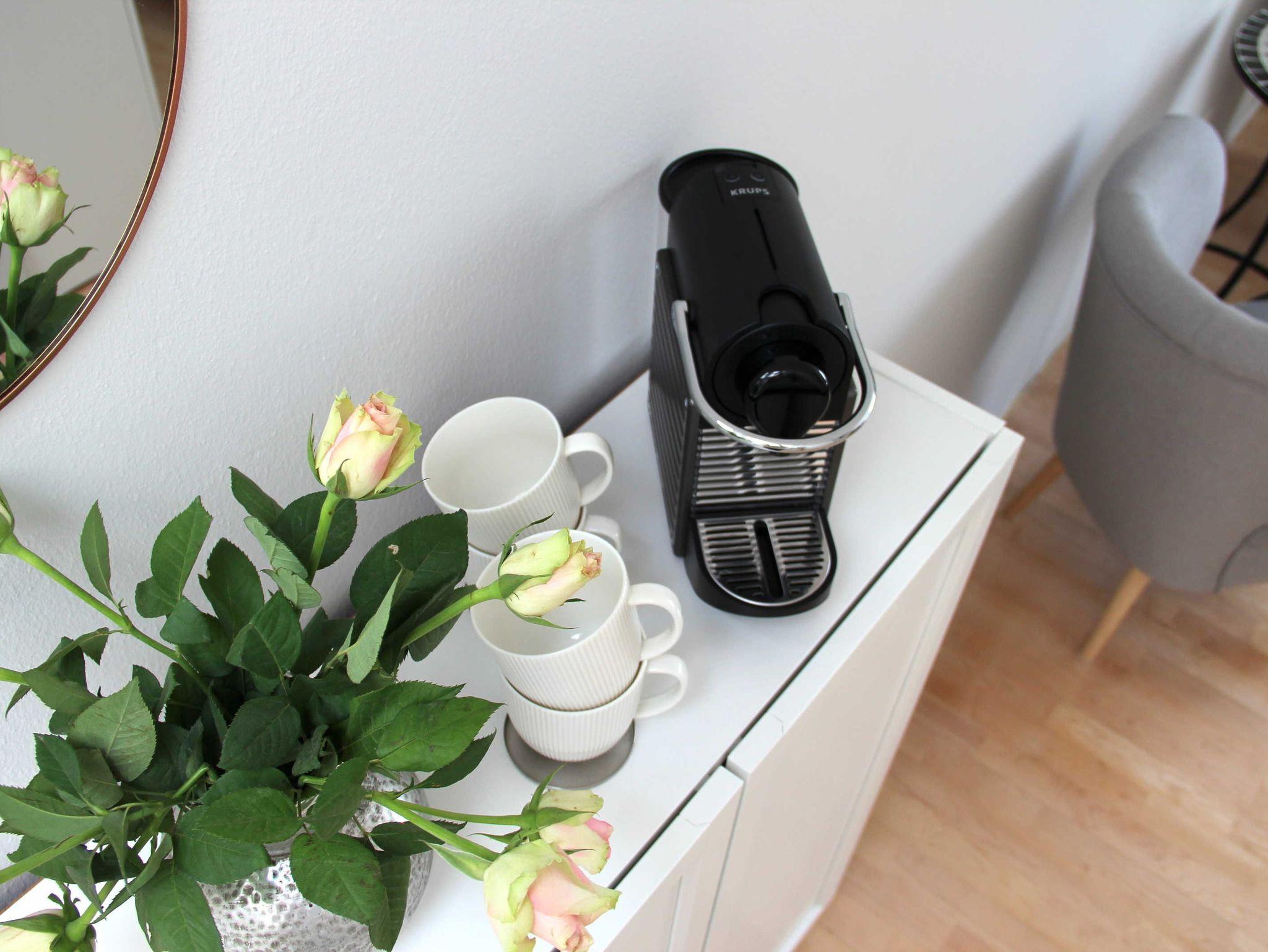 Doppelbett mit Bettwäsche, Pantry - Küche mit kleinem Kühlschrank & Herd, Bad mit Dusche/WC, Fön und Handtüchern. Es gibt einen Smart TV und WLan. Die Pantry-Küche ist mit Geschirr, Besteck, Gläsern, einer Nespressomaschine und einer Filterkaffeemaschine, einem Toaster, Wasserkocher und anderen Gebrauchsgegenständen ausgestattet.