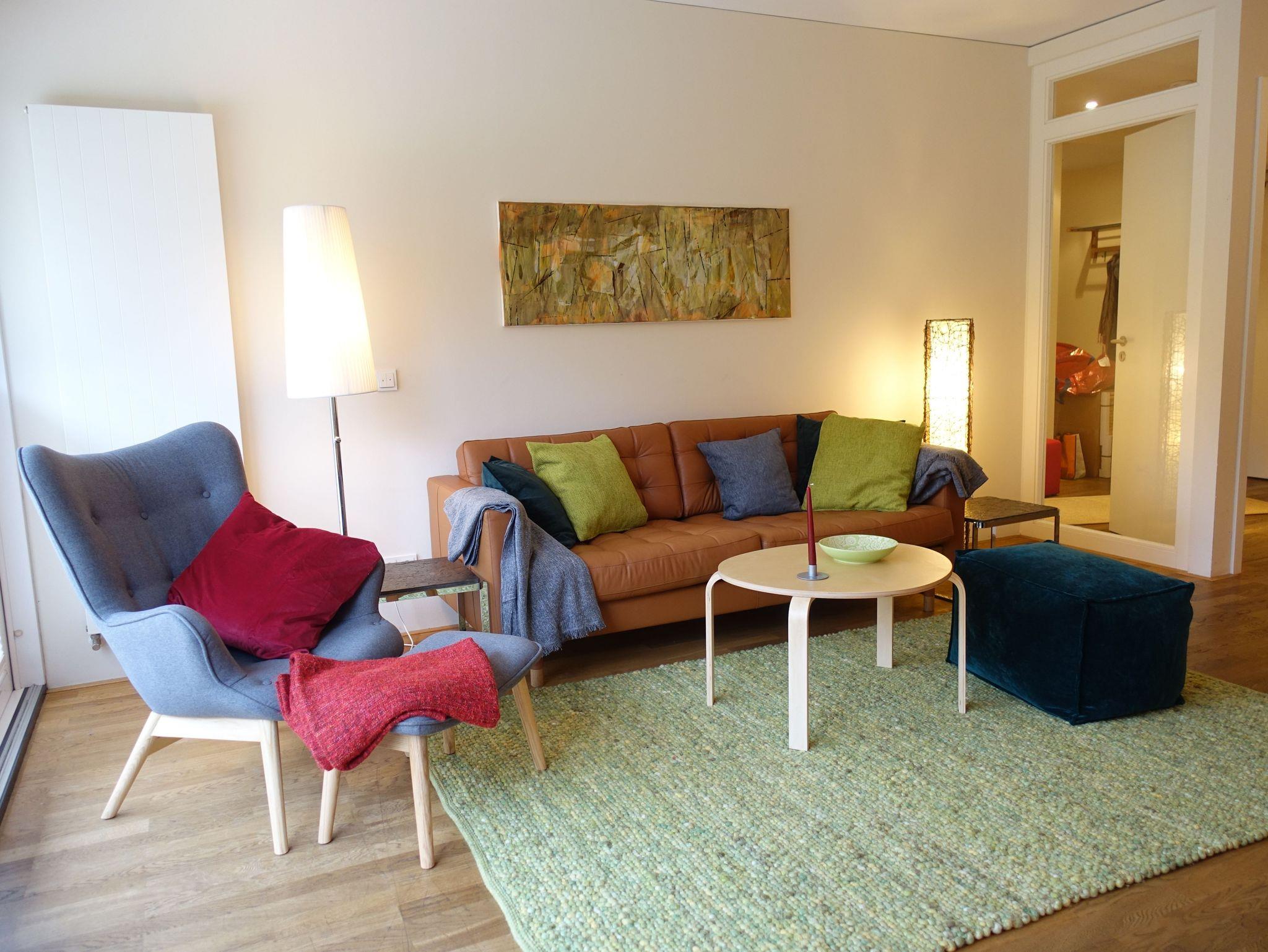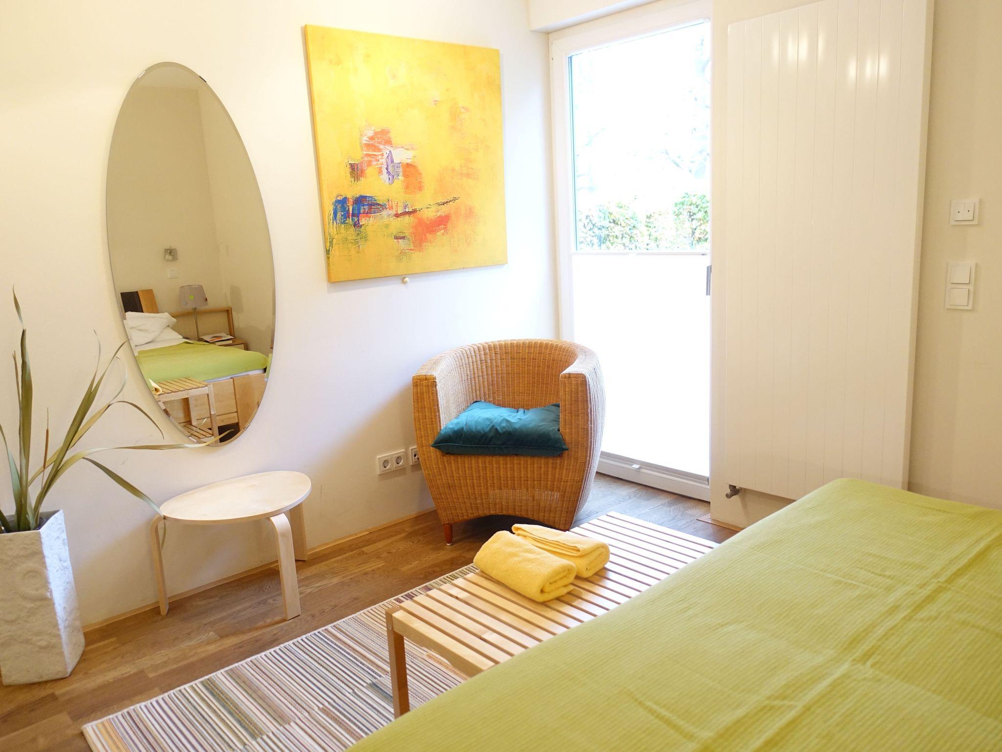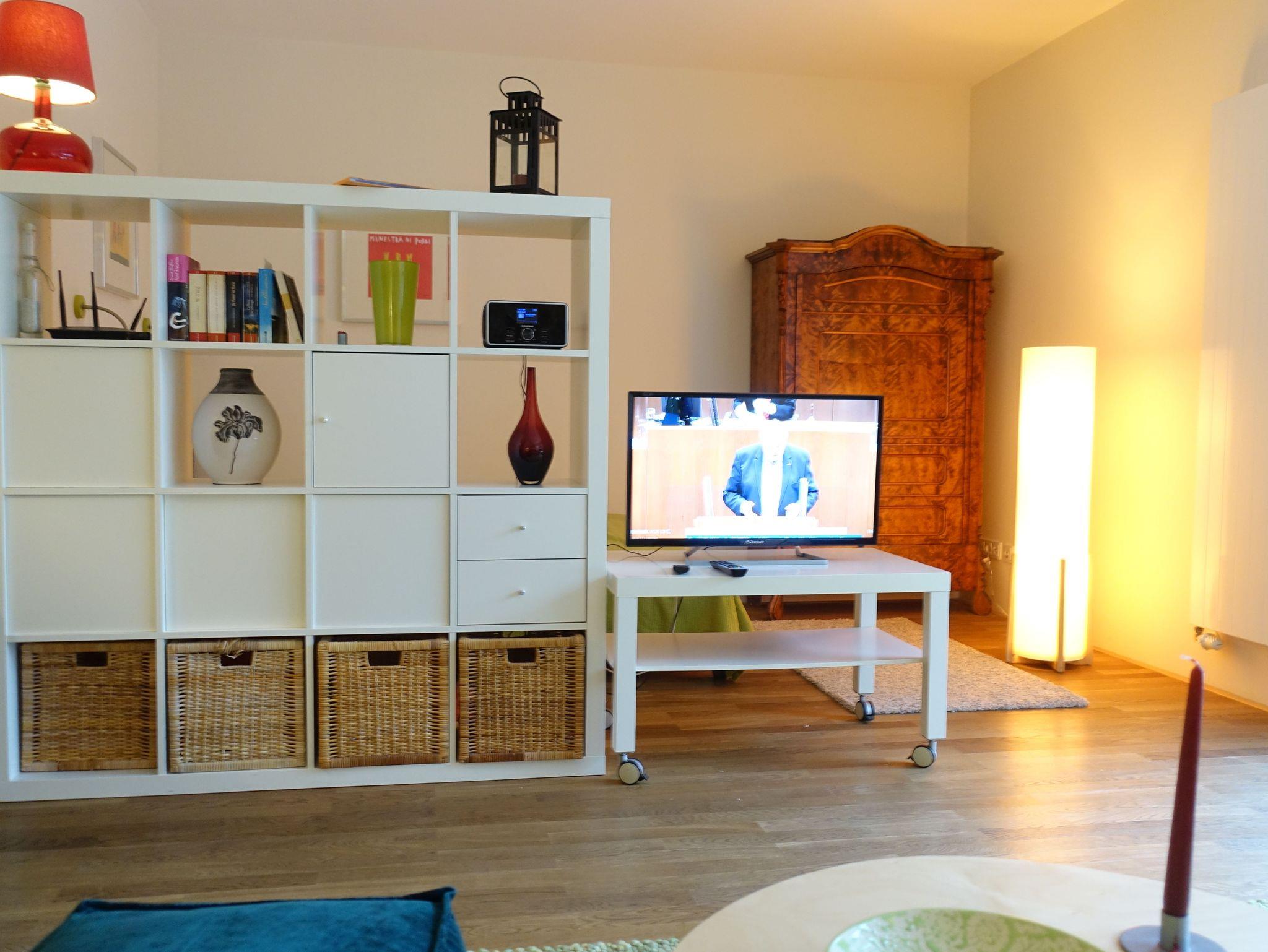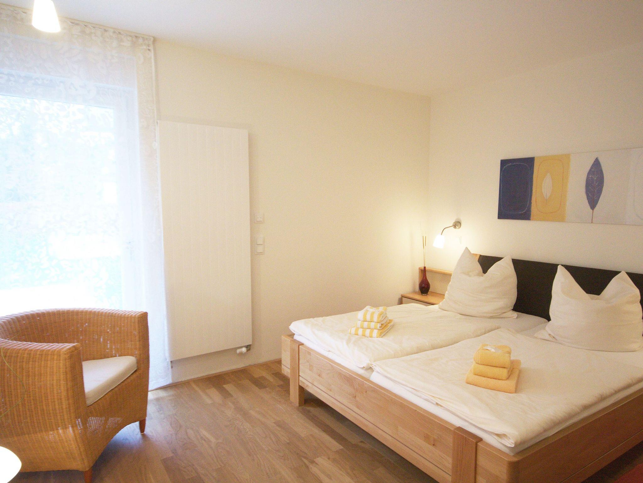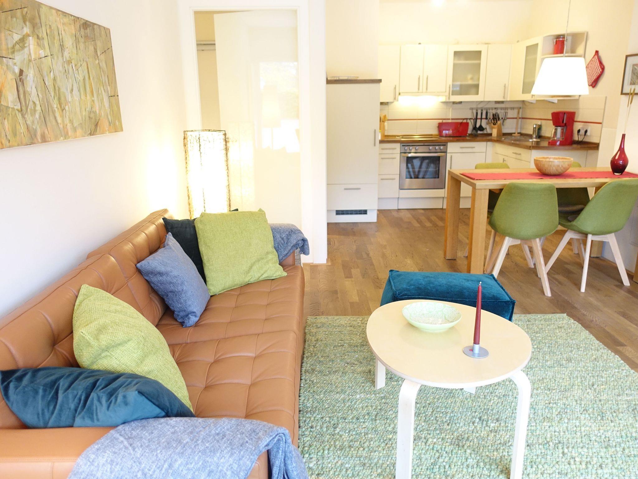 Neben dem großen Doppelschlafzimmer mit Ausgang zur Terrasse befindet sich ein großzügiger Wohn/Ess- und Schlafbereich. Der Schlafbereich ist optisch abgetrennt und mit einem Schrank und Doppelbett eingerichtet. Bodentiefe Fenster geben den Blick zum Kurpark frei. Die Küche ist mit allem Komfort ausgestattet und zum Wohnraum hin offen, so das ein schönes Raumgefühl entsteht.