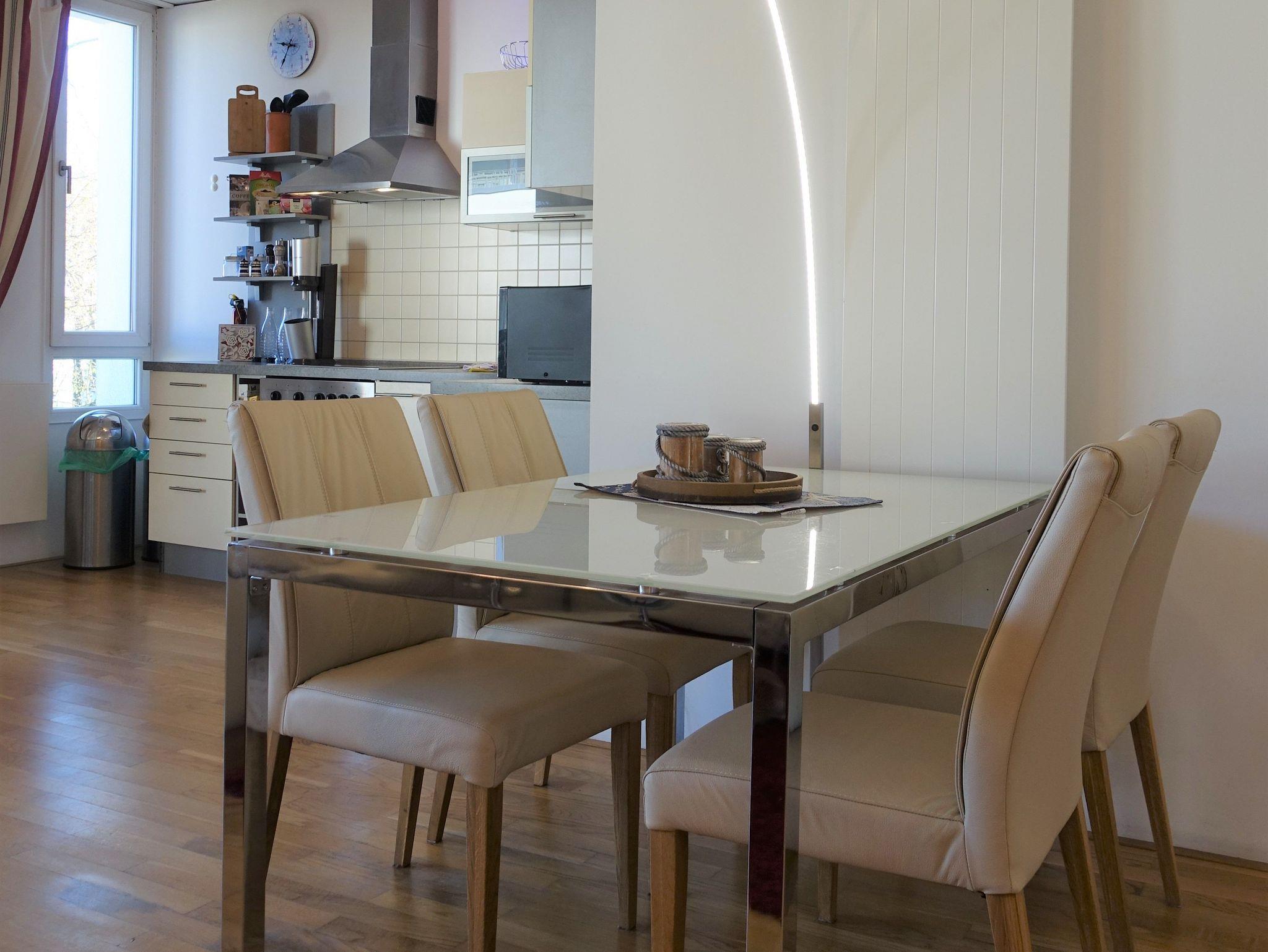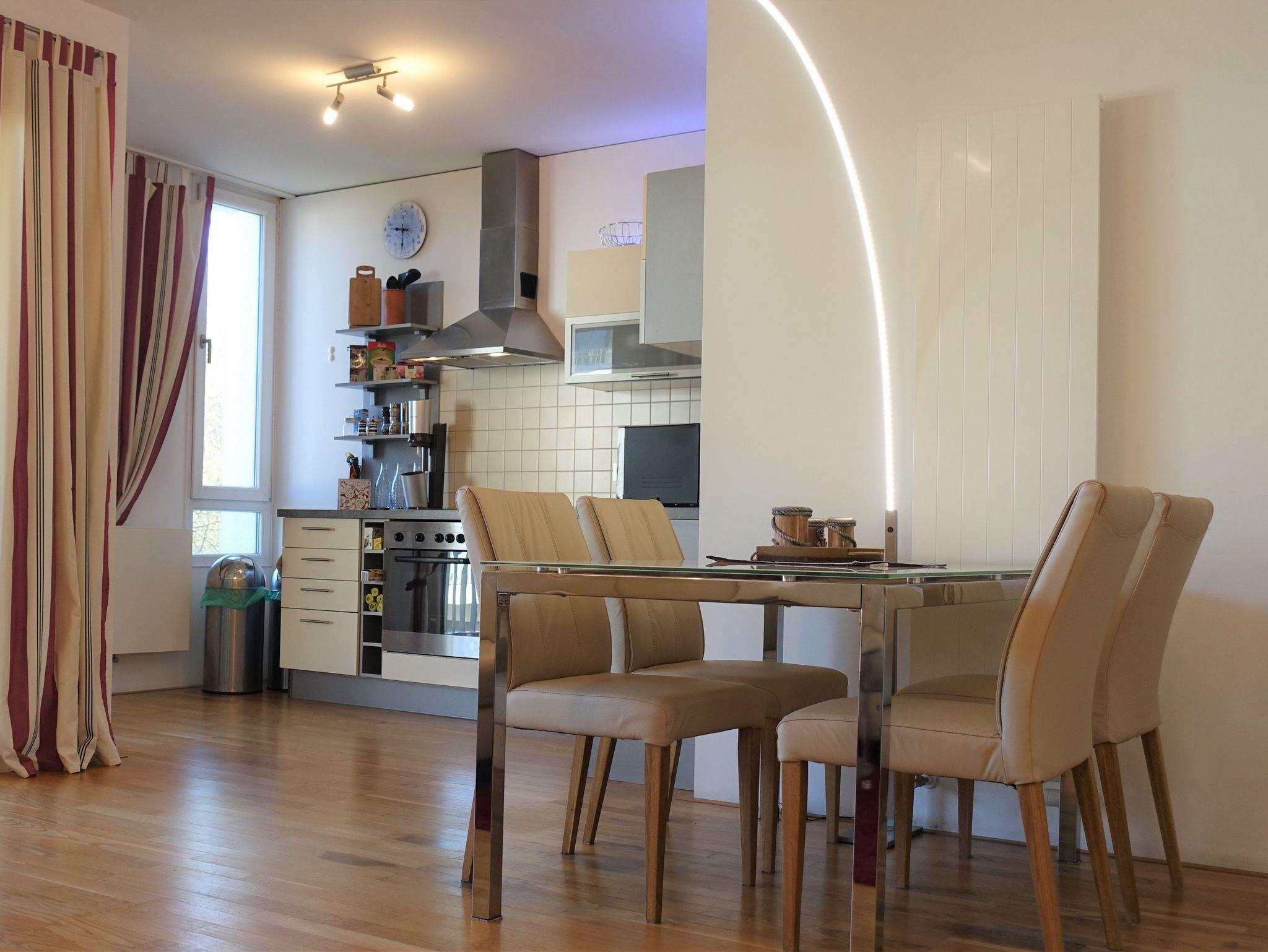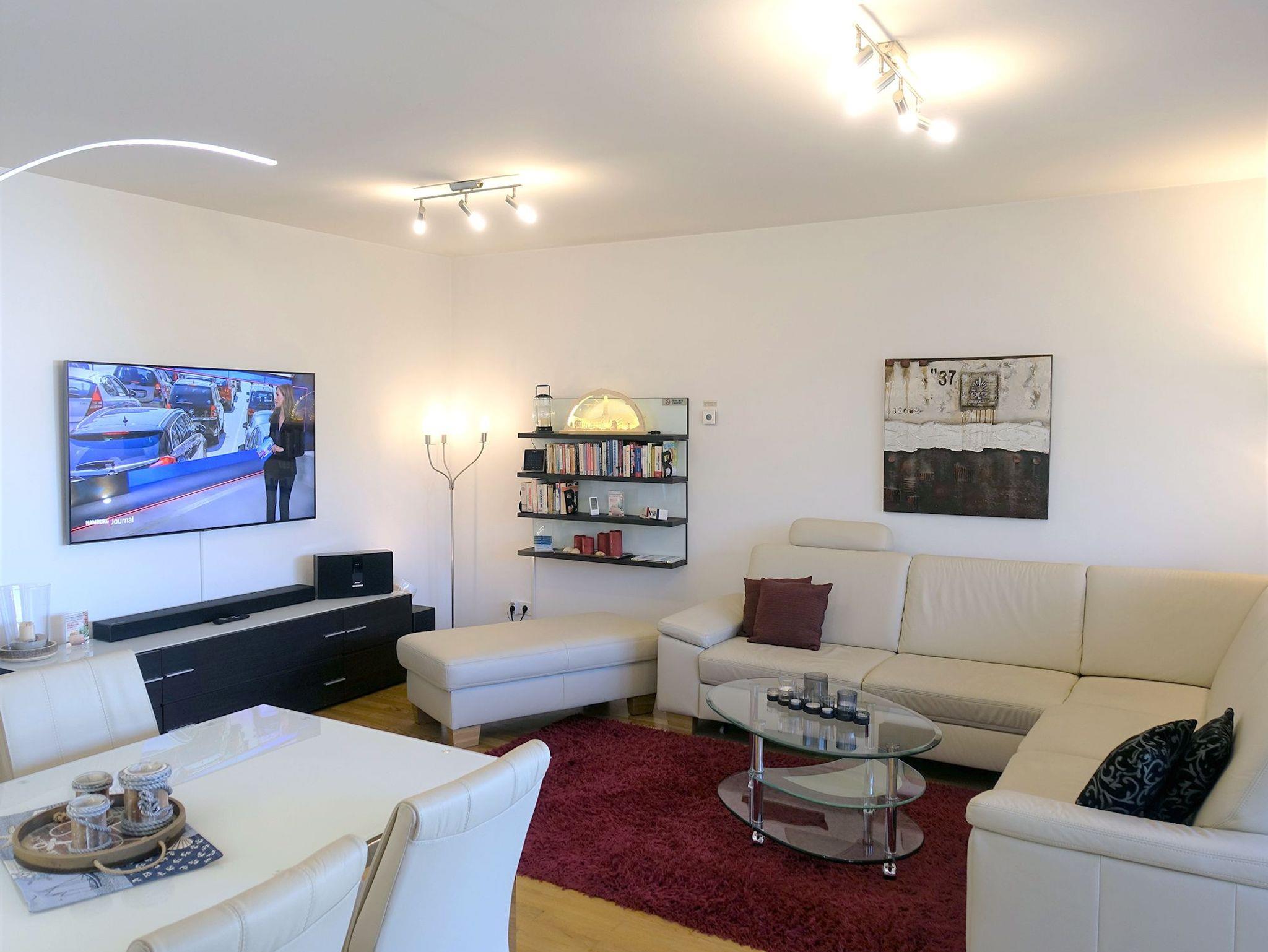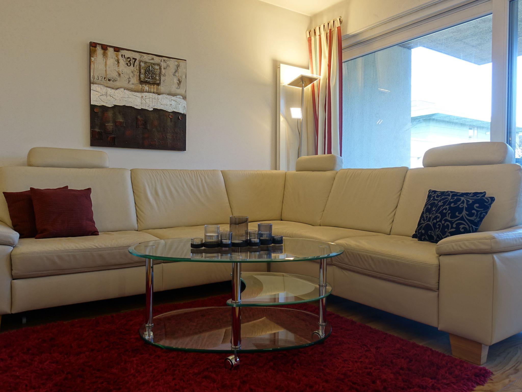 Die Ferienwohnung befindet sich im 2. Stock. Eine große Balkonterrasse und der grüne Garten vor der Residenz sind durch bodentiefe Fenster zu sehen. Sie können die schöne Atmosphäre dieser Wohnung genießen.
