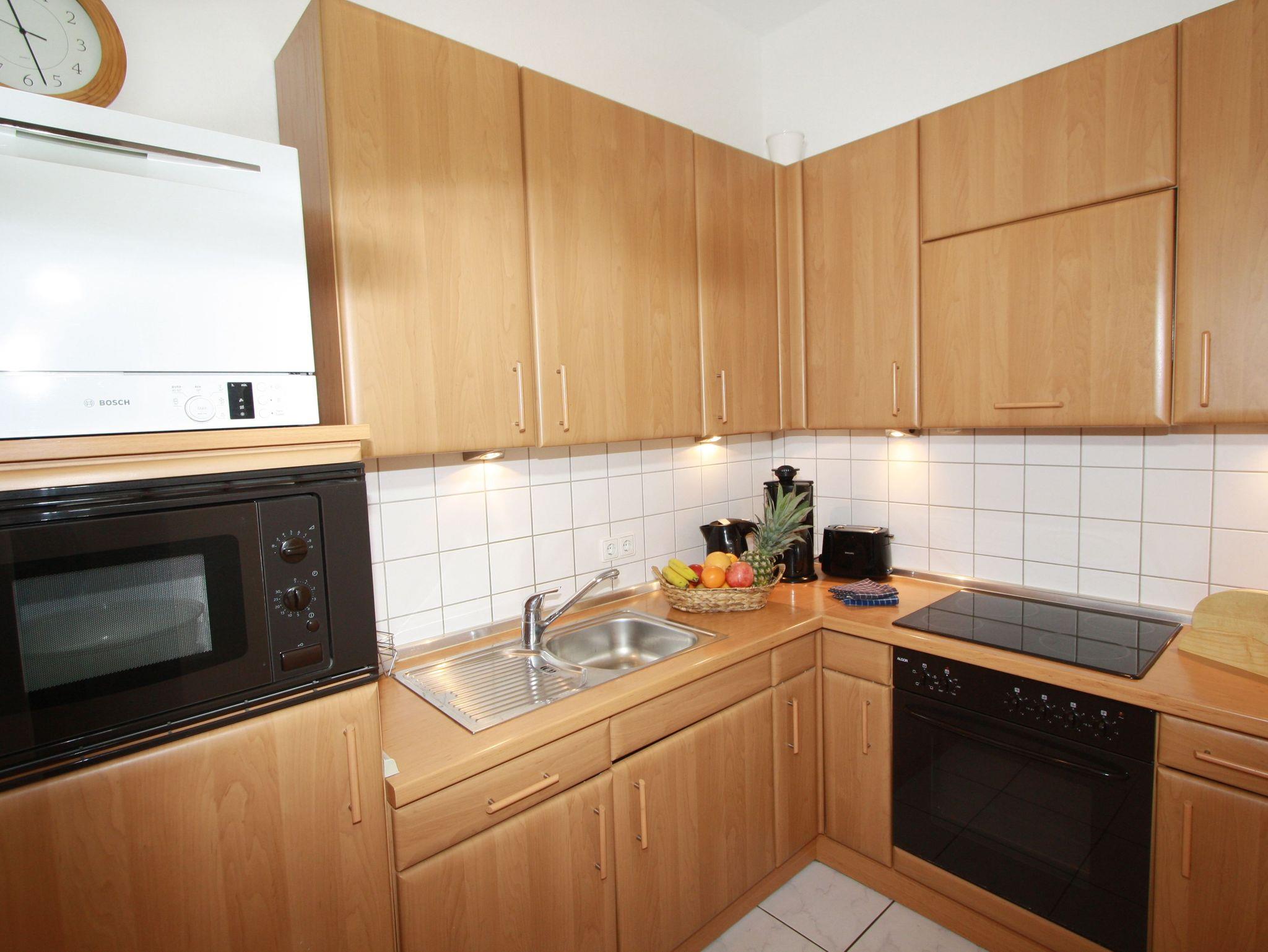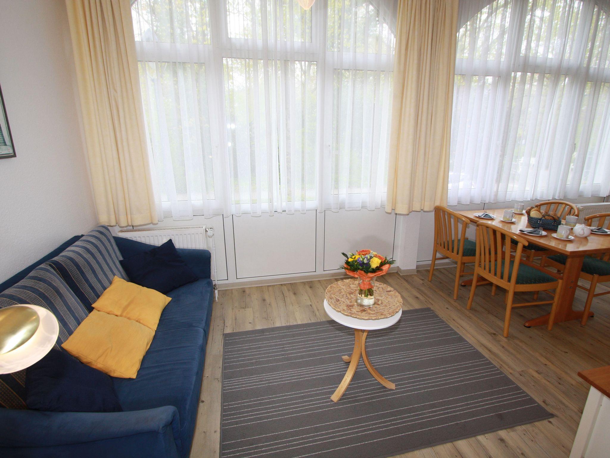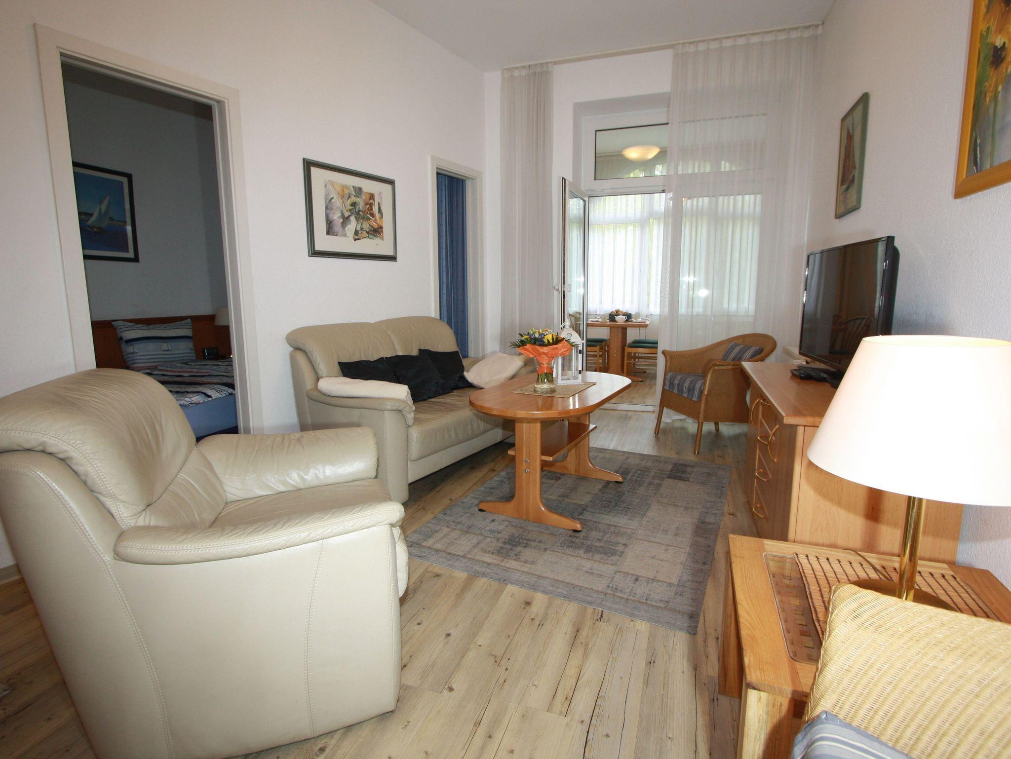 Sie wohnen in einem 2-Zimmer-Appartement für bis zu 4 Personen auf 58 m² Wohnfläche im Erdgeschoss (Hochparterre). Ein Schlafzimmer mit Doppelbett, ein Wohnraum mit bequemer Ledergarnitur, großzügiger Wintergarten mit bequemer Doppelbettcouch und separatem Essplatz mit Blick in den Kurpark, voll ausgestatteter Küchenbereich mit Mikrowelle, Geschirrspüler und E-Herd mit Backofen und Cerankochfeld.