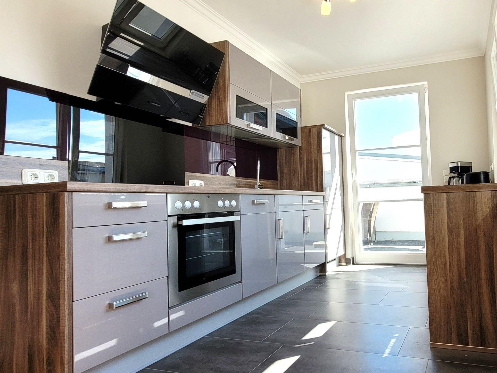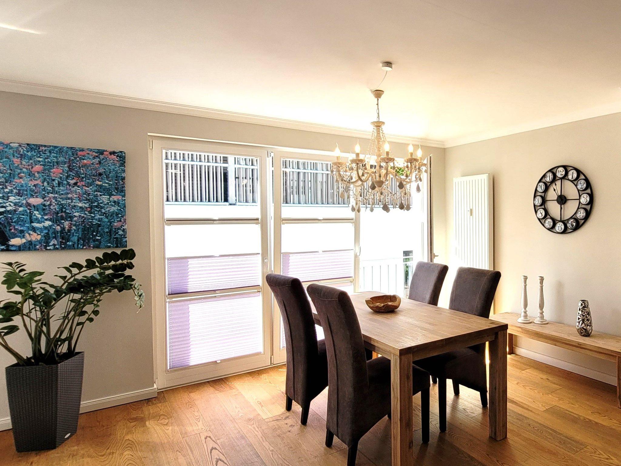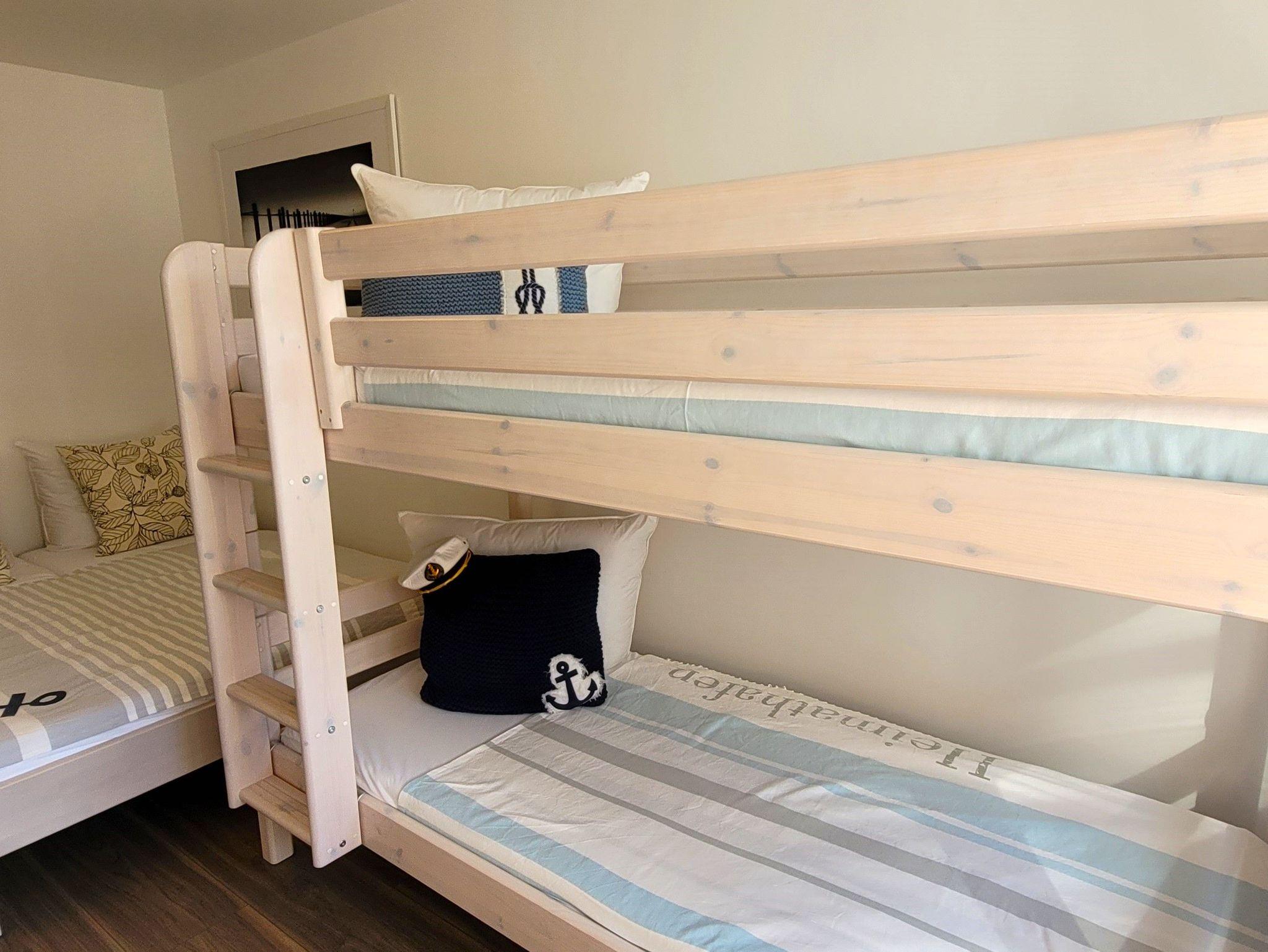 Es gibt ein großes Wohnzimmer mit 2 Sofas, ein Schlafzimmer mit Doppelbett und Etagenbett, ein Vollbad, ein gäste-WC und ein sehr gut eingerichtete Küche mit Geschirrspülmaschine. Ein Tiefgaragenplatz gegen Bezahlung ist vorhanden.