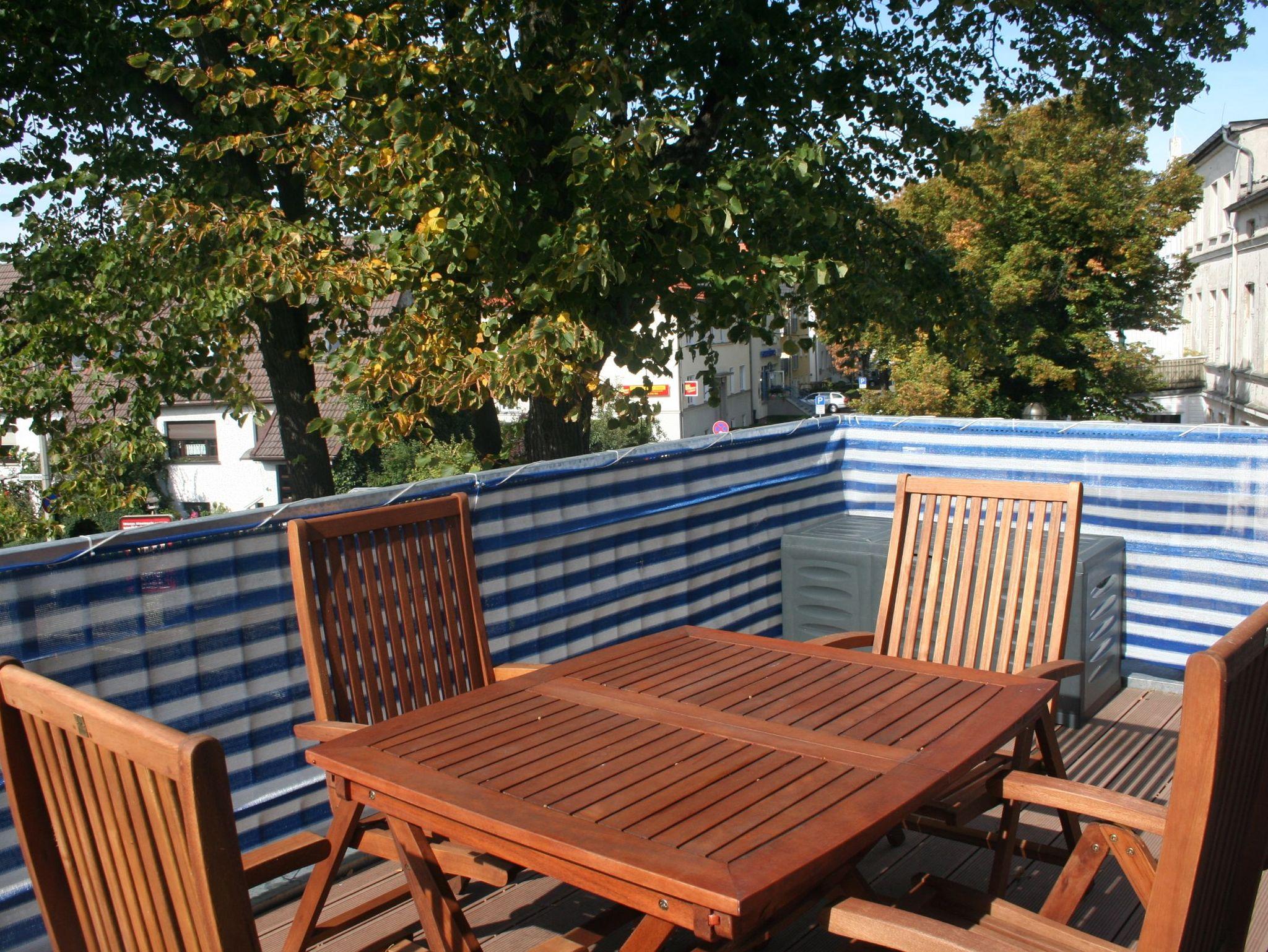 Helle 2 Zimmer Ferienwohnung für bis zu 4 Personen mit großem Balkon und Internet. Sie hat einen Wohn / Essraum mit Küchenzeile. urch die bodentiefe Fenstertür gelangen Sie auf die große möblierte Terrasse. Eine restaurierte Schiebetür trennt das Wohnzimmer vom modernen Schlafzimmer. Die Bäder sind hell, modern und mit Fußbodenheizung ausgestattet.