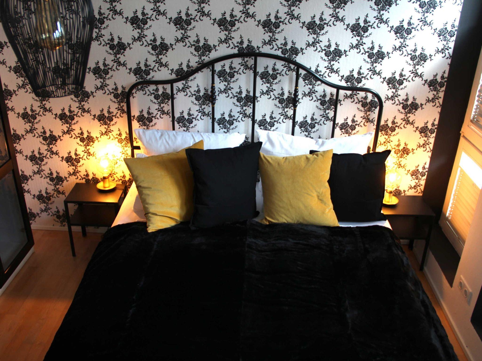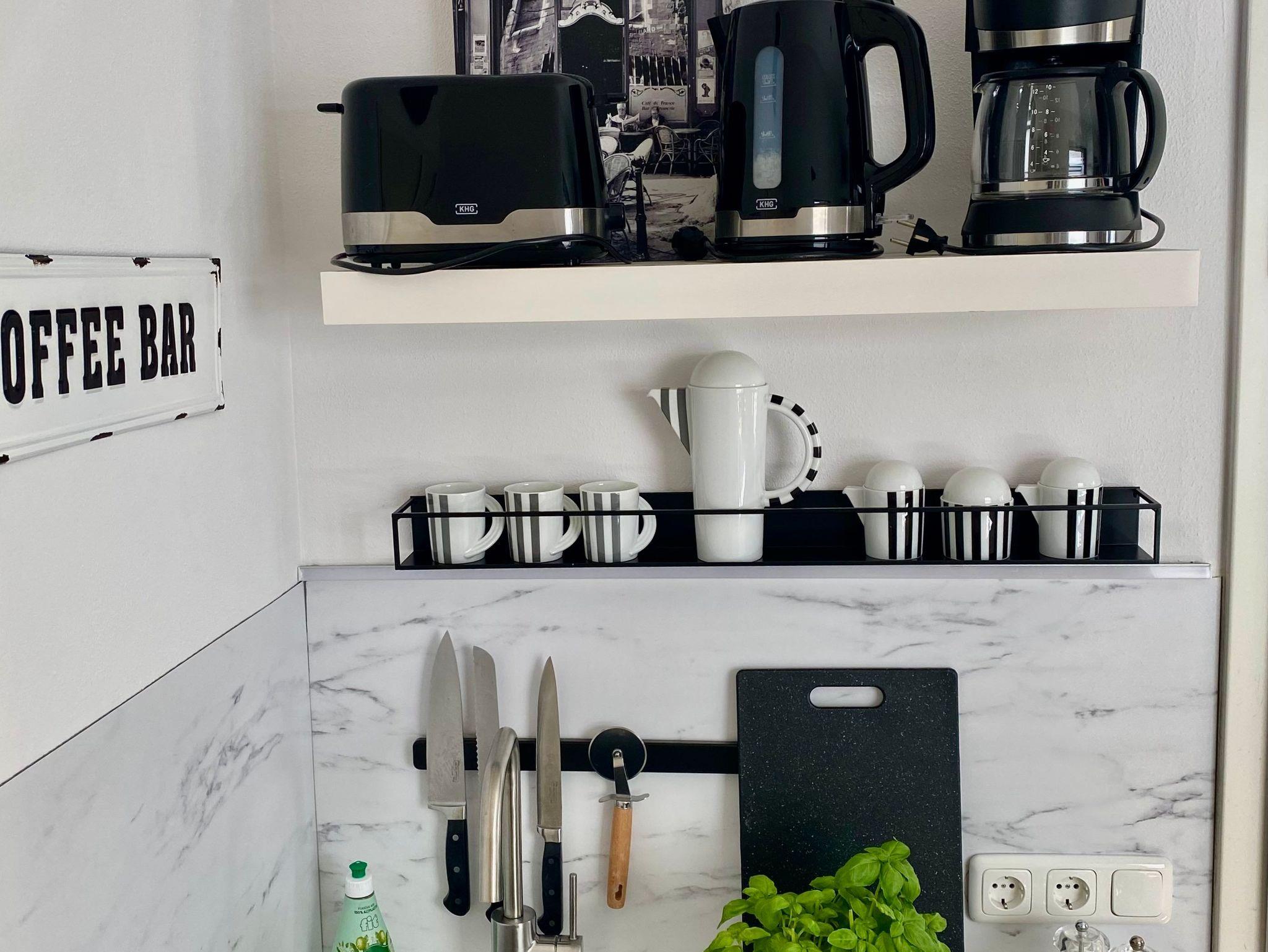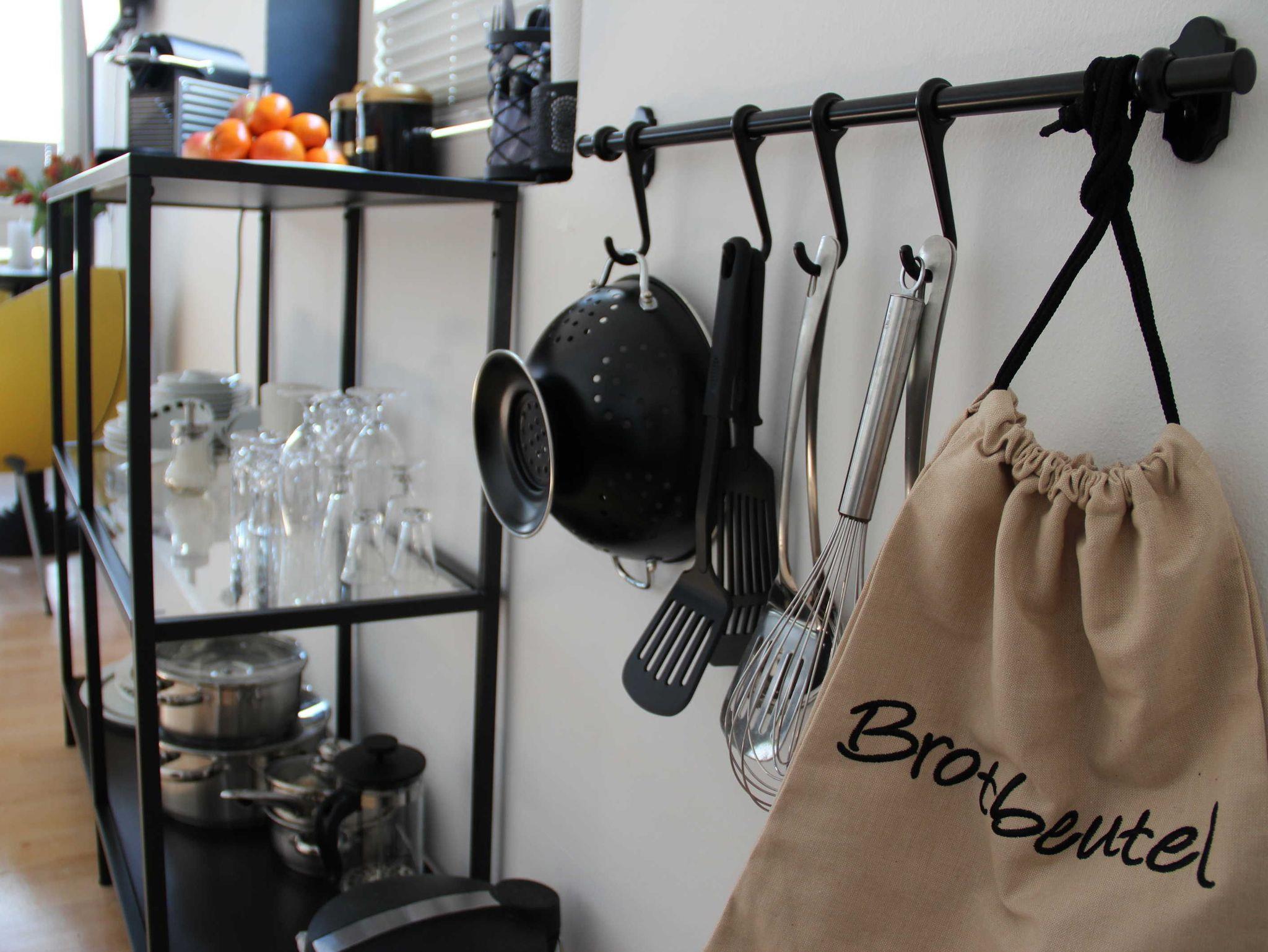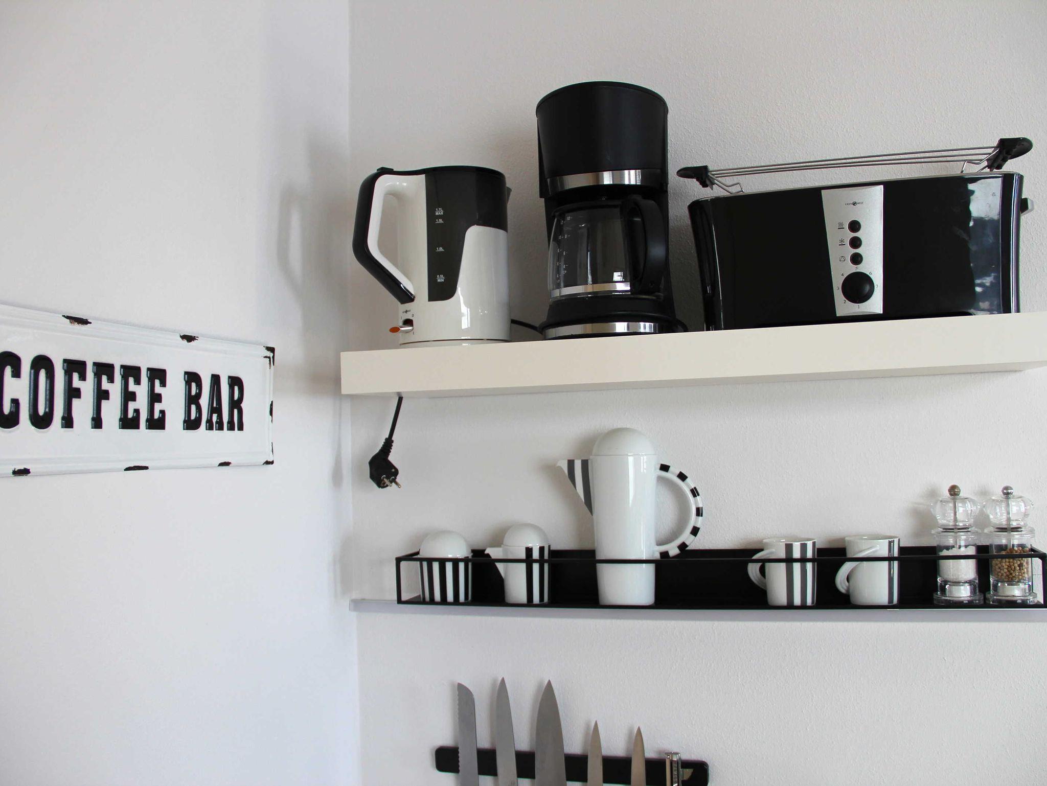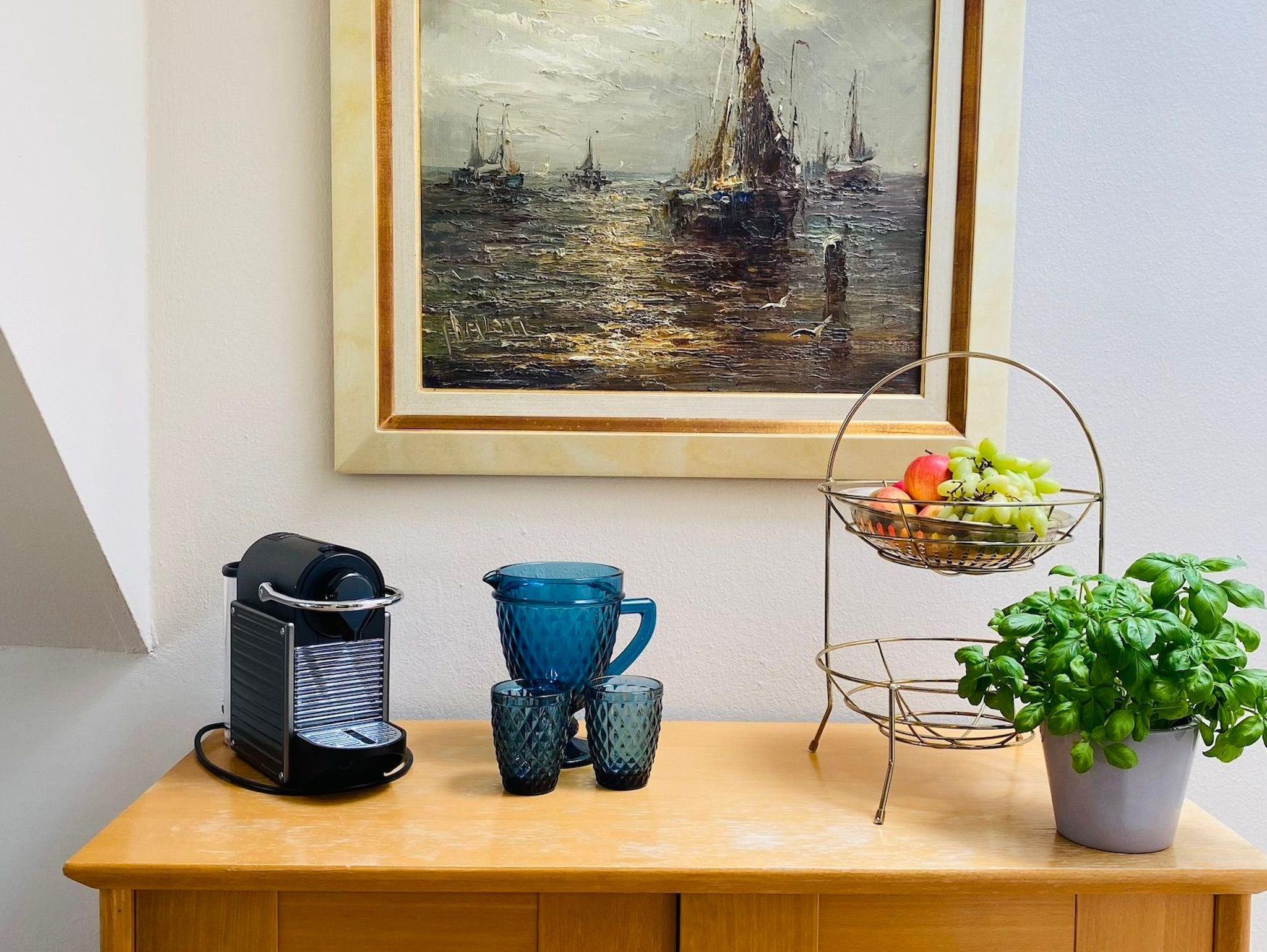 Doppelbett, Bettwäsche, Pantry Küche mit Kühlschrank & Herd, Duschbad mit Fön & Handtüchern, Smart - TV und Internet. Die Pantryküche ist mit Geschirr, Gläsern, Besteck, Töpfen und einer Pfanne, einer Kaffeefilter- und einer Nespressomaschine, Toaster, Wasserkocher und anderen Gebrauchsgegenständen ausgestattet.