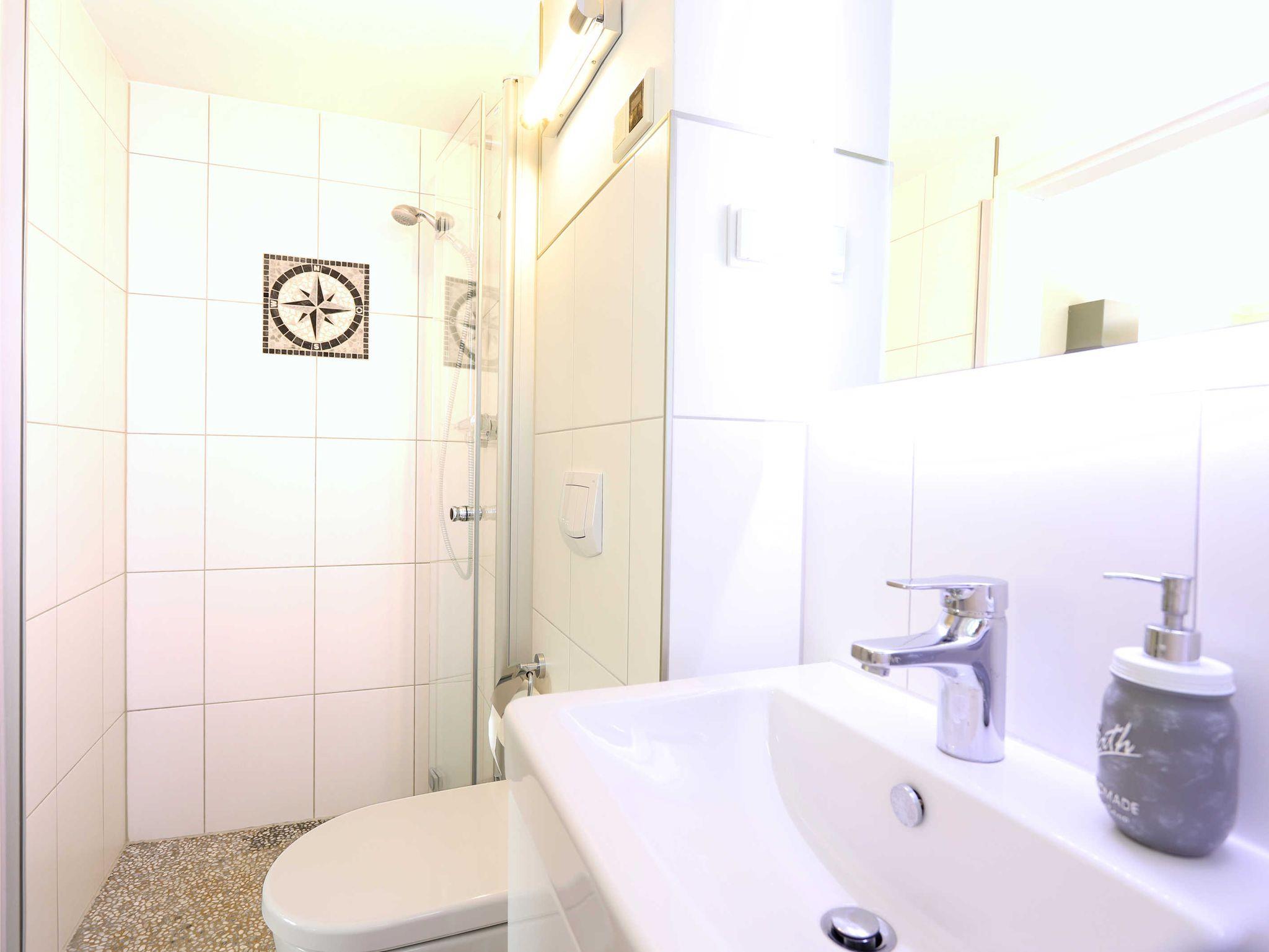 Das Bad mit moderner Ausstattung und Dusche. Bettwäsche/Handtücher und Geschirrhandtuch werden von uns gestellt. Das Trocknen von Badesachen etc. ist auf dem Hof möglich.