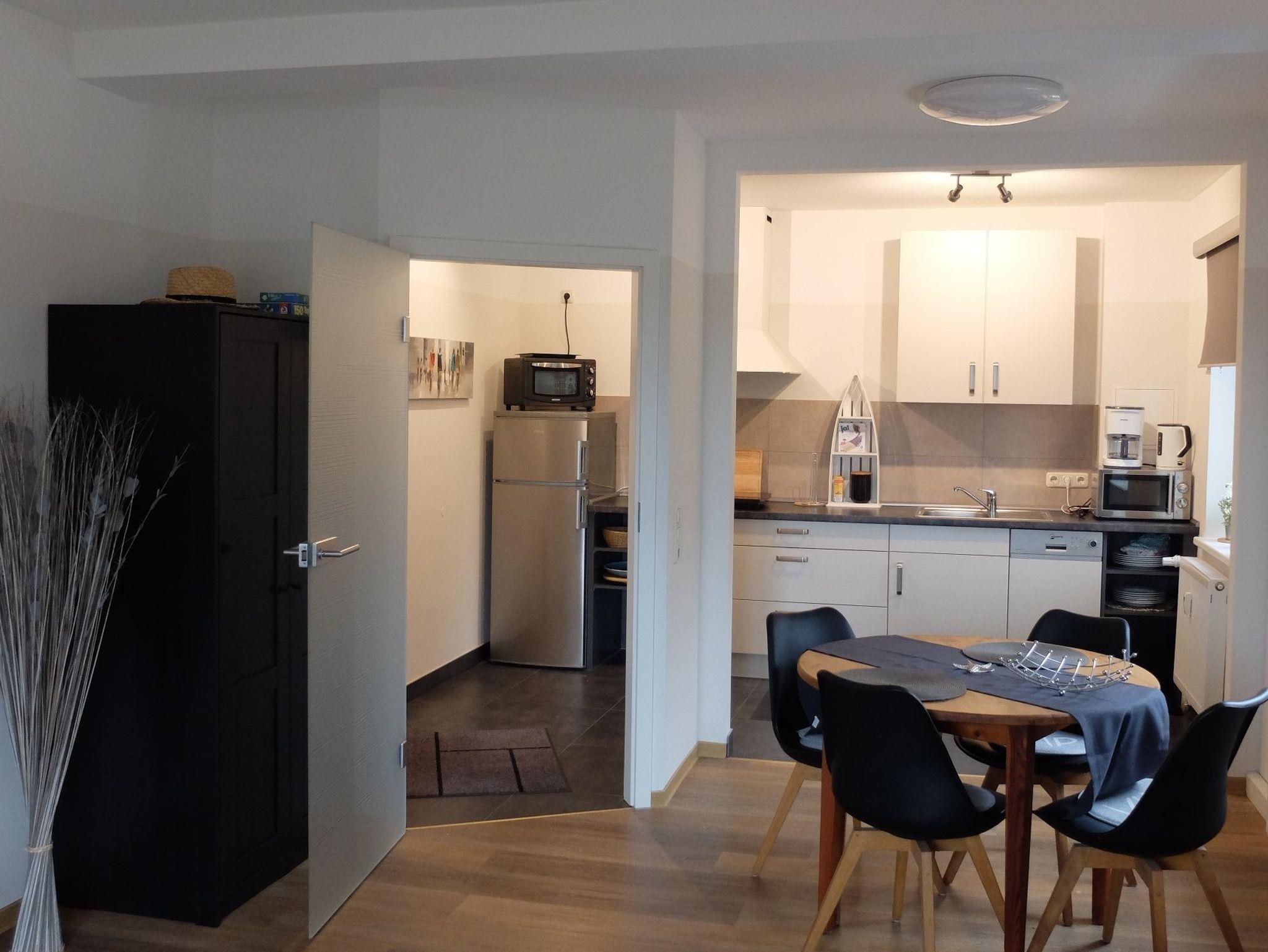 Die Fewo ist mit einer offenen Küche im Wohnbereich ausgestattet und bietet jeden Komfort für Frühstück und kleinere Mittagsgerichte. Minibackofen für Pizza und Brötchen. Spülmaschine und 2-Platten Induktionsherd sind integriert.