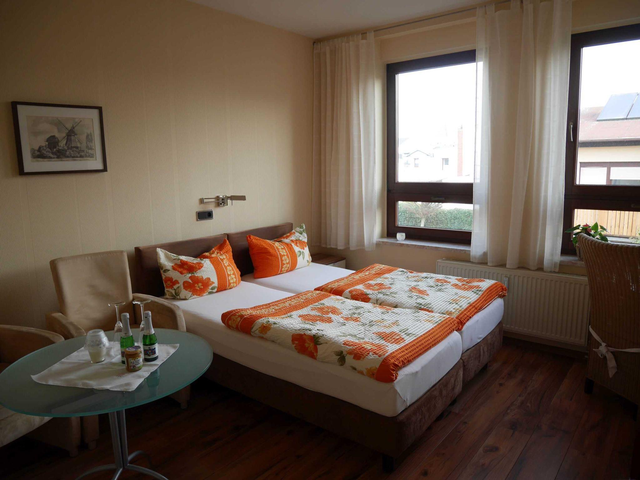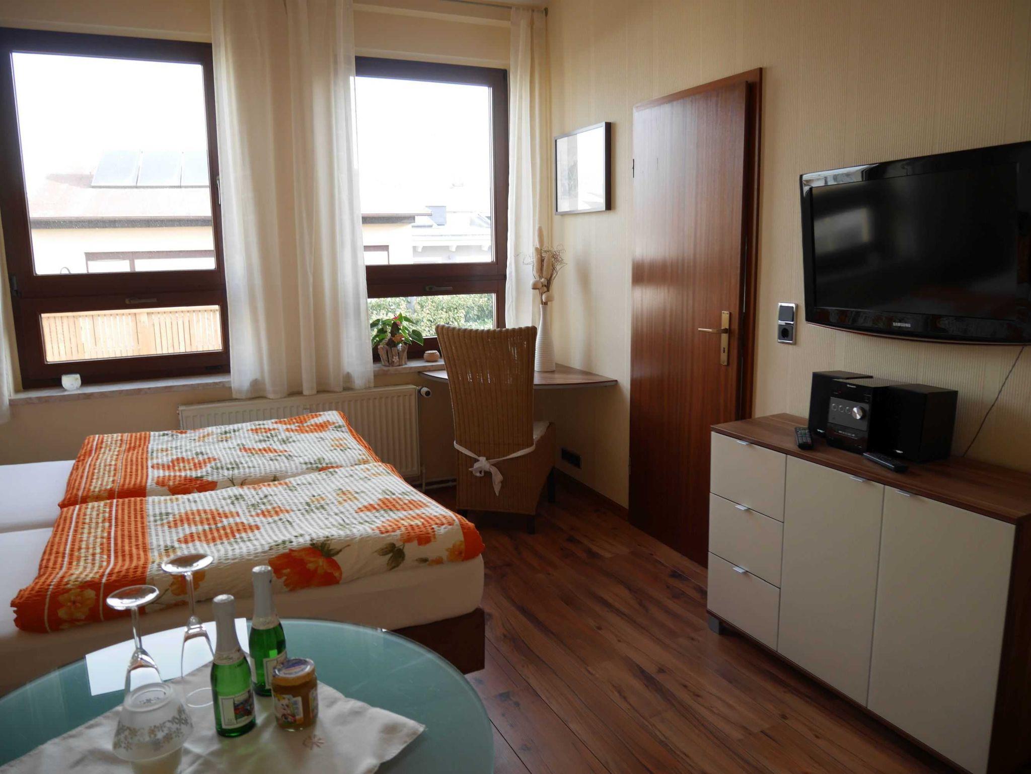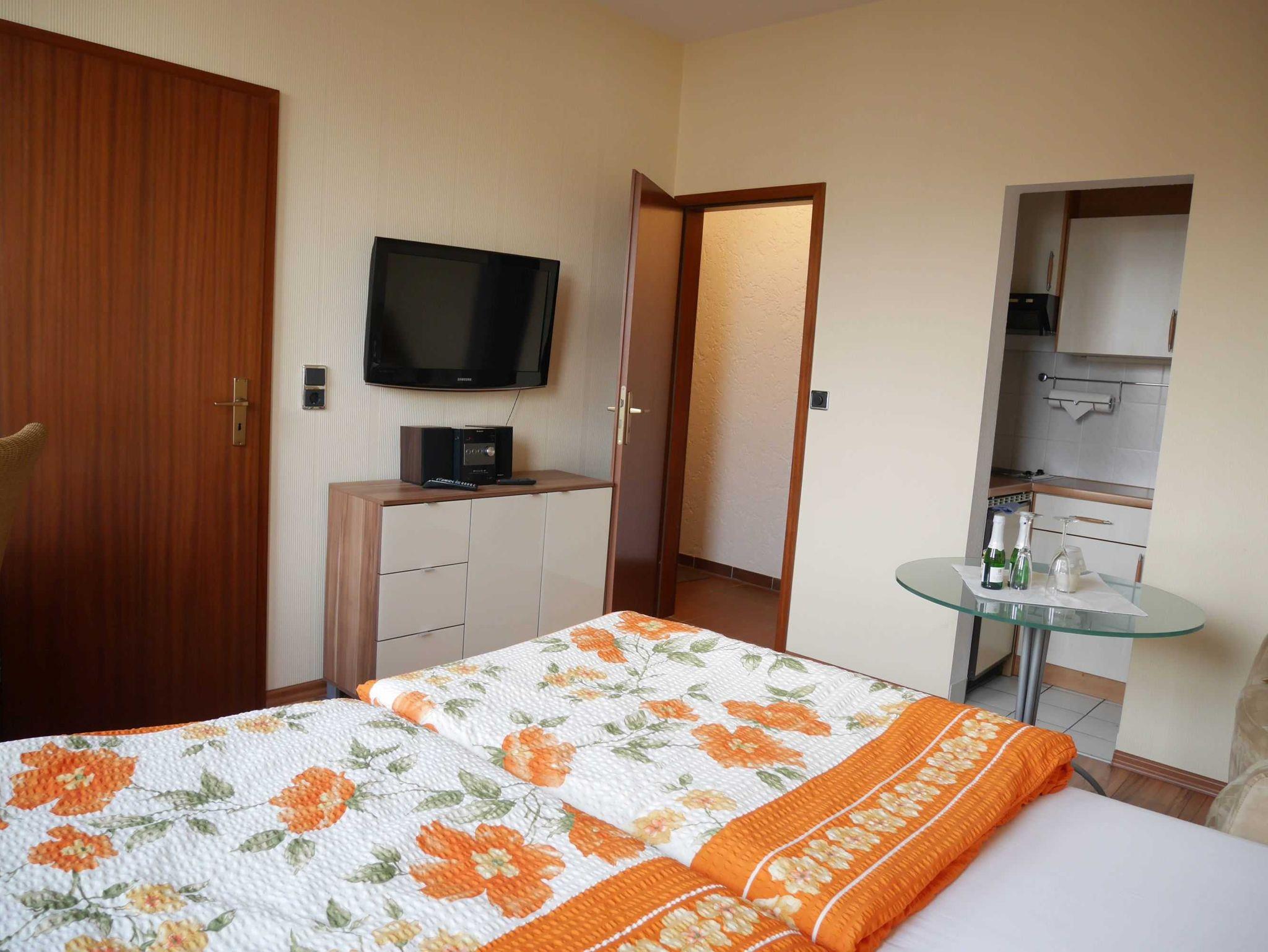 Der freundliche Wohn/Schlafraum des Apartements ist mit einem Boxspringdoppelbett (auch als Einzelbetten zu verwenden) in 4 Sterne Hotelqualität, einer kleinen Sesselsitzgruppe mit verstellbaren Rückenlehnen, einem Tisch, einem Arbeitsplatz, Nachtschrank, ein Sideboard und einem begehbaren Kleiderschrank ausgestattet.