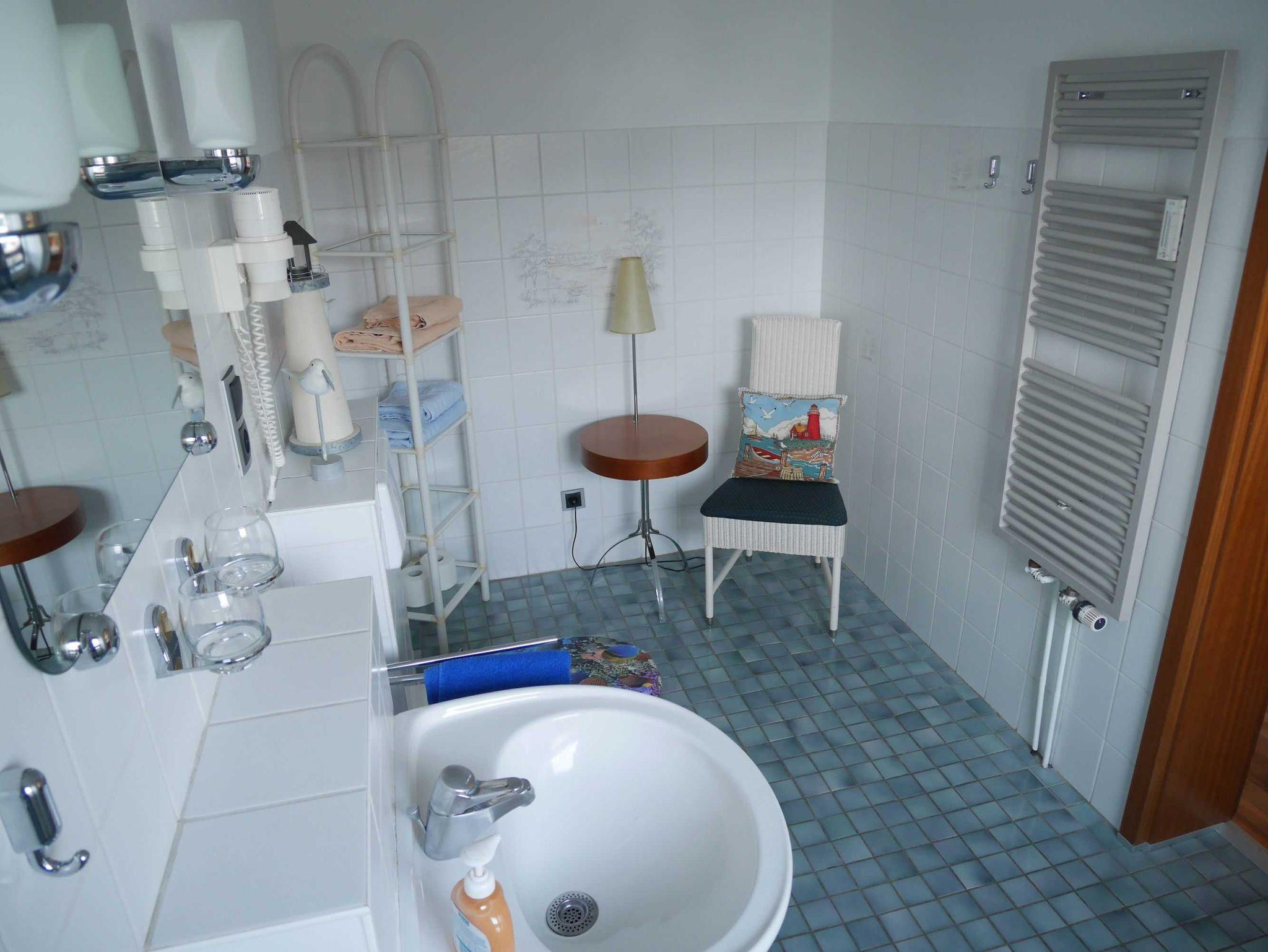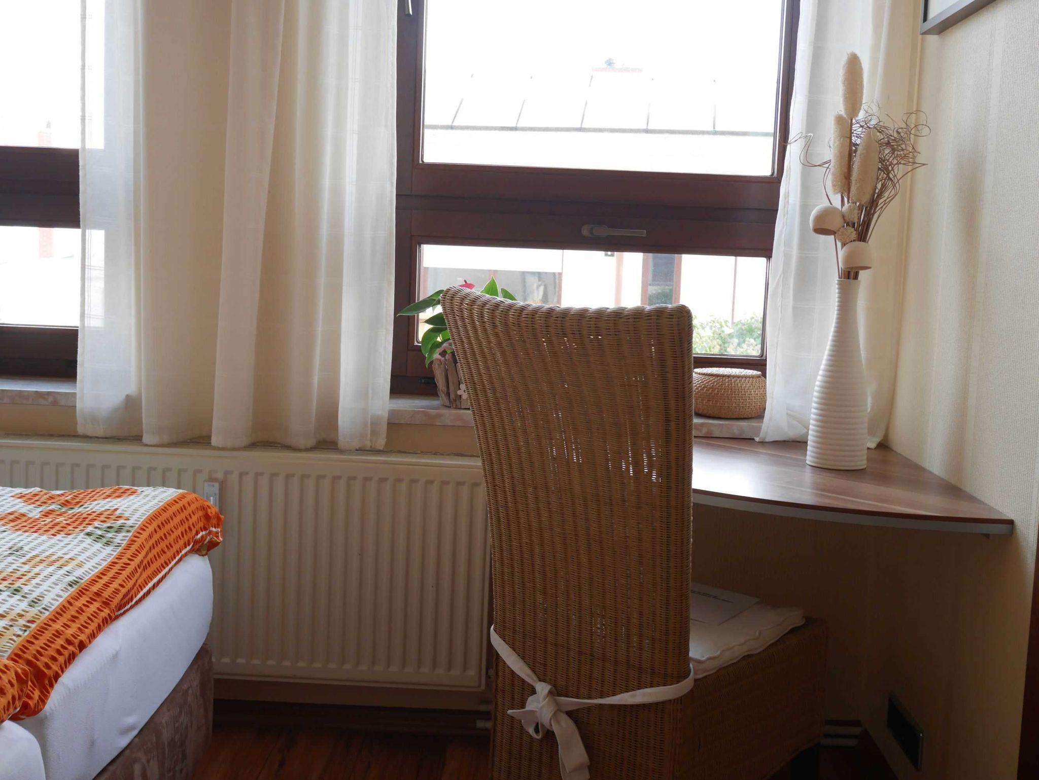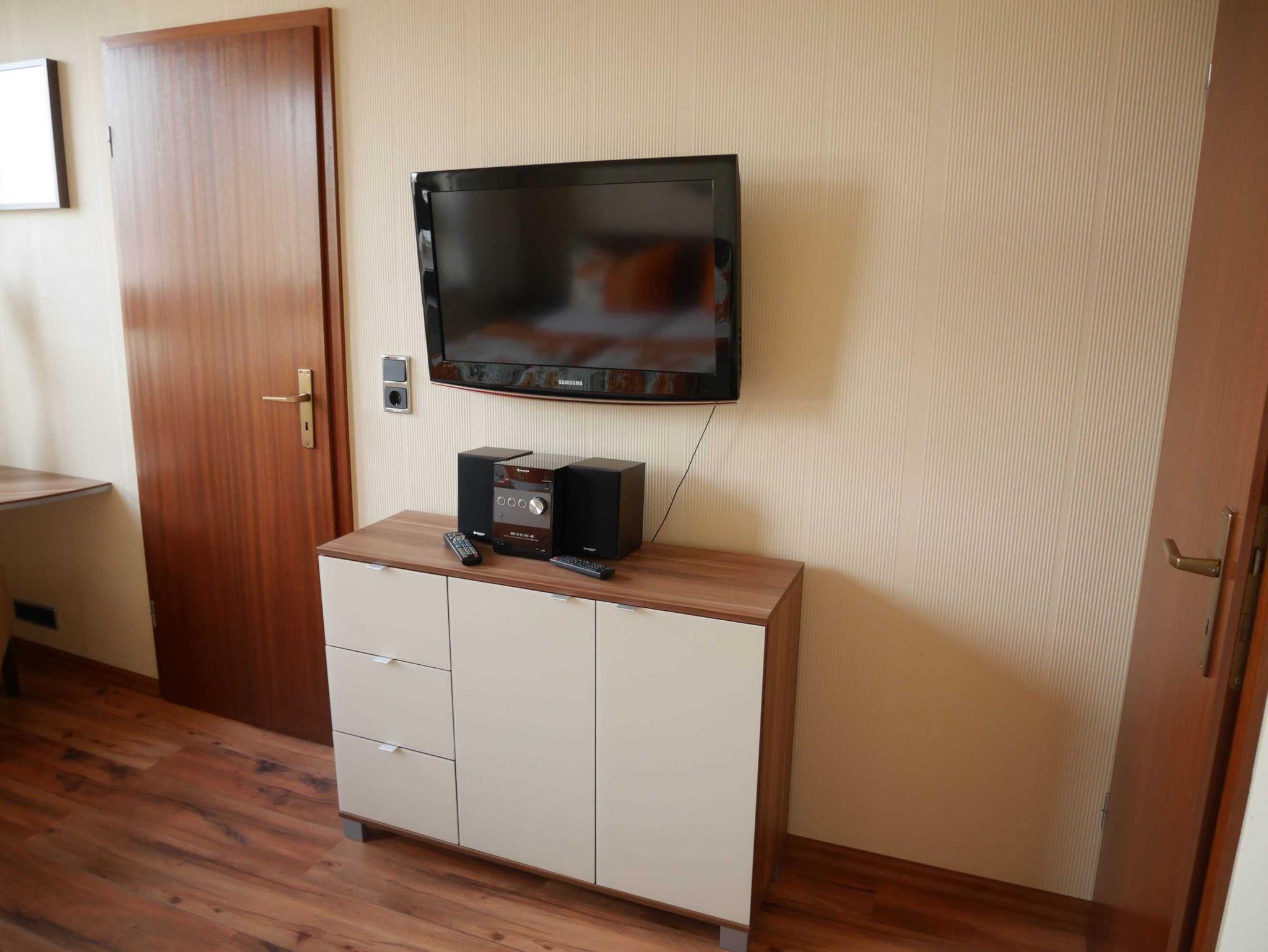 Der freundliche Wohn/Schlafraum des Apartements ist mit einem Boxspringdoppelbett (auch als Einzelbetten zu verwenden) in 4 Sterne Hotelqualität, einer kleinen Sesselsitzgruppe mit verstellbaren Rückenlehnen, einem Tisch, einem Arbeitsplatz, Nachtschrank, ein Sideboard und einem begehbaren Kleiderschrank ausgestattet.