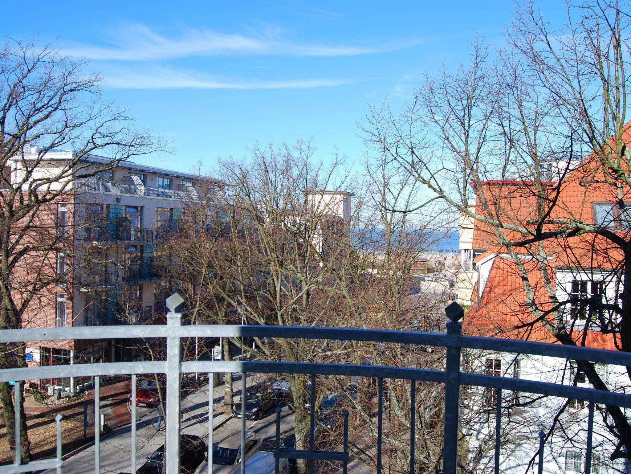 Vom schönen Rundbalkon schauen Sie auf die grünen Bäume der Heinrich-Heine Straße und des Warnemünder Kurparks. Vom Spätherbst bis zum Frühjahr können Sie sogar den Strand und die Ostsee sehen.