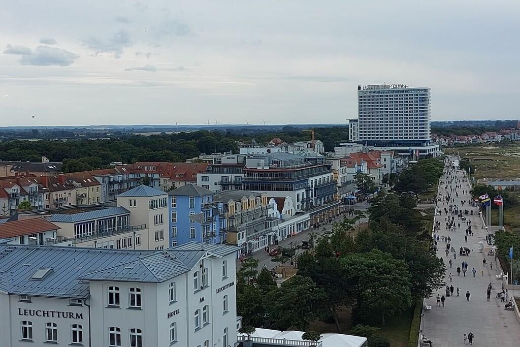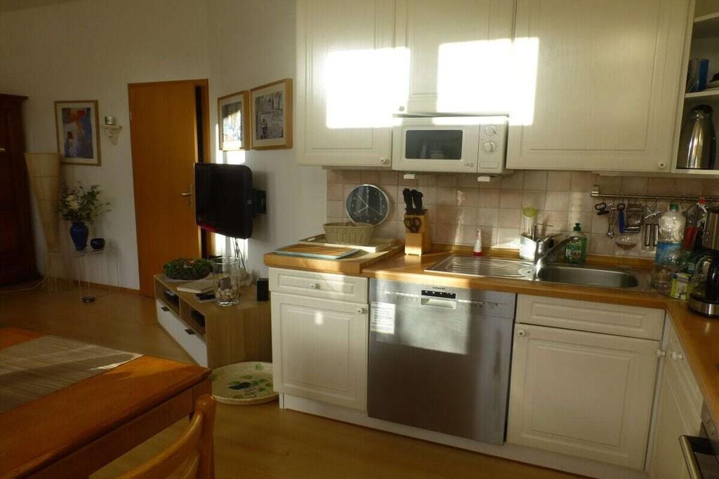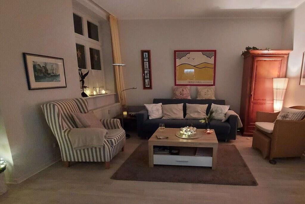 Unsere lichtdurchflutete, hochwertig eingerichtete Ferienwohnung befindet sich in einem in der typischen Bauweise (Bäderarchitektur) Ende der 90er Jahre vollrenovierten Haus im 1. Stock. Sie liegt in einer Seitenstraße zum Alten Strom und ist für 2-4 Personen eingerichtet. Zur verkehrsberuhigten Straße (Linden-Allee) öffnet sich eine 21 qm große Hochterrasse mit Teak-Gartenmöbeln, Strandkorb und Sonnenschirm ausgestattet. Bis hin zum zusätzlichen TV im Schlafzimmer, kostenlosem Internet-/WLAN-Zugang, Kinder-Reisebett inkl. Matratze, Kinder-Hochstuhl, Waschmaschine im Bad und einer umfassenden Küchenausstattung - inklusive Espresso-Maschine, Mikrowelle, Toaster, Wasserkocher, Eierkocher, etc., ist fast alles, inkl. 3 Fahrräder, vorhanden, ebenfalls diverse Strandutensilien, wie Strandmatten und -Muschel, Kinderspielzeug, etc. Obligatorisch findet der neue Gast einen gefüllten Vorratsschrank wie Kaffee, Tee, Zucker, Mehl, Öl, Essig, div. Gewürze, etc., und vor der Abreise wird, z.b. Kaffeepulve,r wieder aufgefüllt. Unsere Gäste (darunter viele Stammgäste, die seit Jahren immer wieder kommen) sagen uns - auch das trägt zu dem Gefühl bei, nach 'Hause' zu kommen. Viele Einträge in unserem Gästebuch zeugen davon.