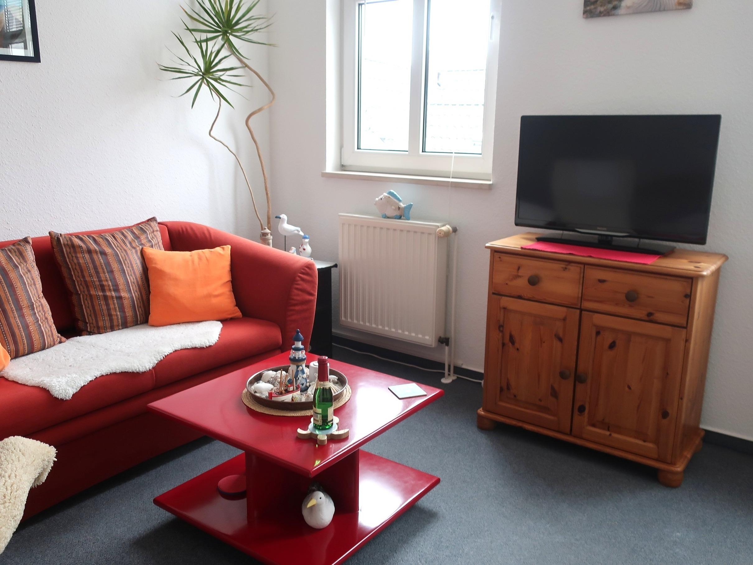 Die 1 Zimmer Ferienwohnung "Neptun 1" ist gemütlich eingerichtet. In der Wohnung befindet sich eine gut ausgestattete Küchenzeile mit Herd, Backofen, Geschirrspüler, Toaster, Kaffeemaschine, Kühlschrank und Geschirr. Auf dem Sofa kann man gemütlich den Abend zu zweit verbringen. Ein Flachbildfernseher gehört zur Ausstattung.