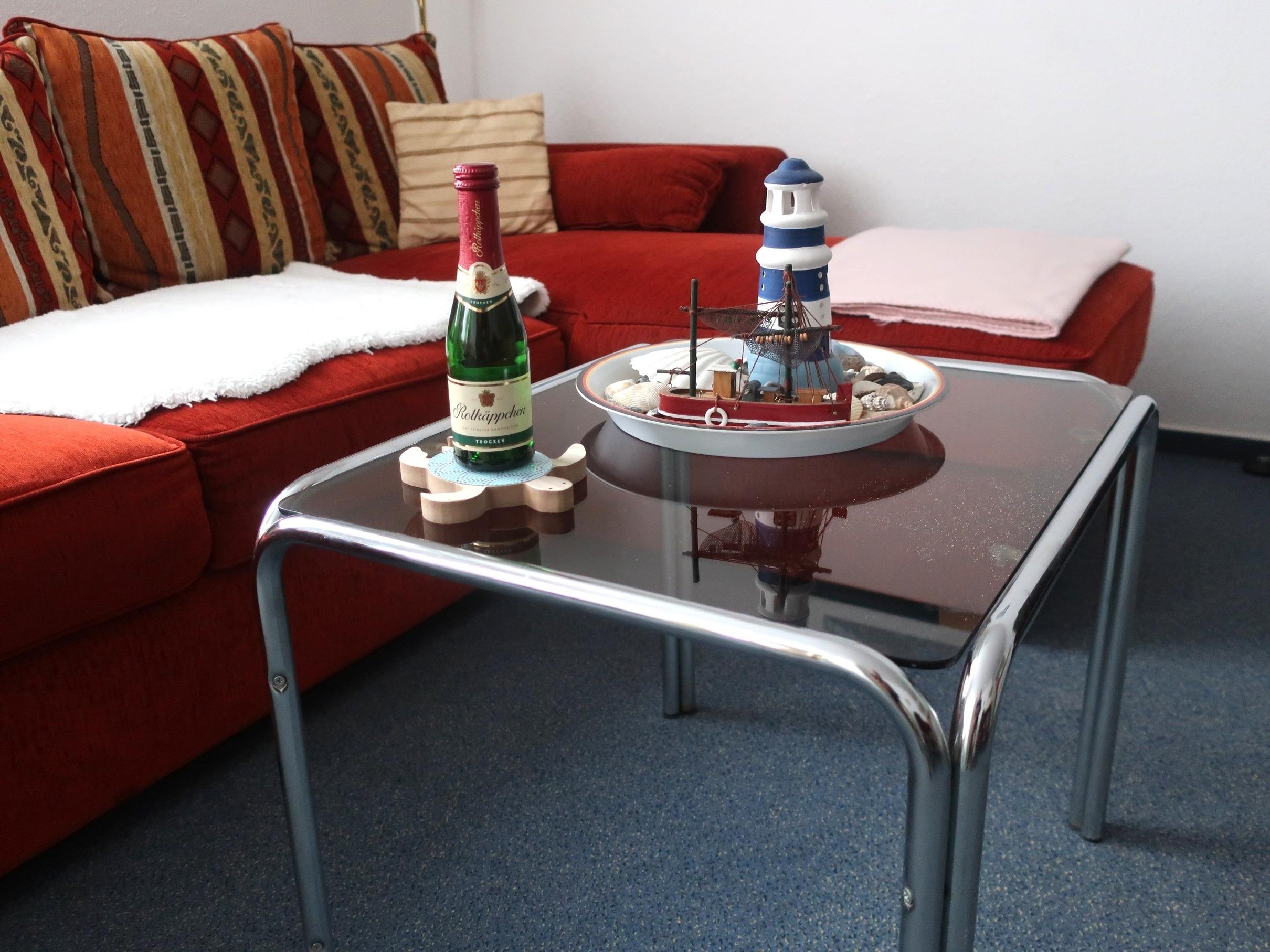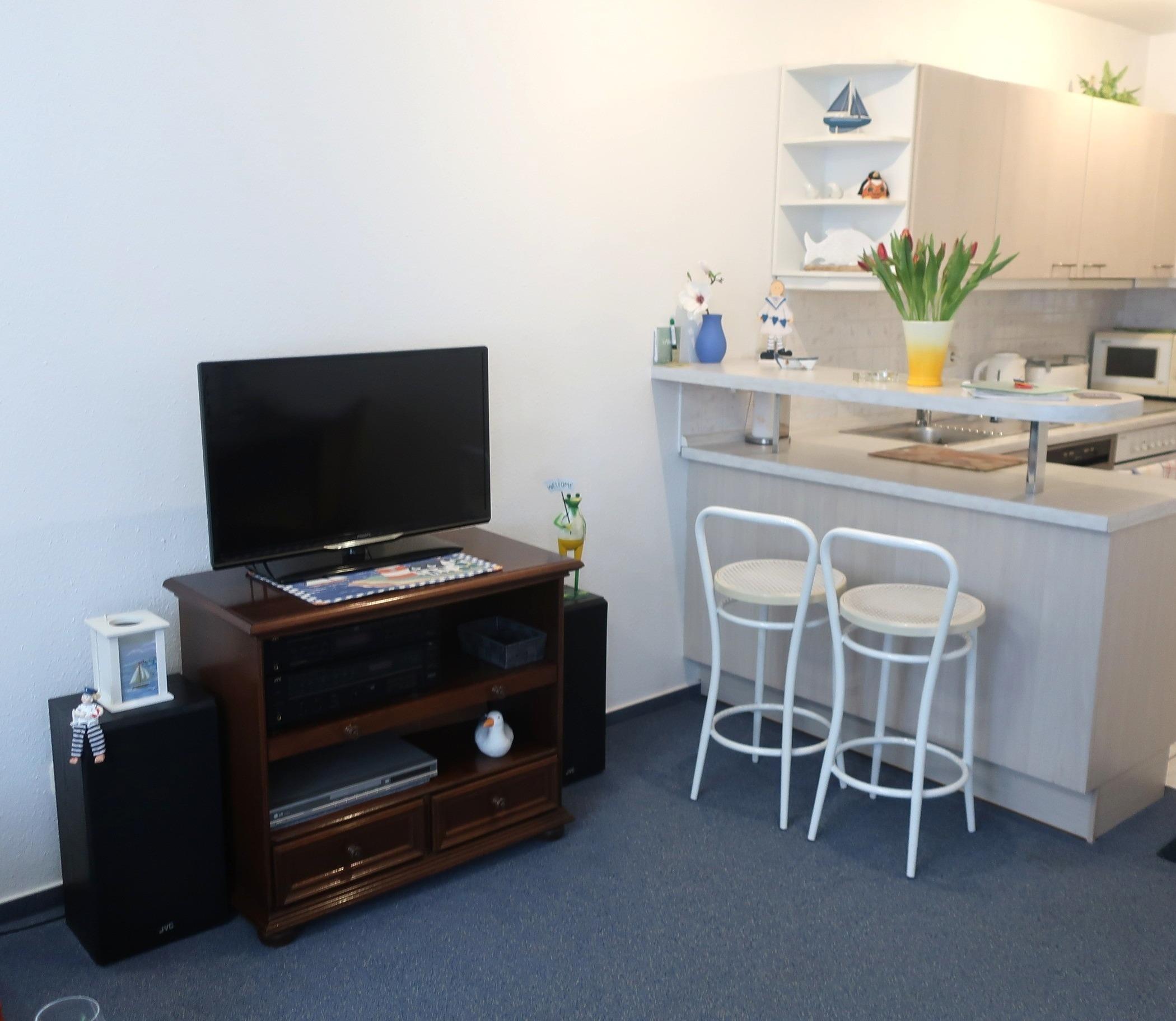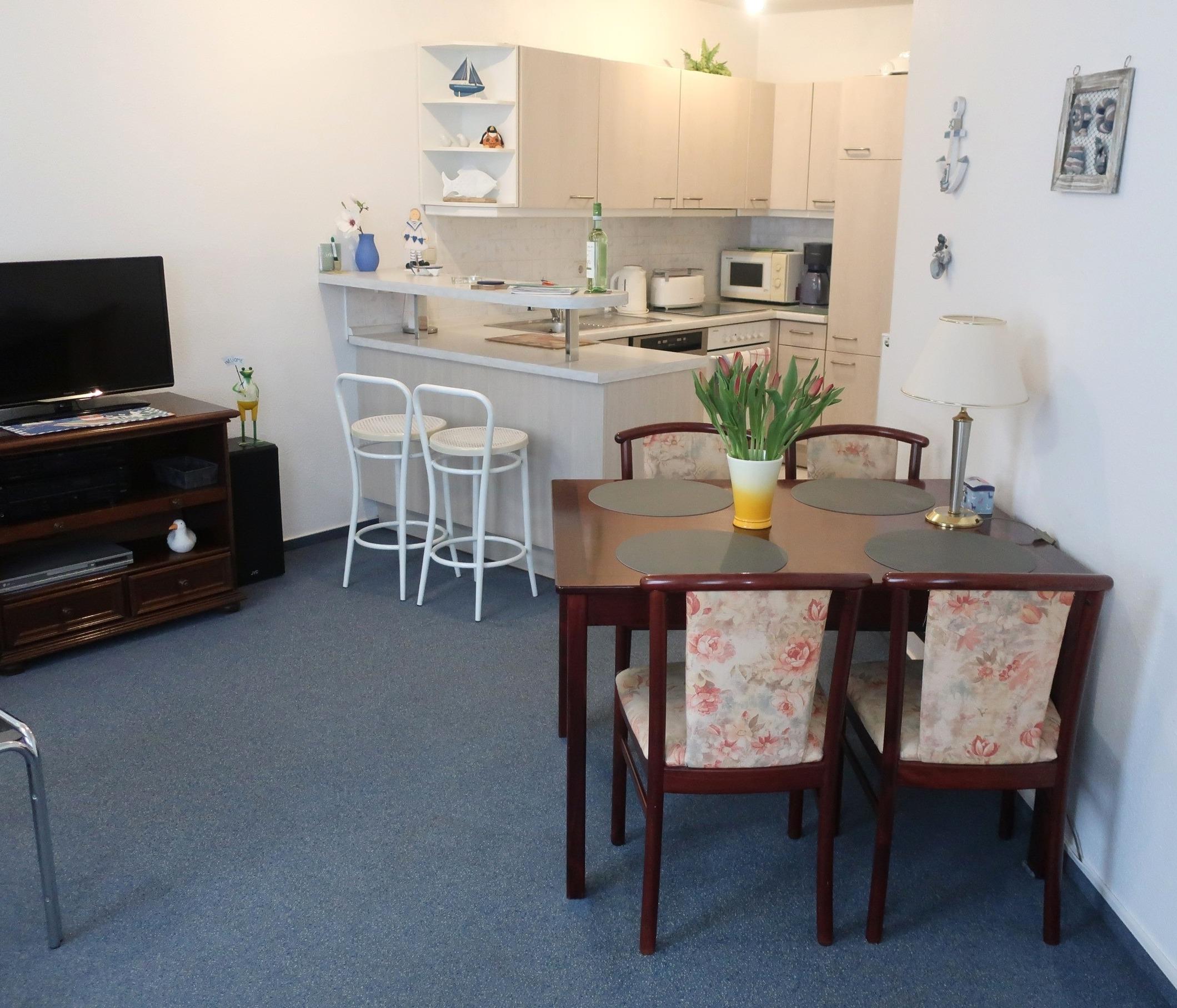 Die 2 Zimmer Ferienwohnung "Neptun 2" ist gemütlich eingerichtet. In der Wohnung befindet sich eine gut ausgestattete Küchenzeile mit Herd, Backofen, Geschirrspüler, Toaster, Kaffeemaschine, Kühlschrank und Geschirr. Am Tresen kann am Morgen seinen Kaffee genießen. Auf dem Sofa kann man gemütlich den Abend zu zweit verbringen. Ein Flachbildfernseher gehört zur Ausstattung.