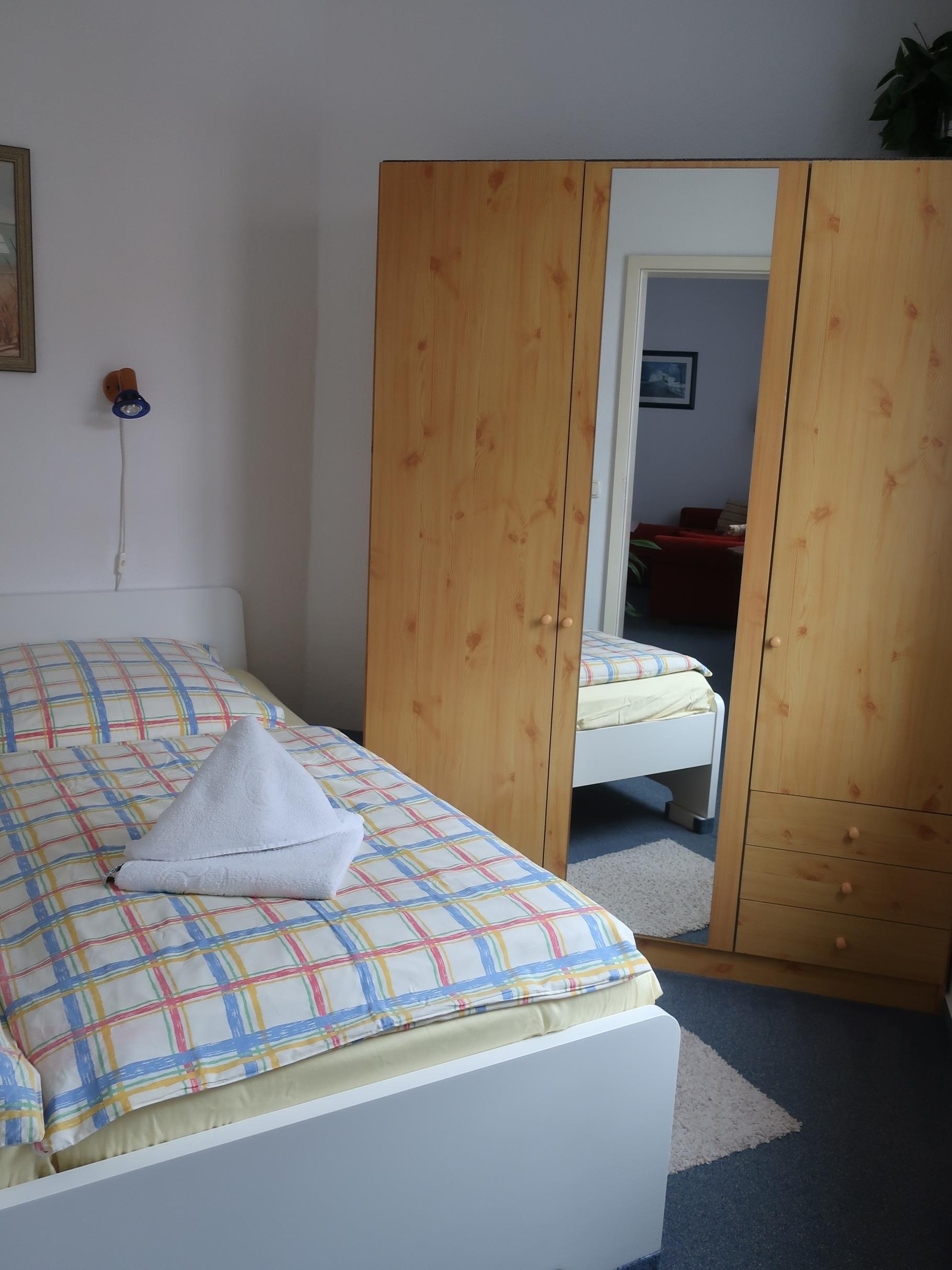 Im separaten Schlafzimmer befindet sich ein Doppelbett (180 cm x 200 cm) und ein Kleiderschrank. Das Bad ist mit einem Waschbecken, Toilette und Dusche ausgestattet. Seife und ein Fön sind vorhanden.