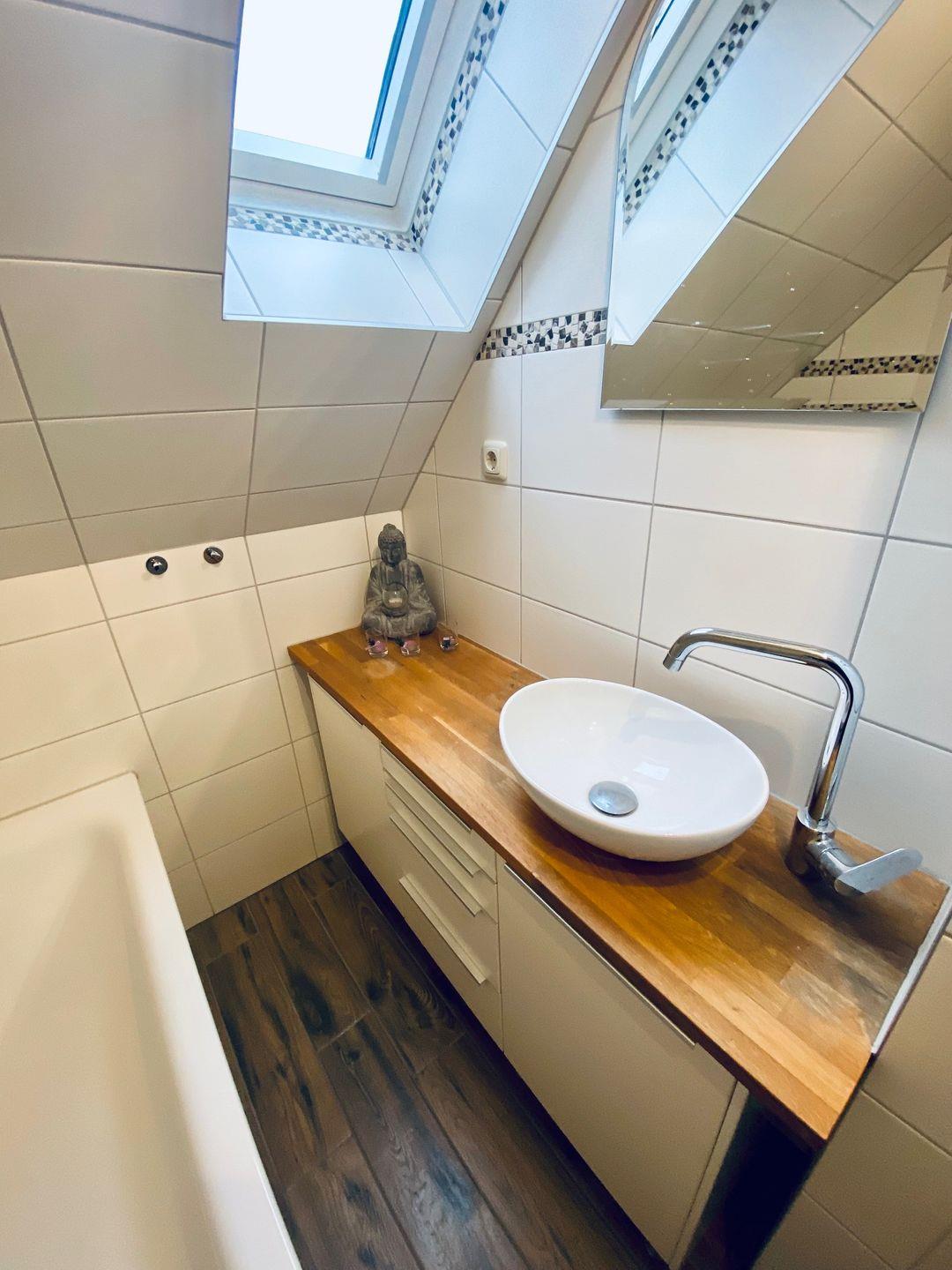 Das Badezimmer mit Tageslicht ist hell und modern und verfügt über eine Badewanne. Babybett, Hochstuhl, Staubsauger, Wäscheständer, etc sind vorhanden.