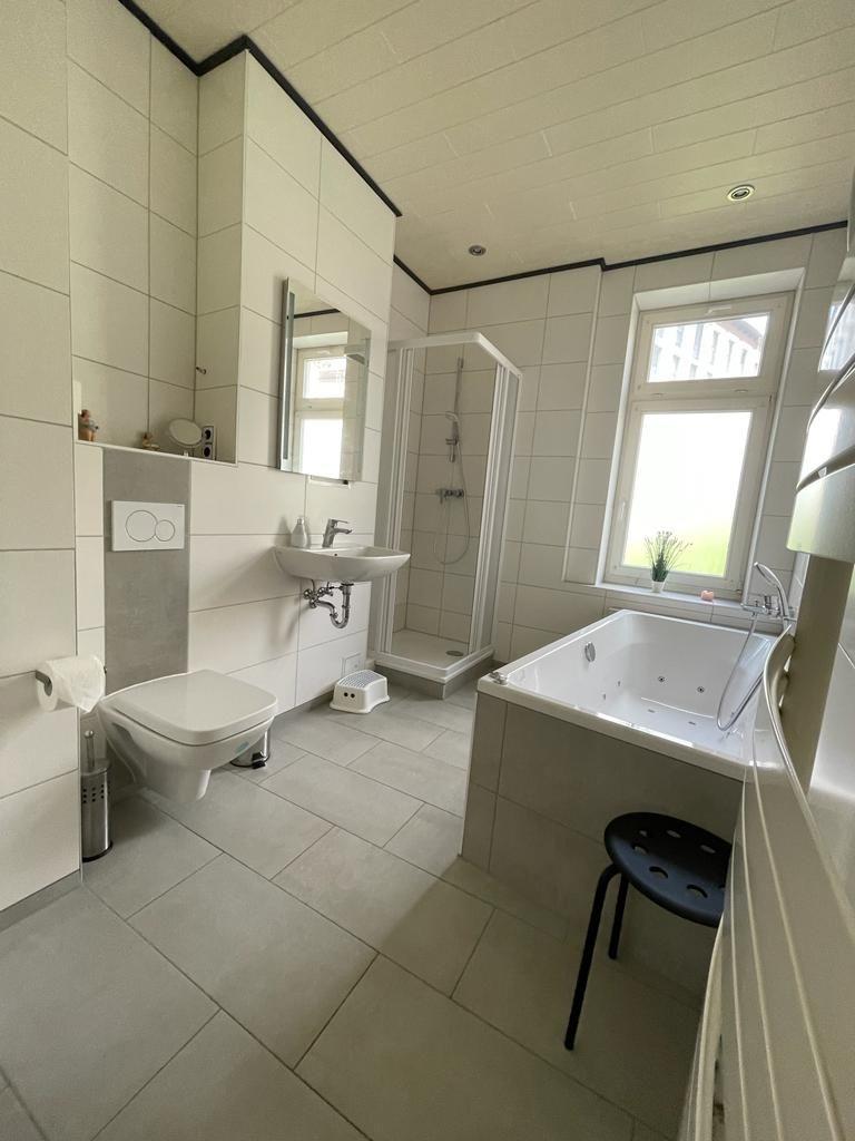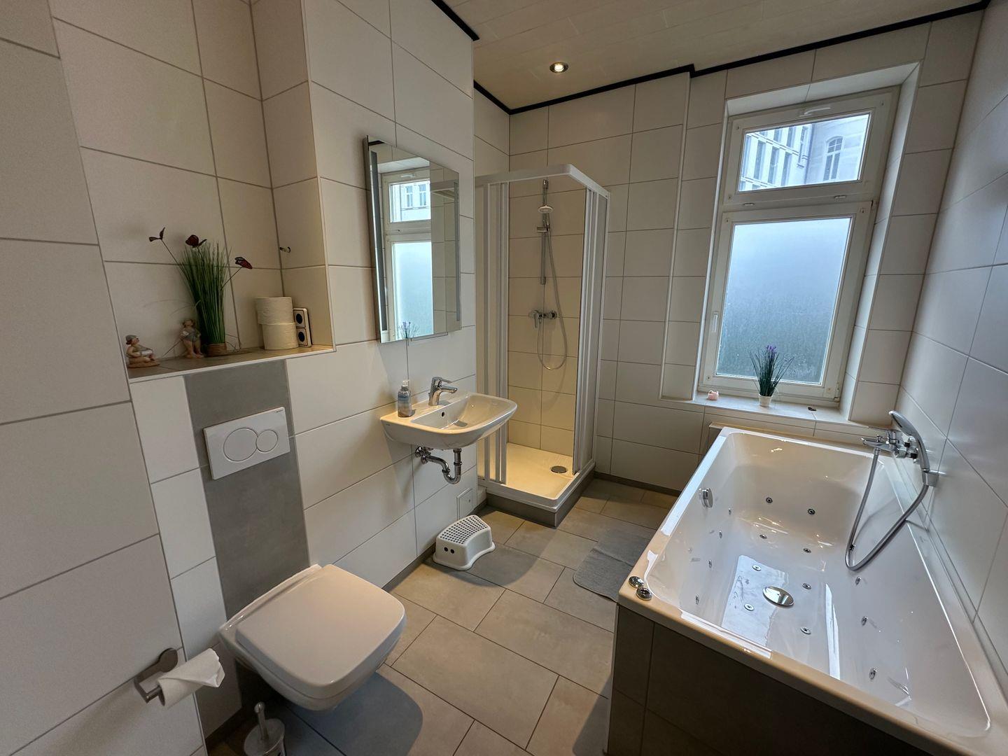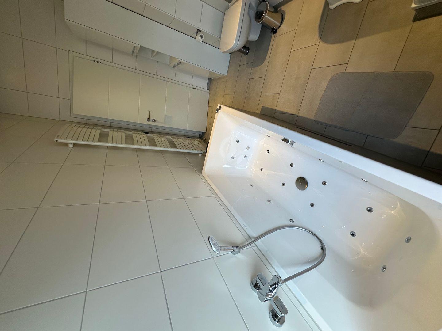 Das Highlight der Wohnung ist der echte Jacuzzi-Whirlpool im Badezimmer, eine separate Dusche gibt es auch. Von hier aus können Sie auch in den Innenhof des Hauses schauen.