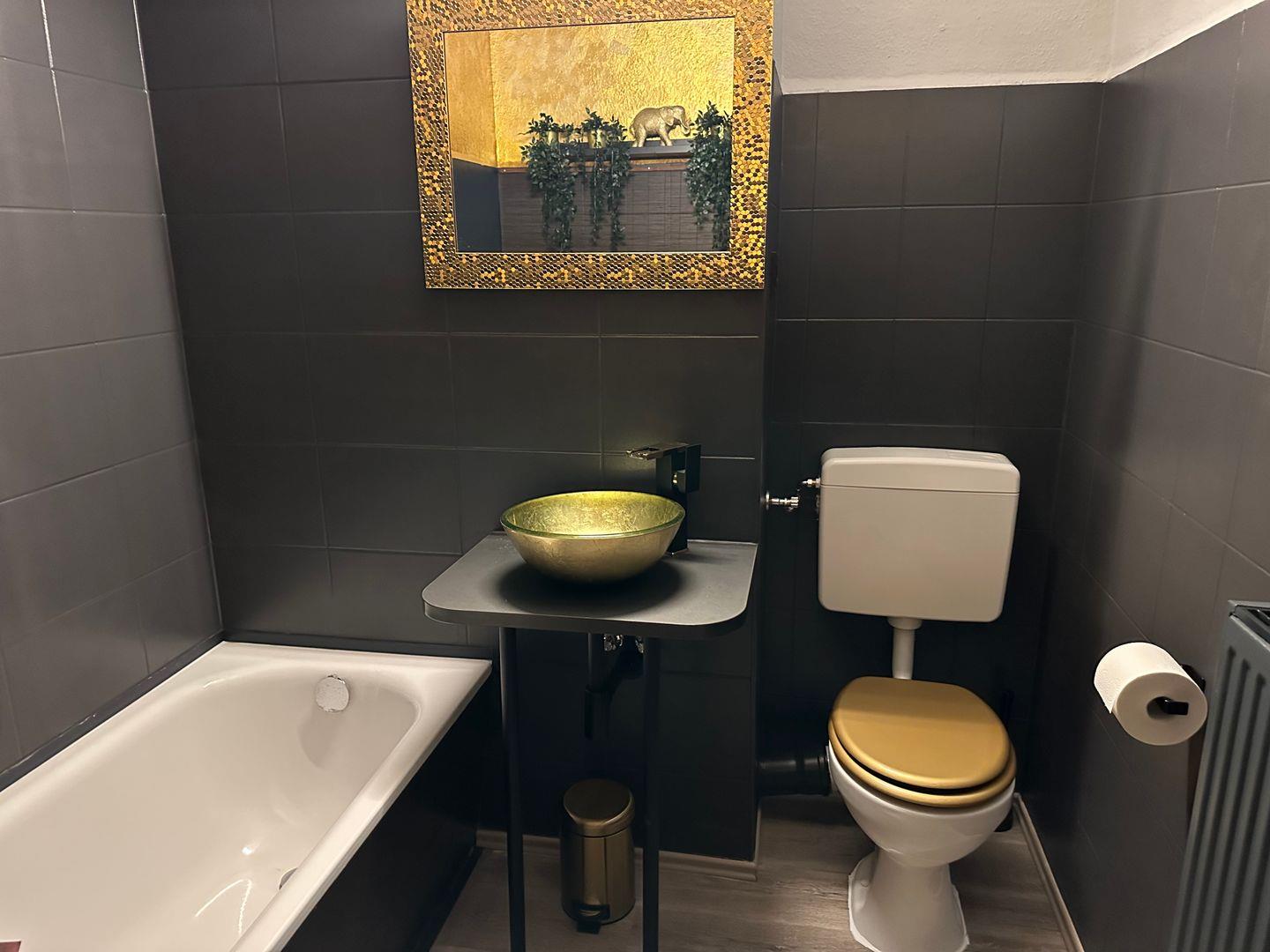 Das Badezimmer verfügt über eine Badewanne, WC, Waschbecken, Haartrockner, Kosmetikspiegel und alle notwendigen Badartikel wie Seife. Waschmaschine, Bügeleisen, Bügelbrett, Staubsauger und Reinigungsmittel stehen zur Eigennutzung zur Verfügung.