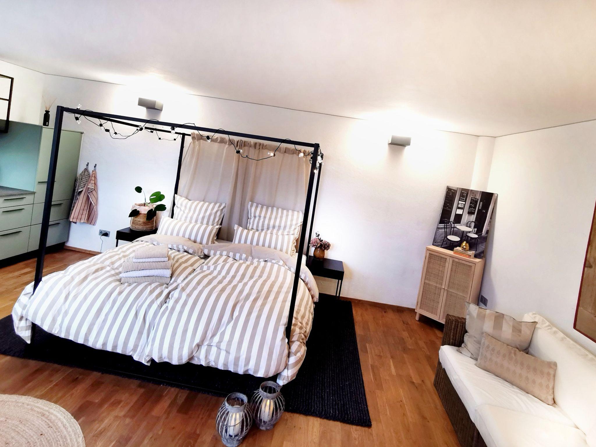 In dieser liebevoll eingerichteten 1-Zimmer-Wohnung könnt ihr die perfekte Auszeit genießen. Der Höhepunkt ist das wunderbare Himmelbett mit einer großzügigen 1,80 m breiten Matratze – ohne störende Unterbrechungen, sodass ihr die ganze Nacht kuschelig beisammen schlafen könnt.