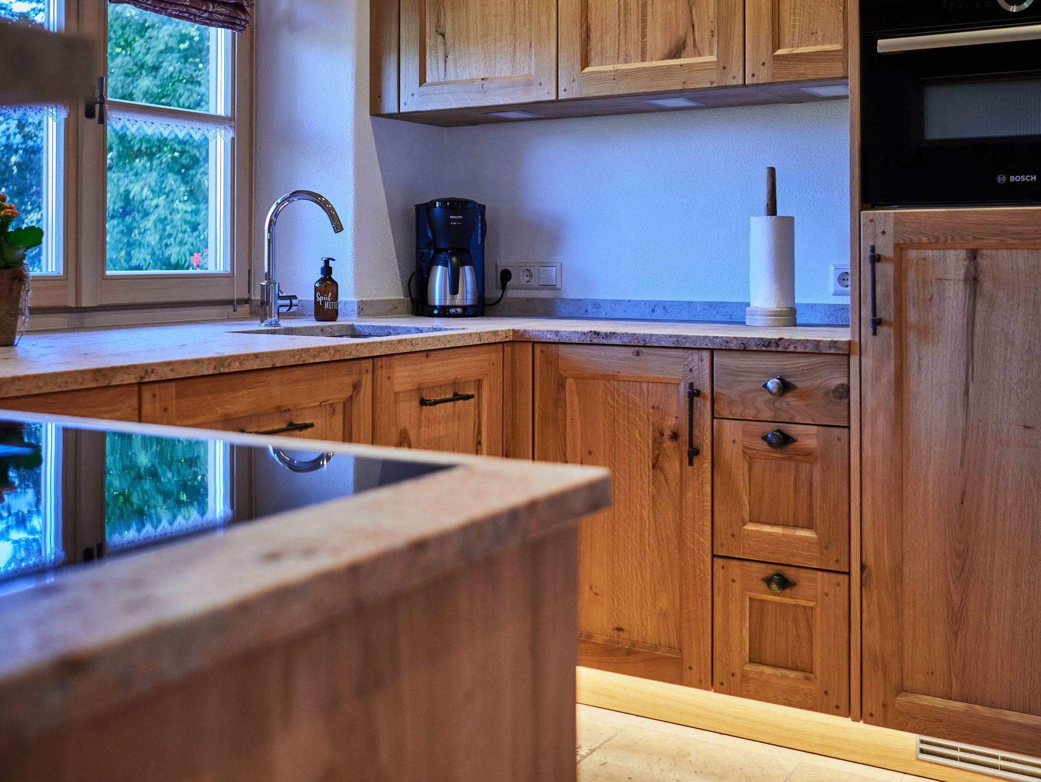 In der vollausgestatteten Wohnküche sorgt der gemauerte Holzofen für eine angenehme Atmosphäre und vermittelt den Eindruck einer Bauernstube.