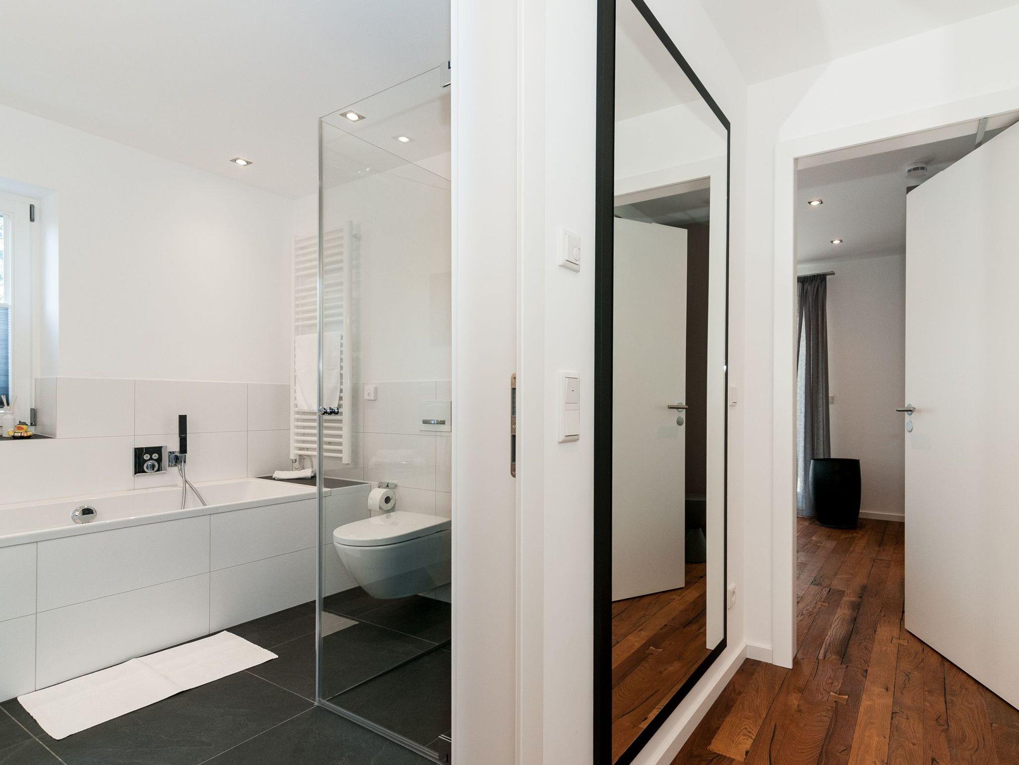 • Hochwertige Badezimmerausstattung mit Badewanne sowie Walk-in-Dusche mit Rainshower Duschkopf und separater Handbrause