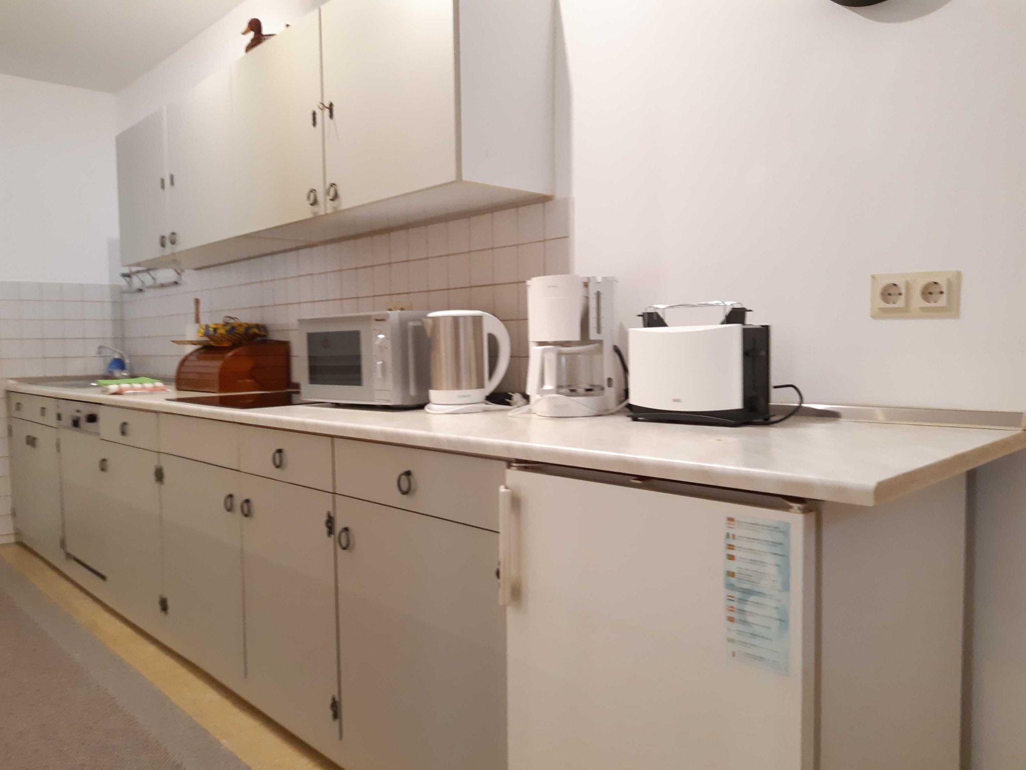 • offene Küche mit 4-Plattenherd, Kühlschrank, Geschirrspüler, Kaffeemaschine, Wasserkocher, Toaster, Mikrowellengerät