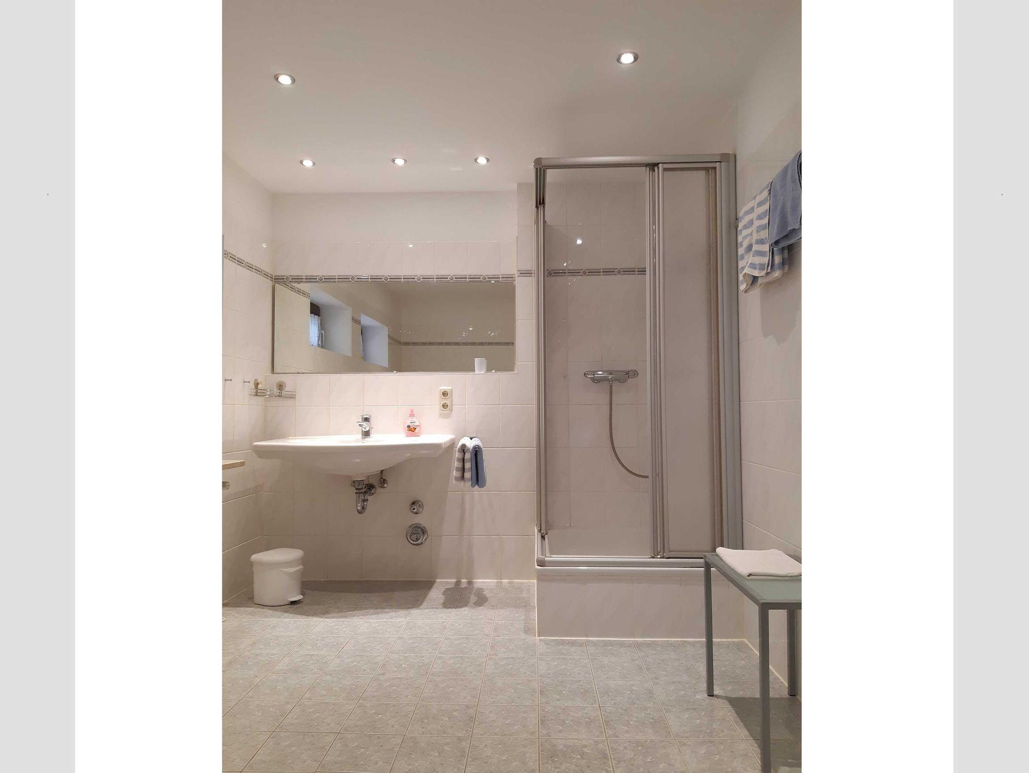 • Bad mit Dusche, Waschbecken und WC, Haartrockner
