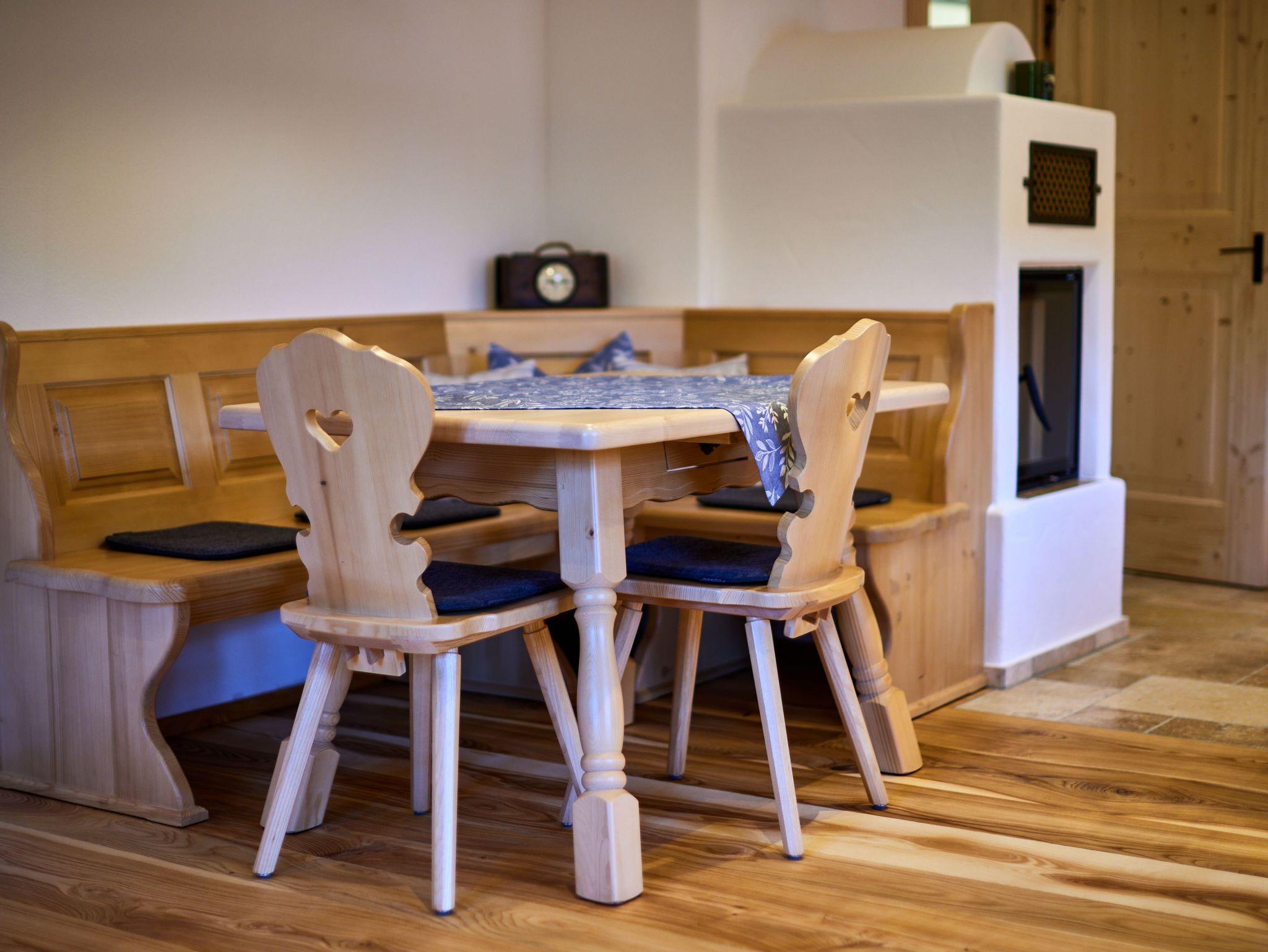 Der gemauerte Holzofen in der vollausgestatteten Wohnküche sorgt für eine angenehme Atmosphäre und vermittelt den Eindruck einer Bauernstube.