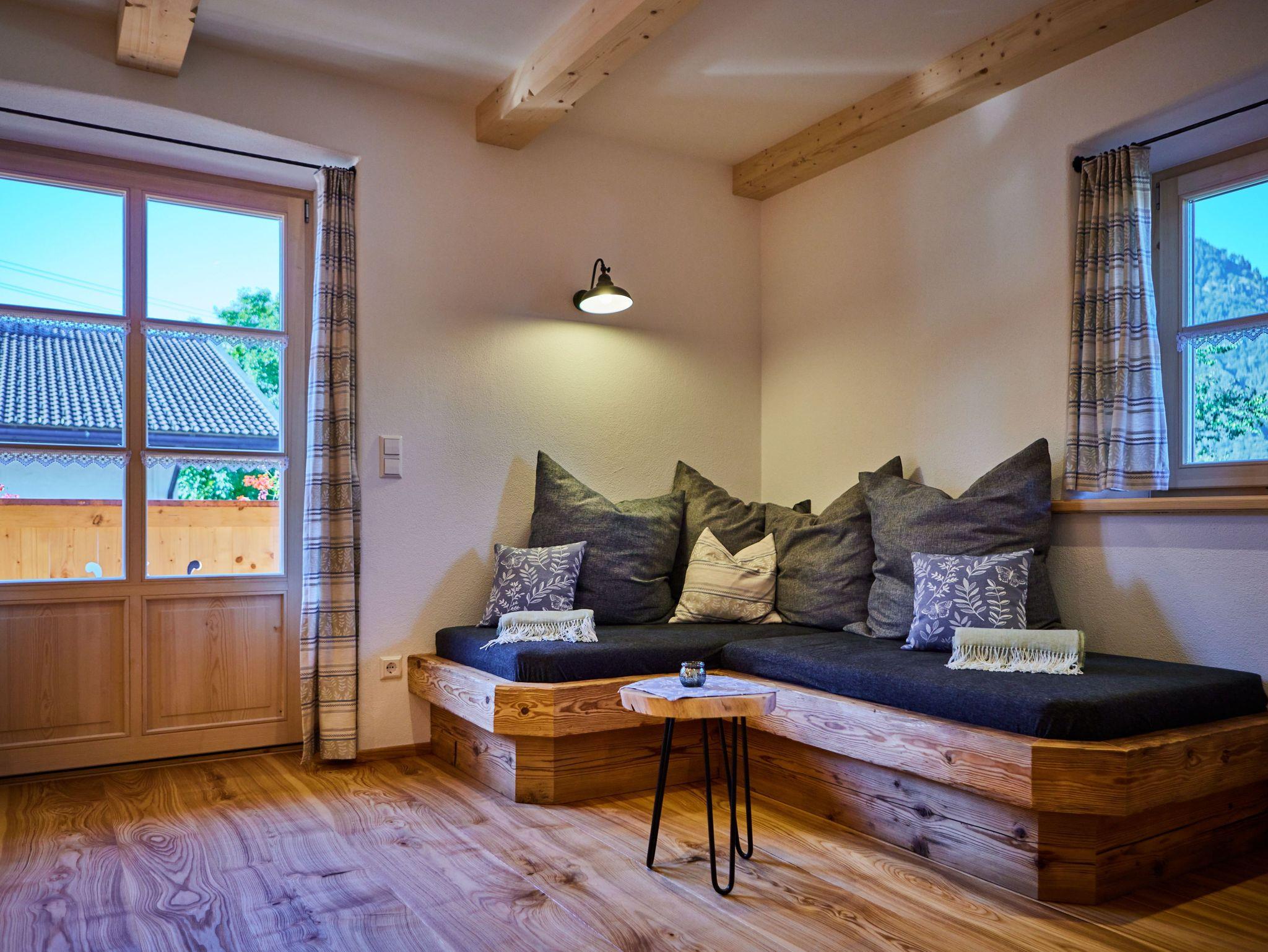 Die Ferienwohnung Oimarausch befindet sich im Erdgeschoß und verfügt über 2 Terrassen (Süden und Westen).