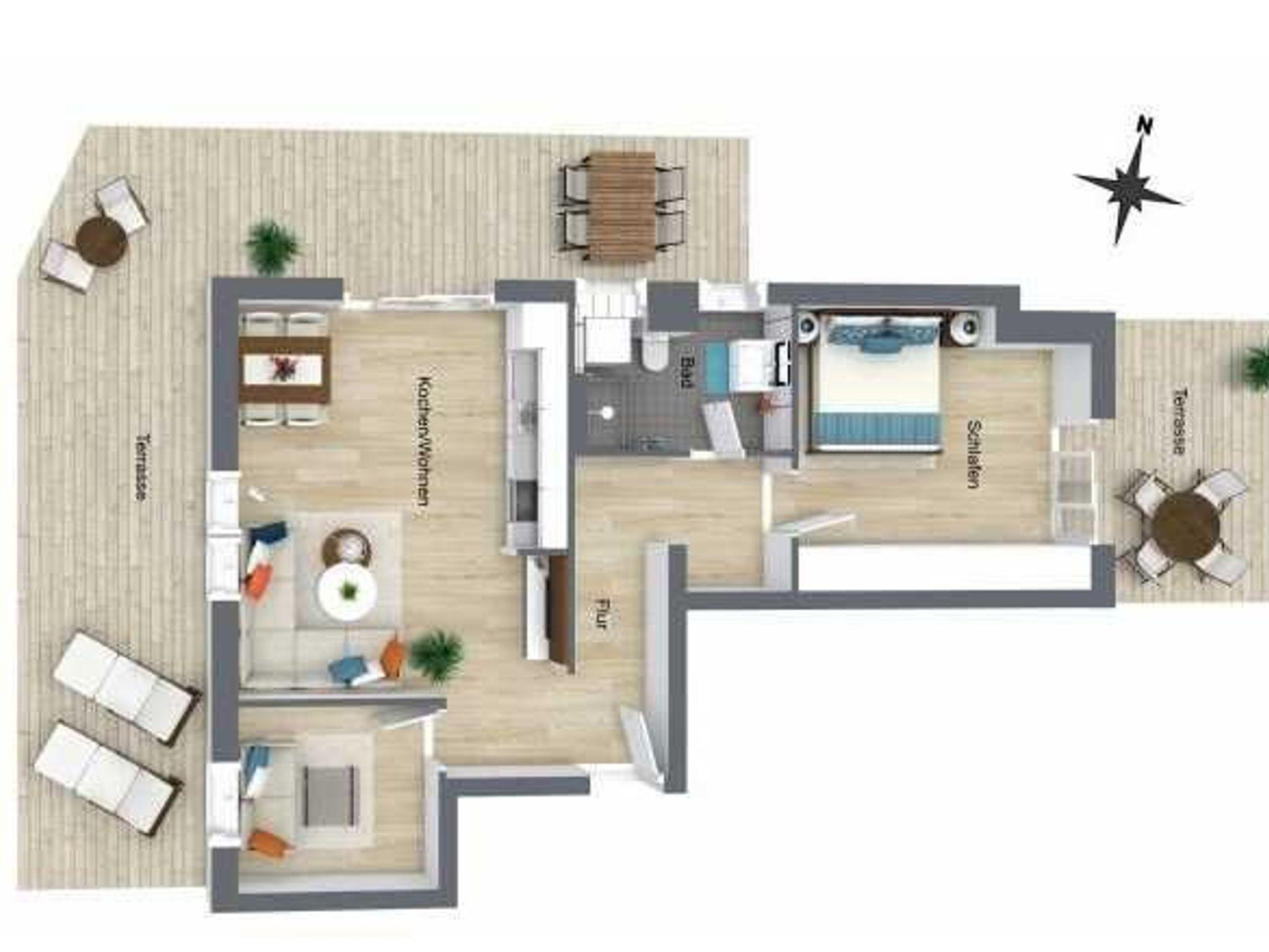 Die ca. 80 qm große Ferienwohnung ist modern eingerichtet und lädt Sie ein, Ihre schönsten Tage im Jahr in einer angenehmen Atmosphäre zu verbringen! Die grosse Terrasse bietet Ihnen viel Sonne, Ruhe und Privatsphäre.