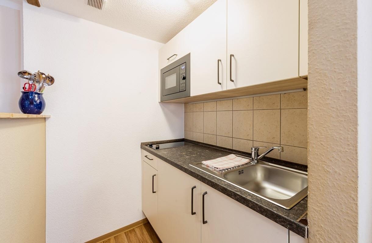 Küchenzeile mit Spüle, Geschirr, Kühlschrank, 2 Herdplatten