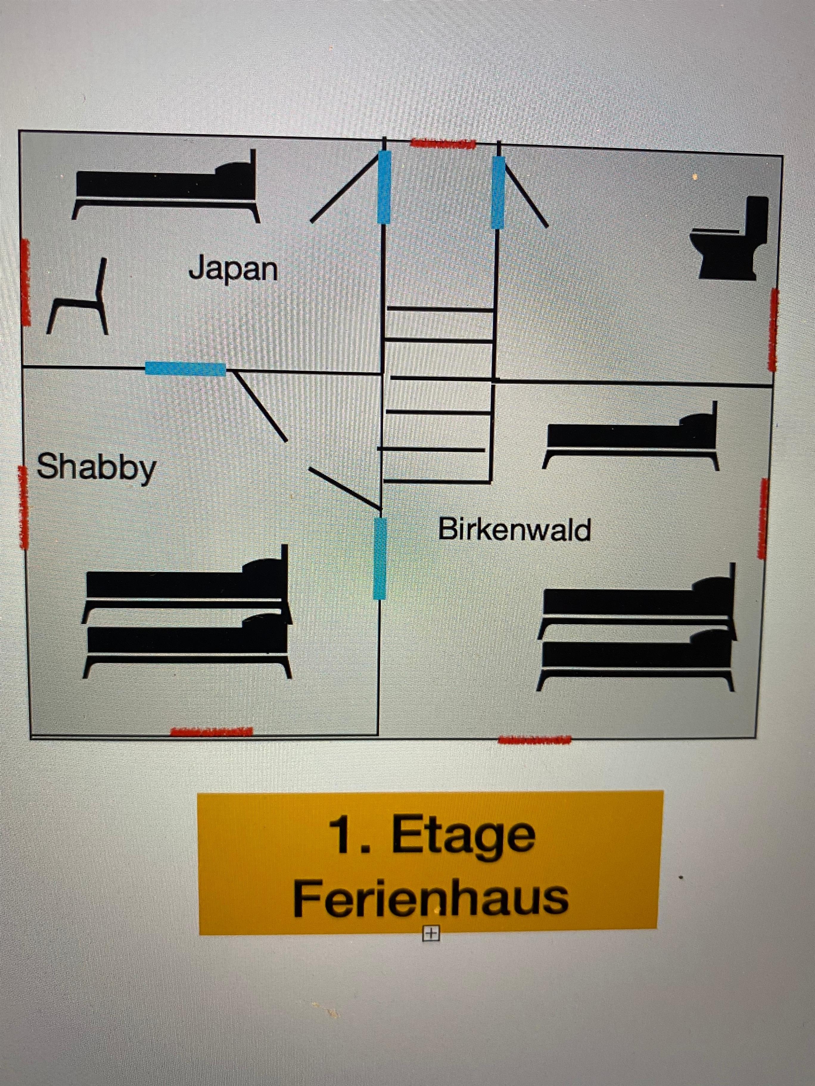 Es gibt eine moderne Küche, ein grosses Wohnzimmer sowie ein Bad mit Wanne. In der oberen Etage befinden sich drei Schlafzimmer und ebenfalls noch ein Bad mit Dusche.Die Schlafzimmer liegen hintereinander weg, aber mit Freunden oder Familie dürfte dies kein Thema sein.Das 4. Schlafzimmer liegt im Untergeschoß mit 2 Einzelbetten.