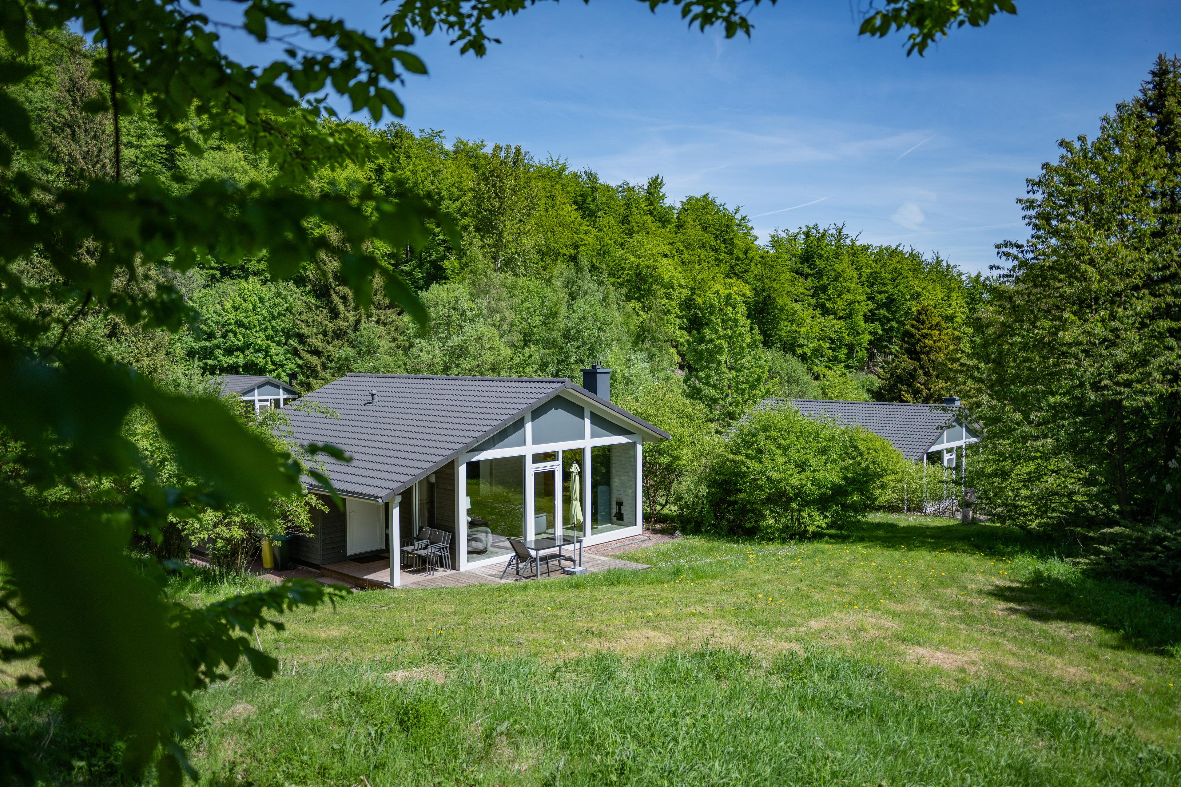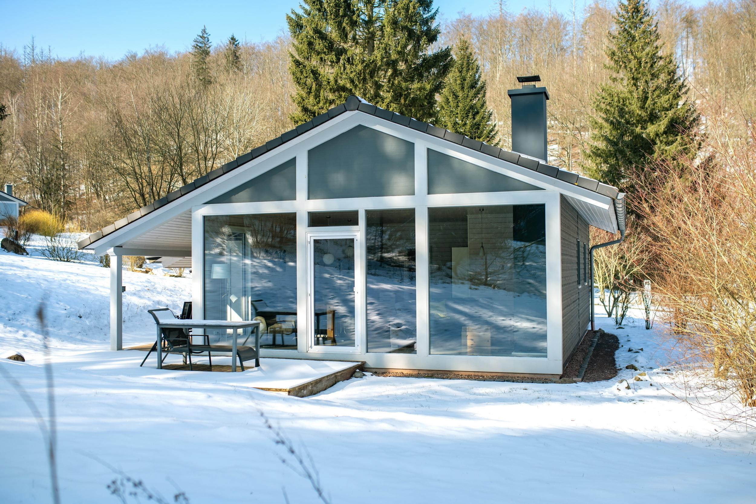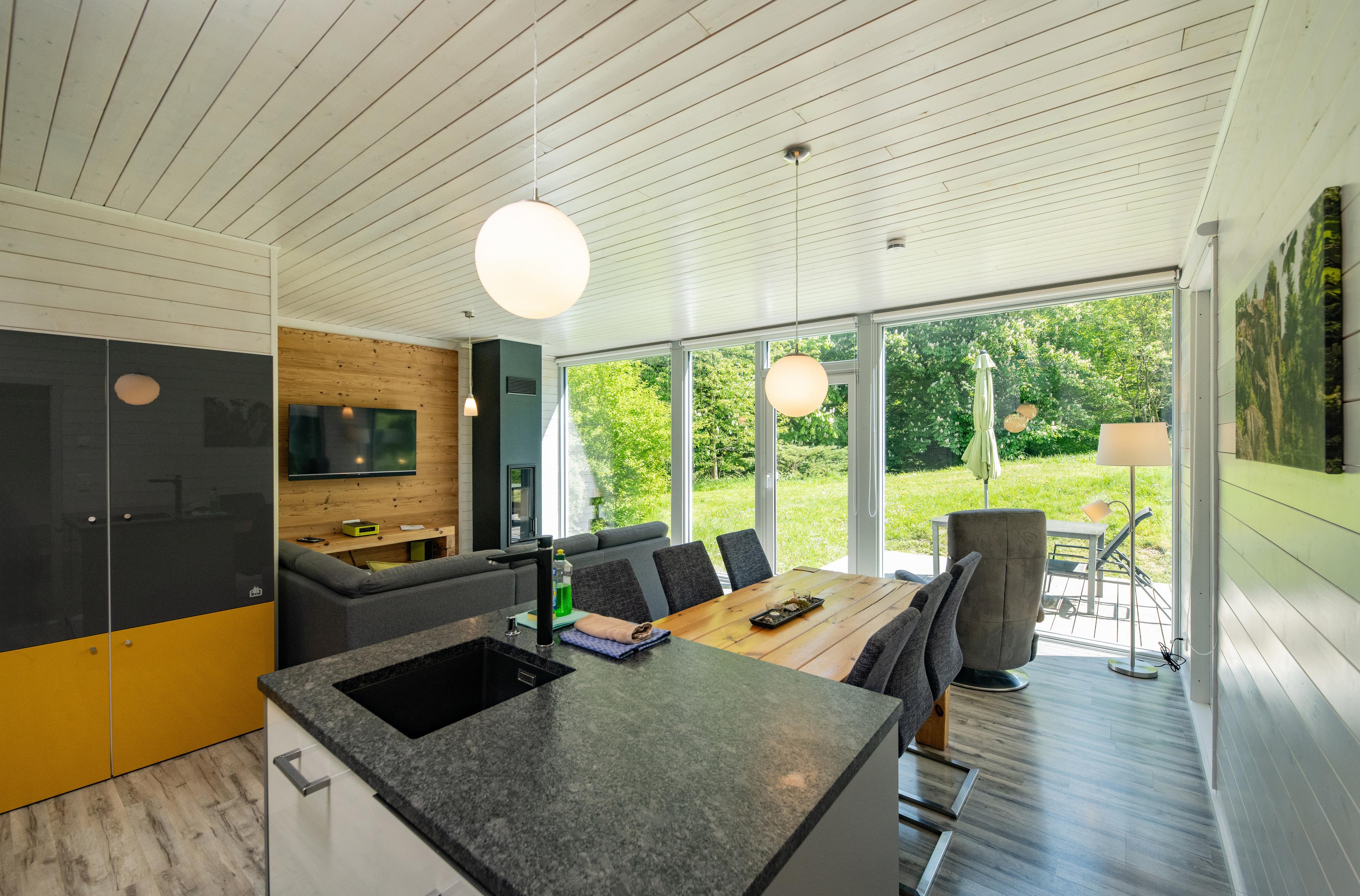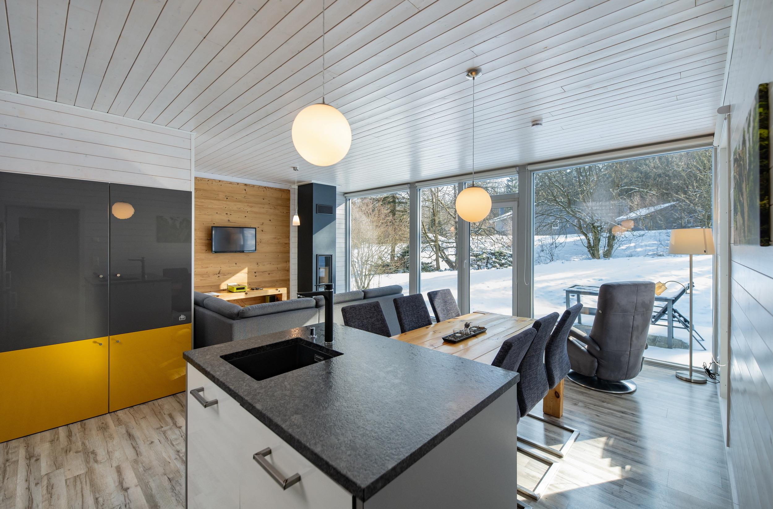 Das Ferienhaus mit einem lichtdurchluteten offenen Wohn- und Küchenbereich, zwei Schlafzimmern und einem Wellness-Bad mit Sauna bietet Ihnen auf 70 Quadratmetern ausreichend Platz für 4 Personen. Die 7 Meter breite Glasfront lässt die Natur beim Essen oder Relaxen teilhaben. In der kalten Jahreszeit vollendet das knisternde Kaminfeuer das Urlaubsfeeling.