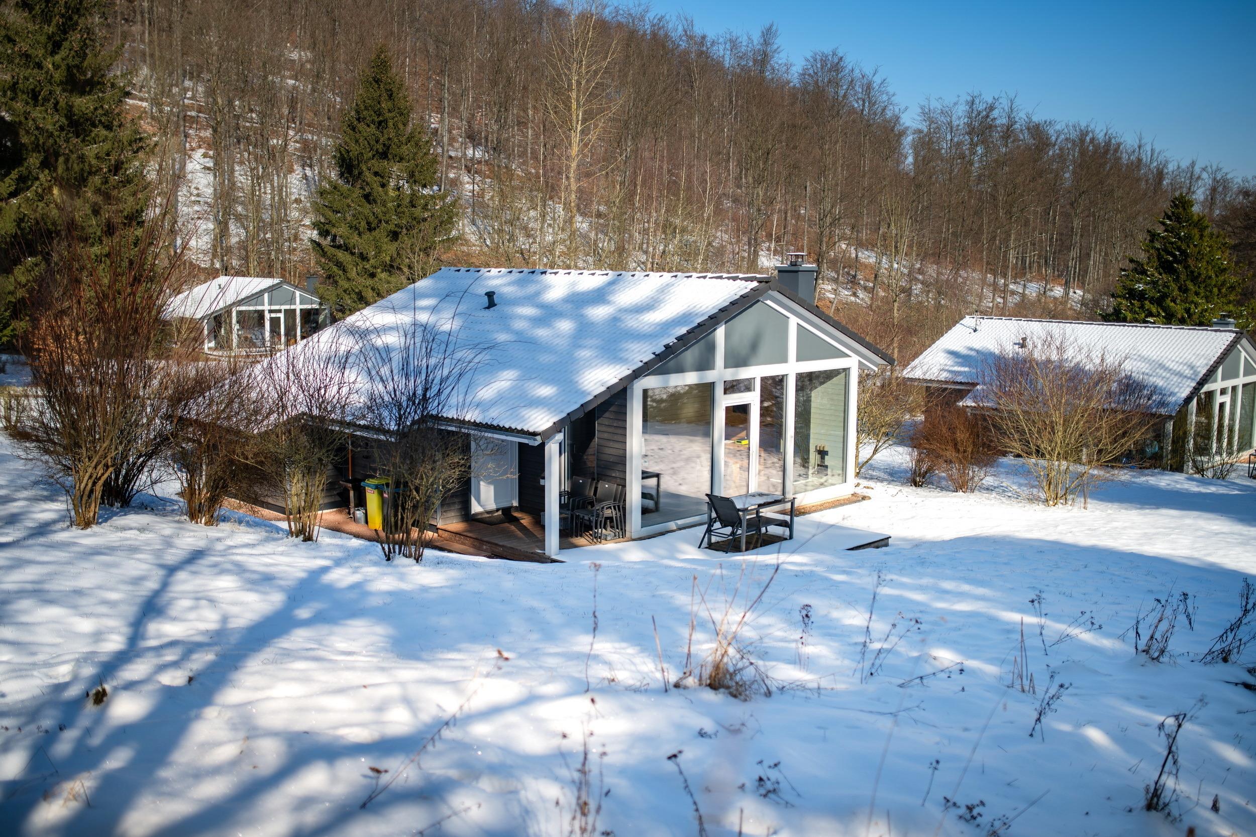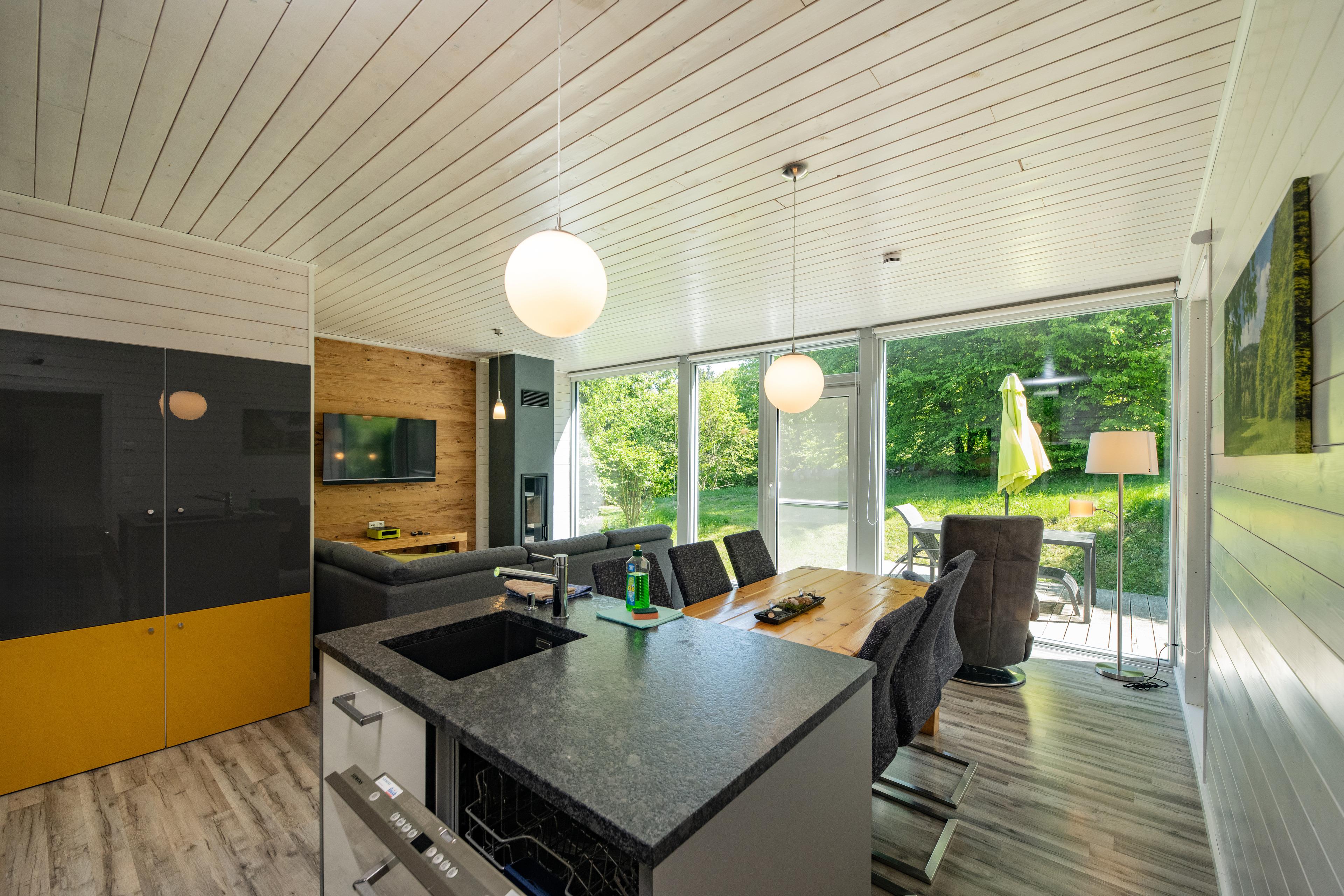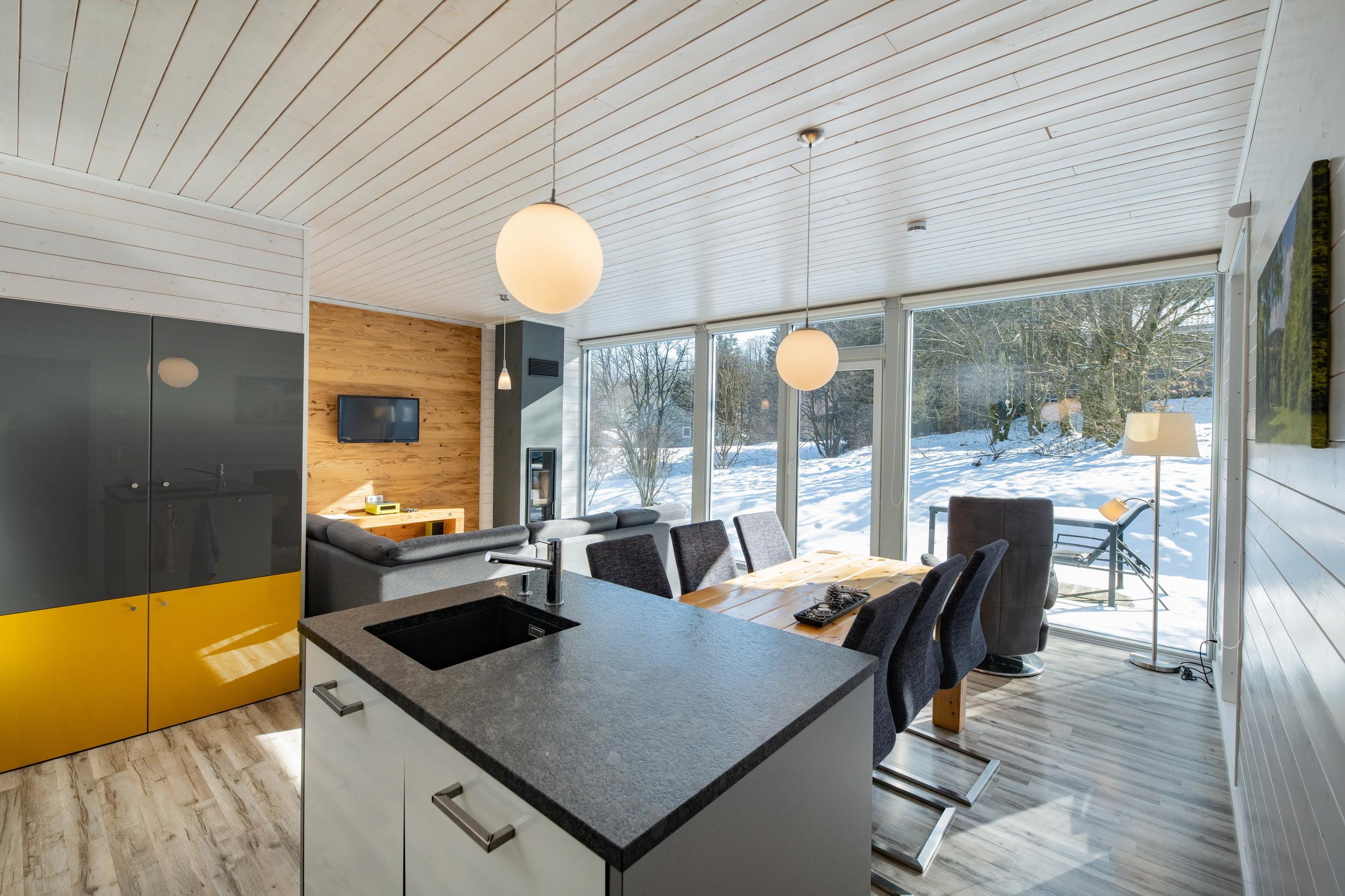 Das Ferienhaus mit einem lichtdurchluteten offenen Wohn- und Küchenbereich, zwei Schlafzimmern und einem Wellness-Bad mit Sauna bietet Ihnen auf 70 Quadratmetern ausreichend Platz für 4 Personen. Die 7 Meter breite Glasfront lässt die Natur beim Essen oder Relaxen teilhaben. In der kalten Jahreszeit vollendet das knisternde Kaminfeuer das Urlaubsfeeling.