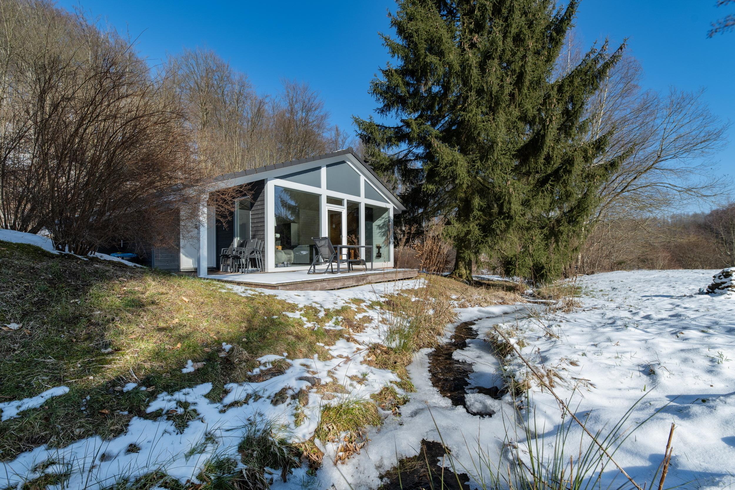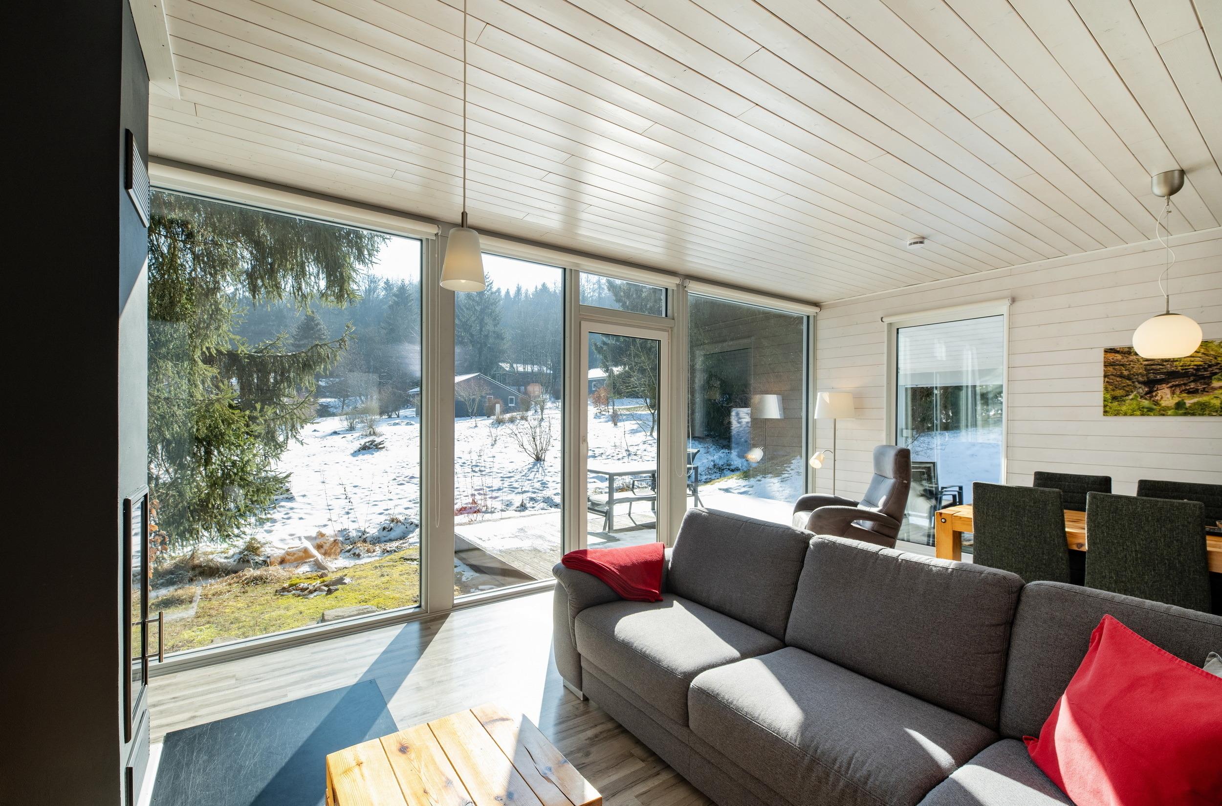 Das Ferienhaus mit einem lichtdurchluteten offenen Wohn- und Küchenbereich, zwei Schlafzimmern und einem Wellness-Bad mit Sauna bietet Ihnen auf 70 Quadratmetern ausreichend Platz für 4 Personen. Die 7 Meter breite Glasfront lässt die Natur beim Essen oder Relaxen teilhaben. In der kalten Jahreszeit vollendet das knisternde Kaminfeuer das Urlaubsfeeling.
