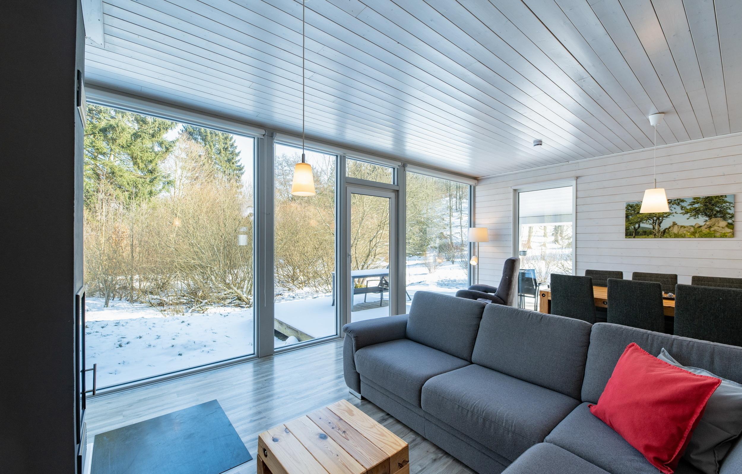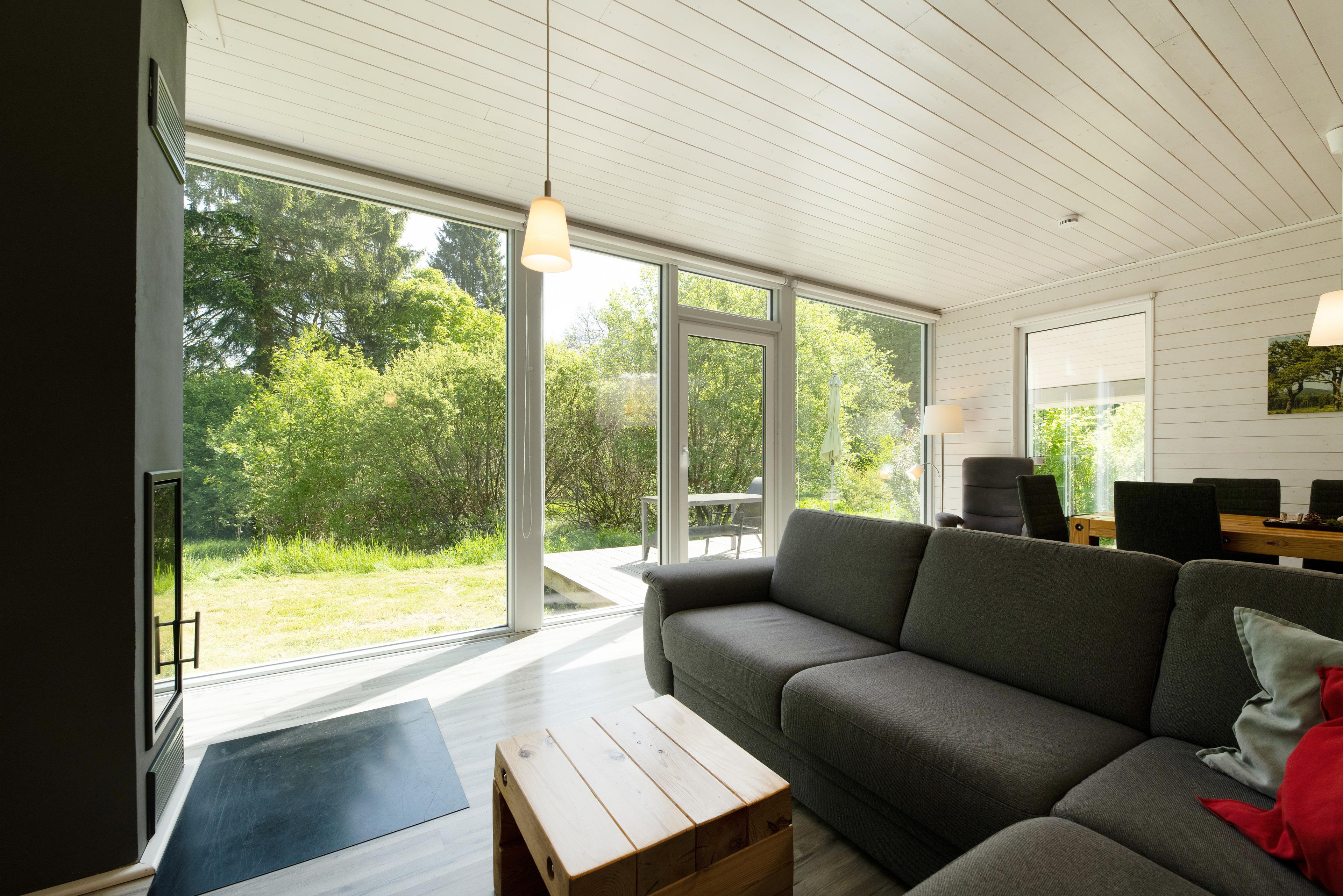 Das Ferienhaus mit einem lichtdurchluteten offenen Wohn- und Küchenbereich, zwei Schlafzimmern und einem Wellness-Bad mit Sauna bietet Ihnen auf 70 Quadratmetern ausreichend Platz für 4 Personen. Die 7 Meter breite Glasfront lässt die Natur beim Essen oder Relaxen teilhaben. In der kalten Jahreszeit vollendet das knisternde Kaminfeuer das Urlaubsfeeling.