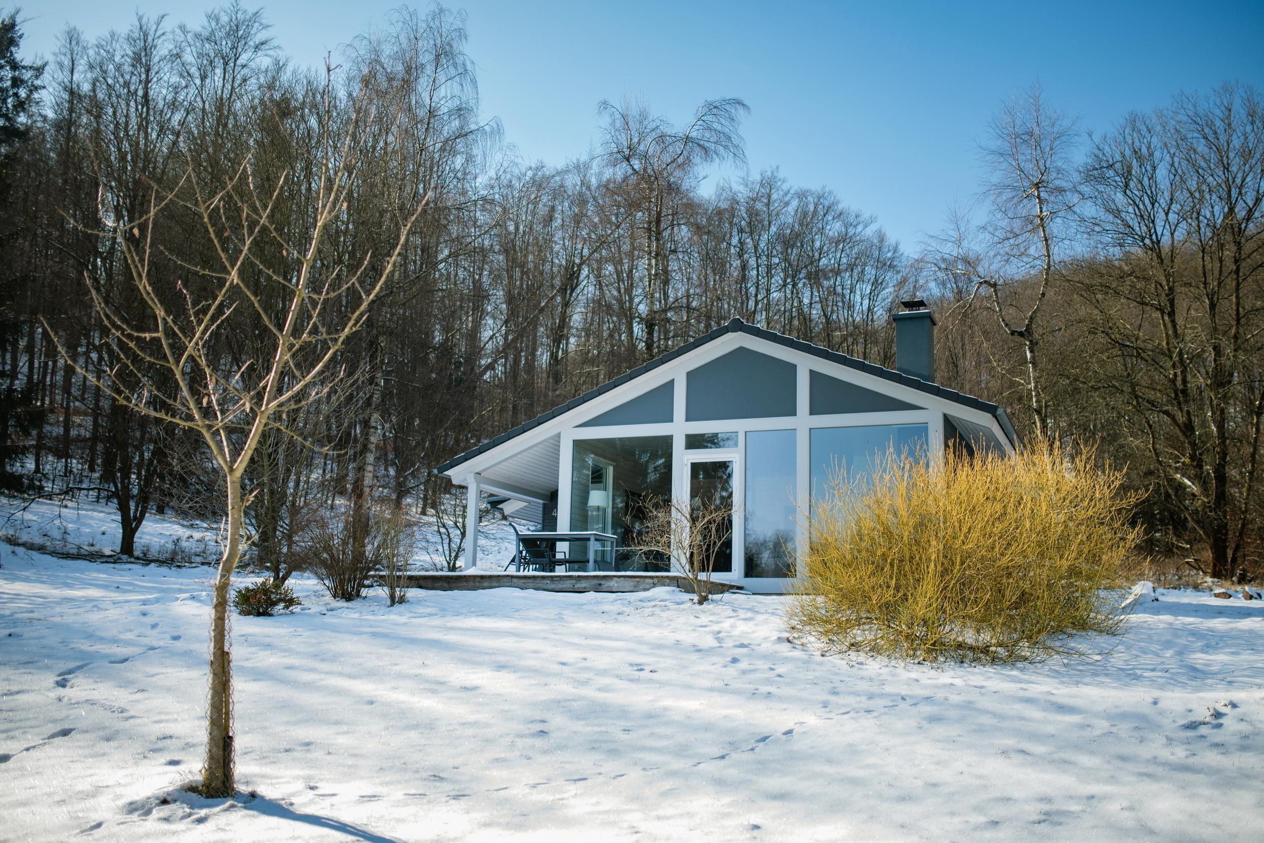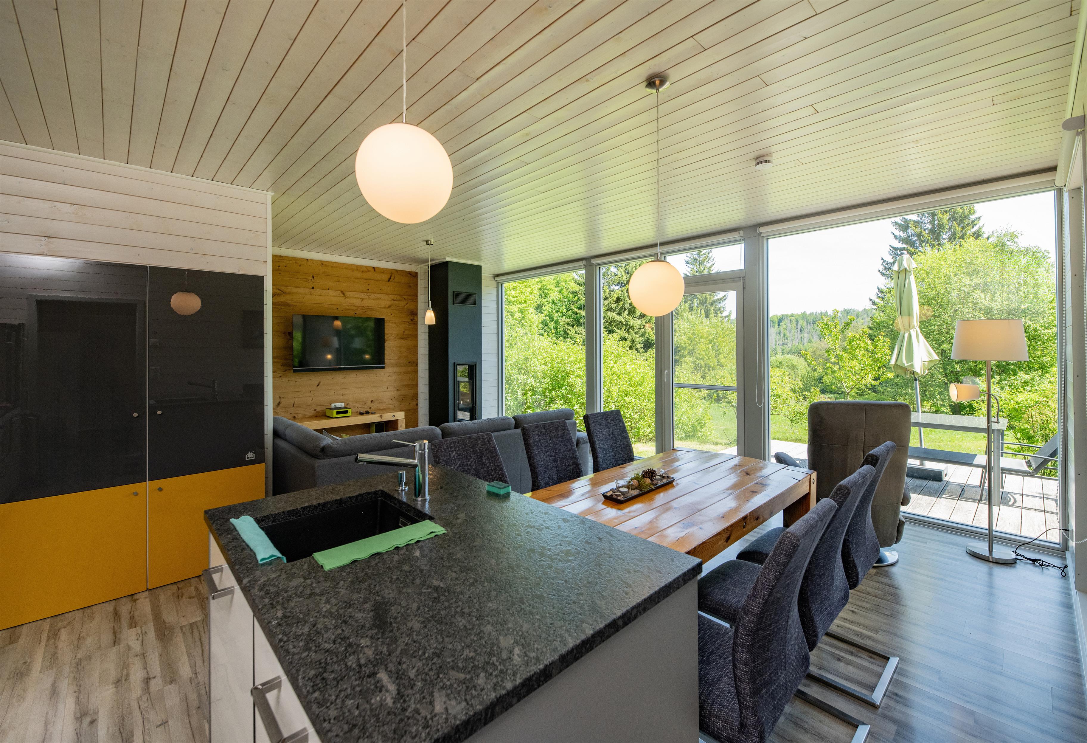 Das Ferienhaus mit einem lichtdurchluteten offenen Wohn- und Küchenbereich, zwei Schlafzimmern und einem Wellness-Bad mit Sauna bietet Ihnen auf 70 Quadratmetern ausreichend Platz für 4 Personen. Die 7 Meter breite Glasfront lässt die Natur beim Essen oder Relaxen teilhaben. In der kalten Jahreszeit vollendet das knisternde Kaminfeuer das Urlaubsfeeling.