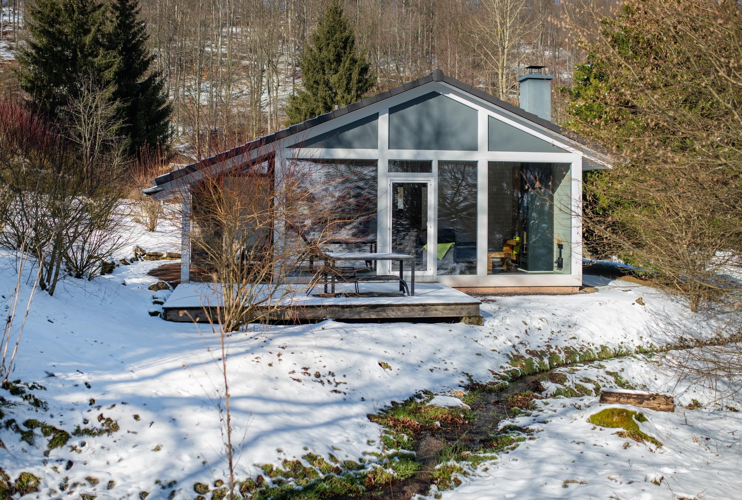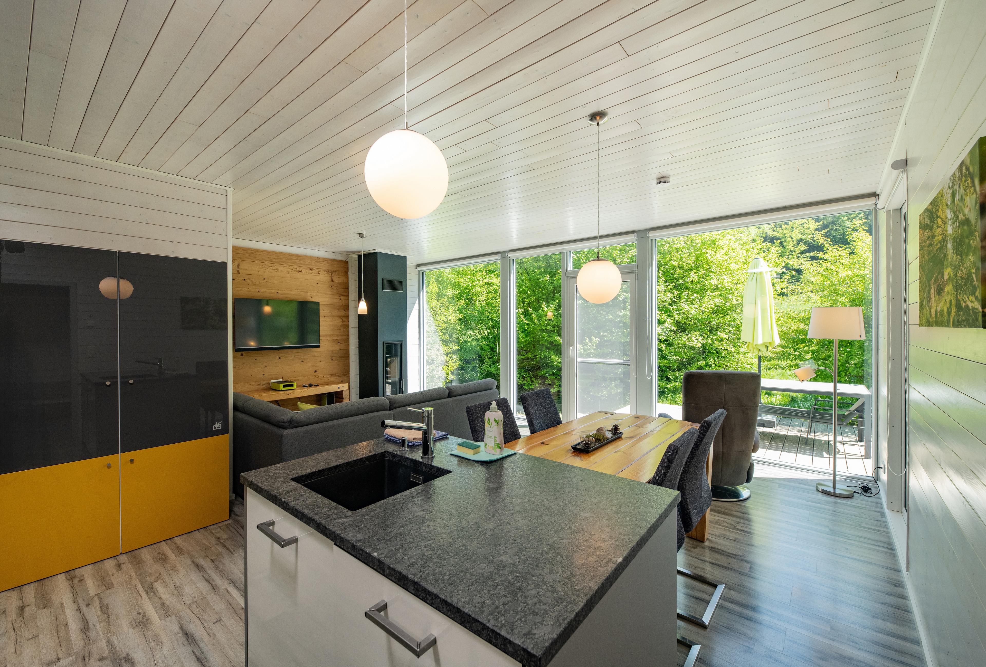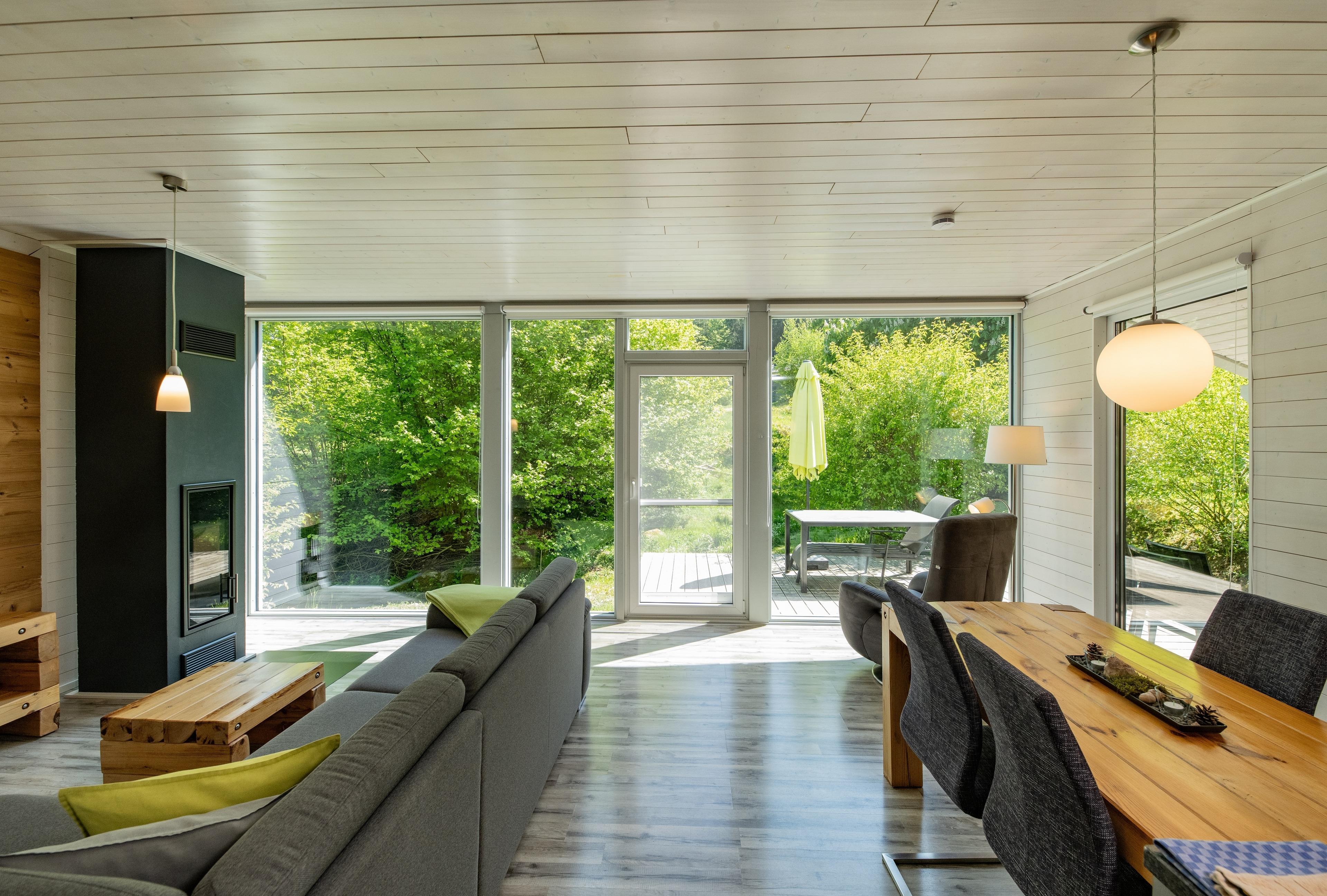 Das Ferienhaus mit einem lichtdurchluteten offenen Wohn- und Küchenbereich, zwei Schlafzimmern und einem Bad bietet Ihnen auf 61 Quadratmetern ausreichend Platz für 4 Personen. Die 7 Meter breite Glasfront lässt die Natur beim Essen oder Relaxen teilhaben. In der kalten Jahreszeit vollendet das knisternde Kaminfeuer das Urlaubsfeeling.