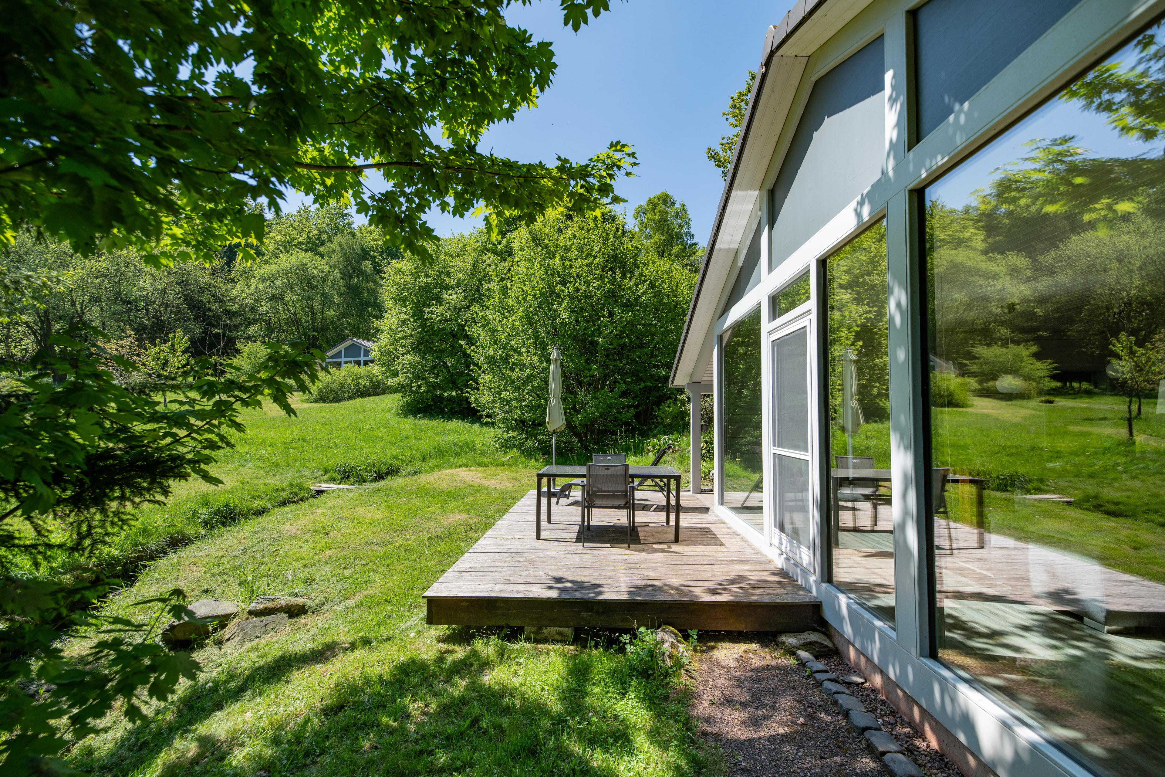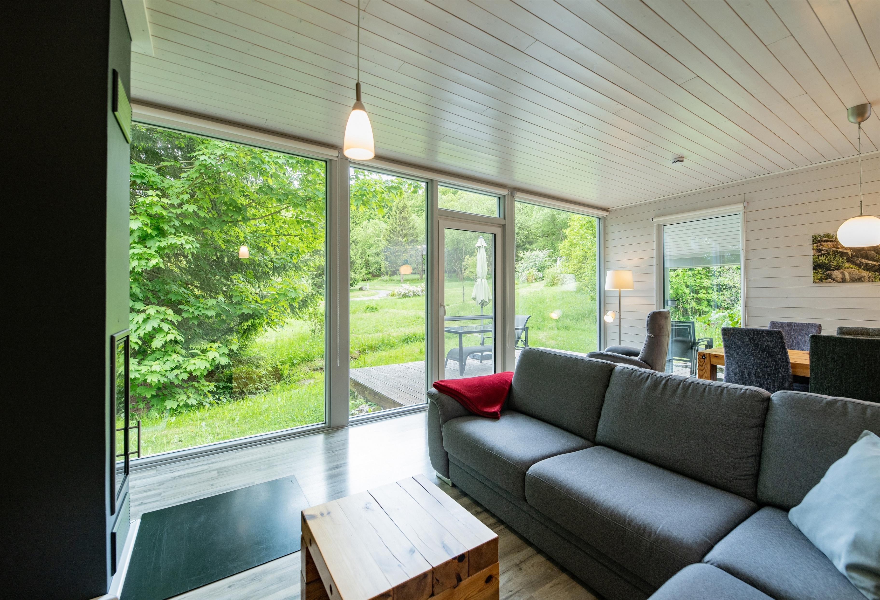 Das Ferienhaus mit einem lichtdurchluteten offenen Wohn- und Küchenbereich, zwei Schlafzimmern, einem Wellnessraum mit Infrarotkabine (Infrarotsauna) und einem Bad bietet Ihnen auf 70 Quadratmetern ausreichend Platz für 4 Personen. Die 7 Meter breite Glasfront lässt die Natur beim Essen oder Relaxen teilhaben. In der kalten Jahreszeit vollendet das knisternde Kaminfeuer das Urlaubsfeeling.