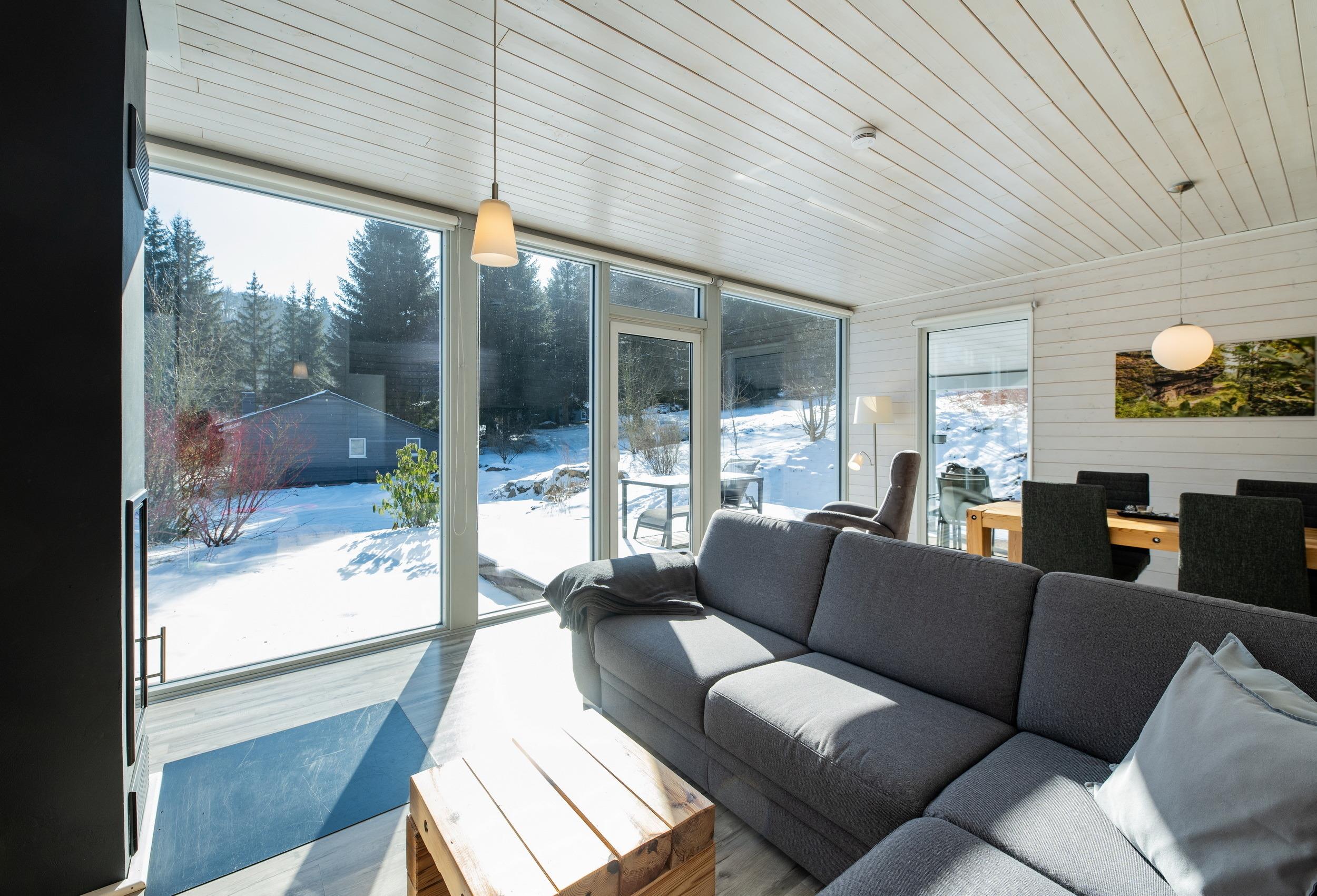 Der Wohnbereich mit einer bequemen Couch bietet freien Blick in die Natur, aber auch auf den Kaminofen und den Fernseher. Zur medialen Unterhaltung stehen außerdem ein DVD Player und eine Mini-Musikanlage zur Verfügung. SAT-Anschluß und Internet runden das technische Angebot ab.