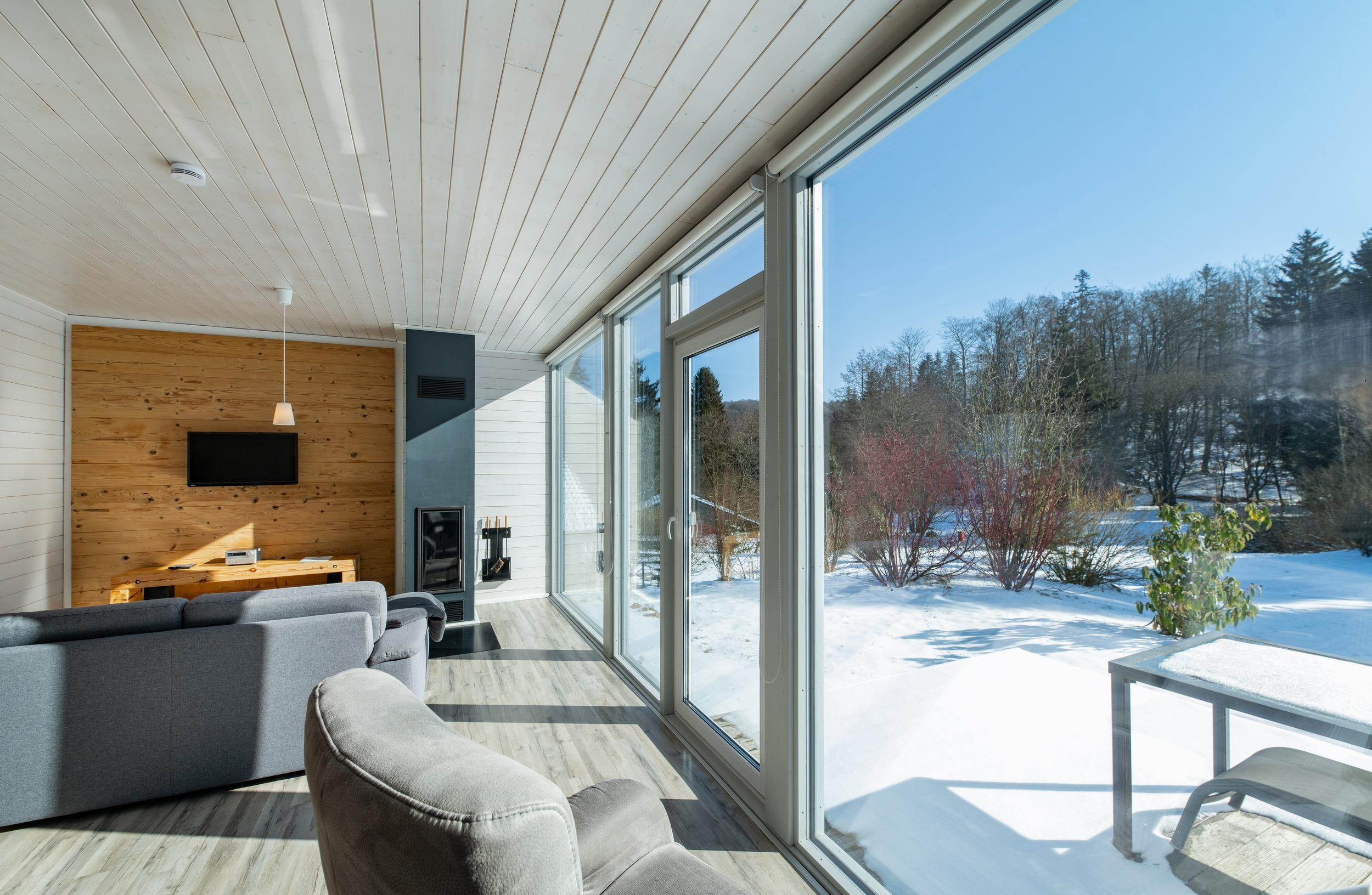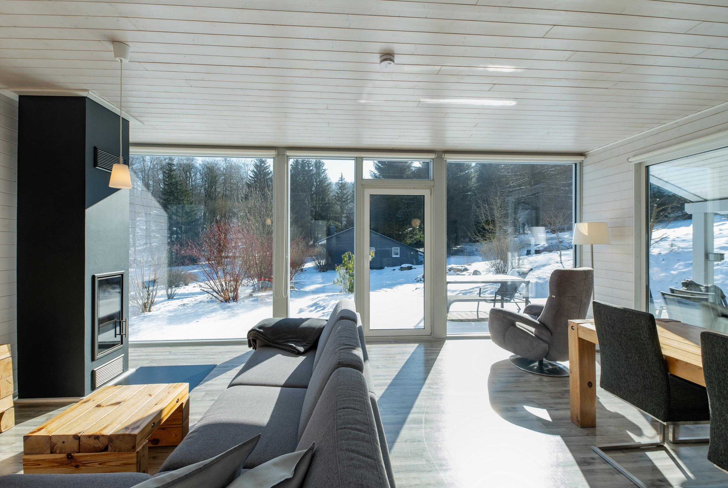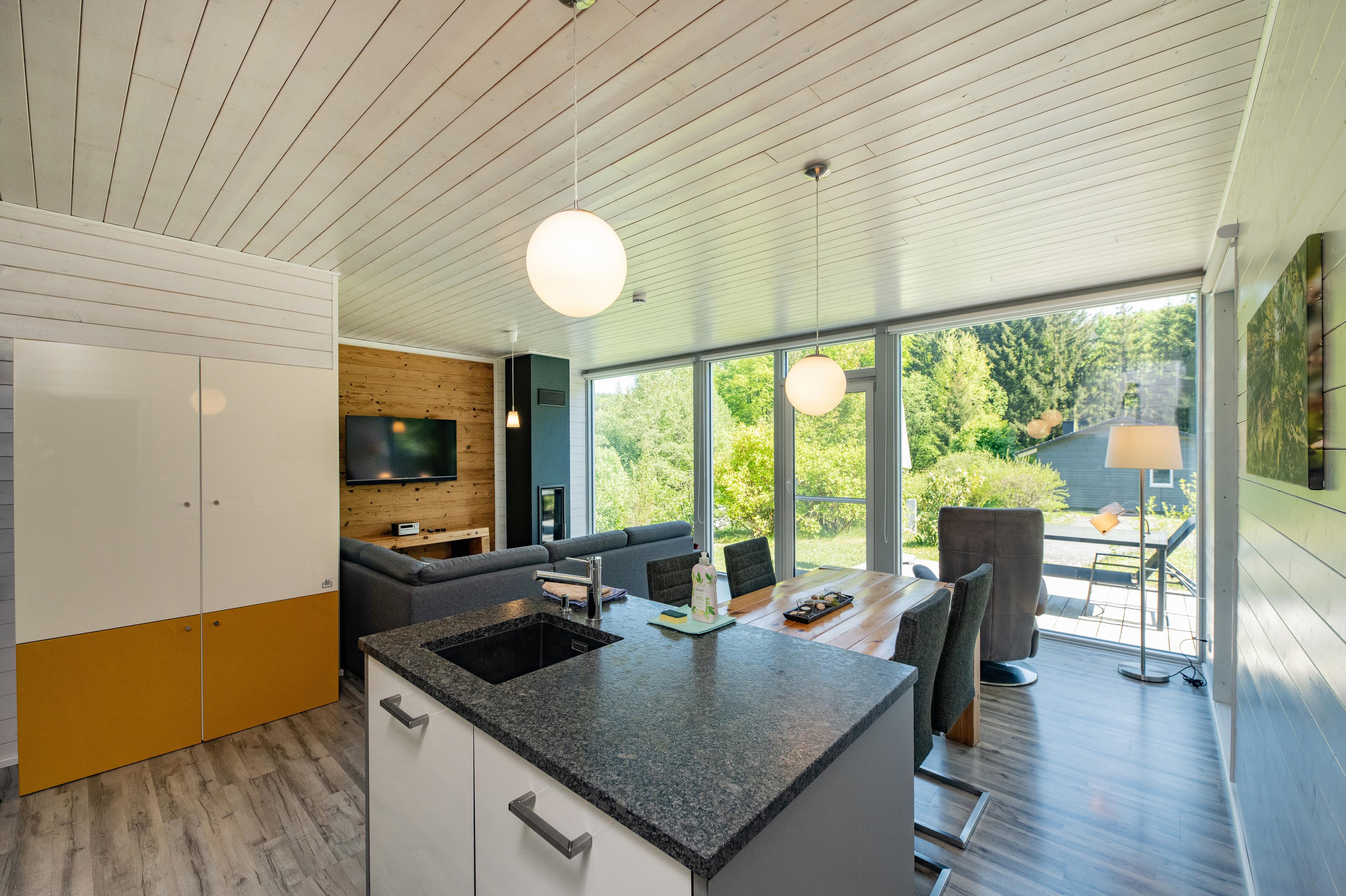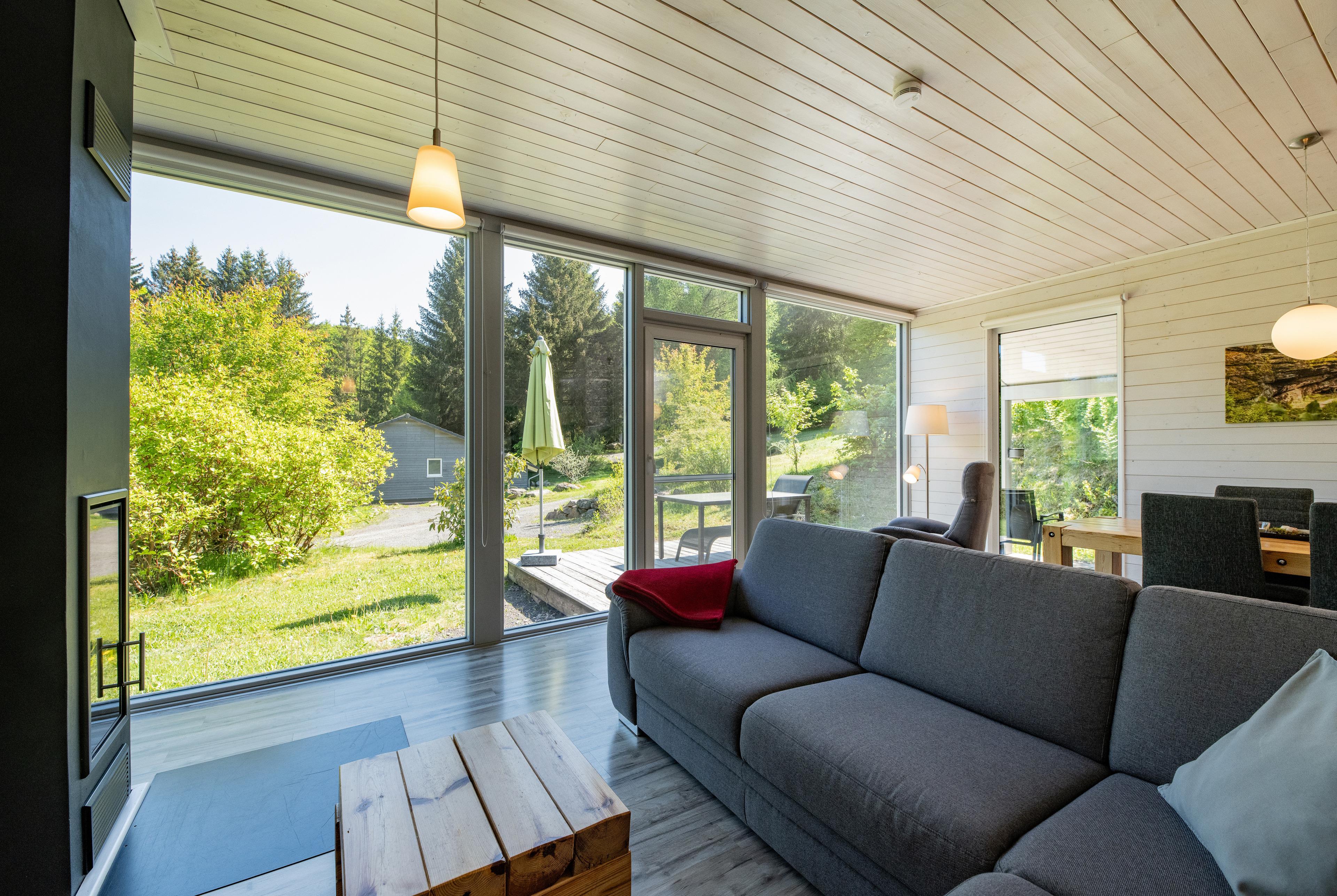 Das Ferienhaus mit einem lichtdurchluteten offenen Wohn- und Küchenbereich, zwei Schlafzimmern und einem Bad bietet Ihnen auf 61 Quadratmetern ausreichend Platz für 4 Personen. Die 7 Meter breite Glasfront lässt die Natur beim Essen oder Relaxen teilhaben. In der kalten Jahreszeit vollendet das knisternde Kaminfeuer das Urlaubsfeeling.