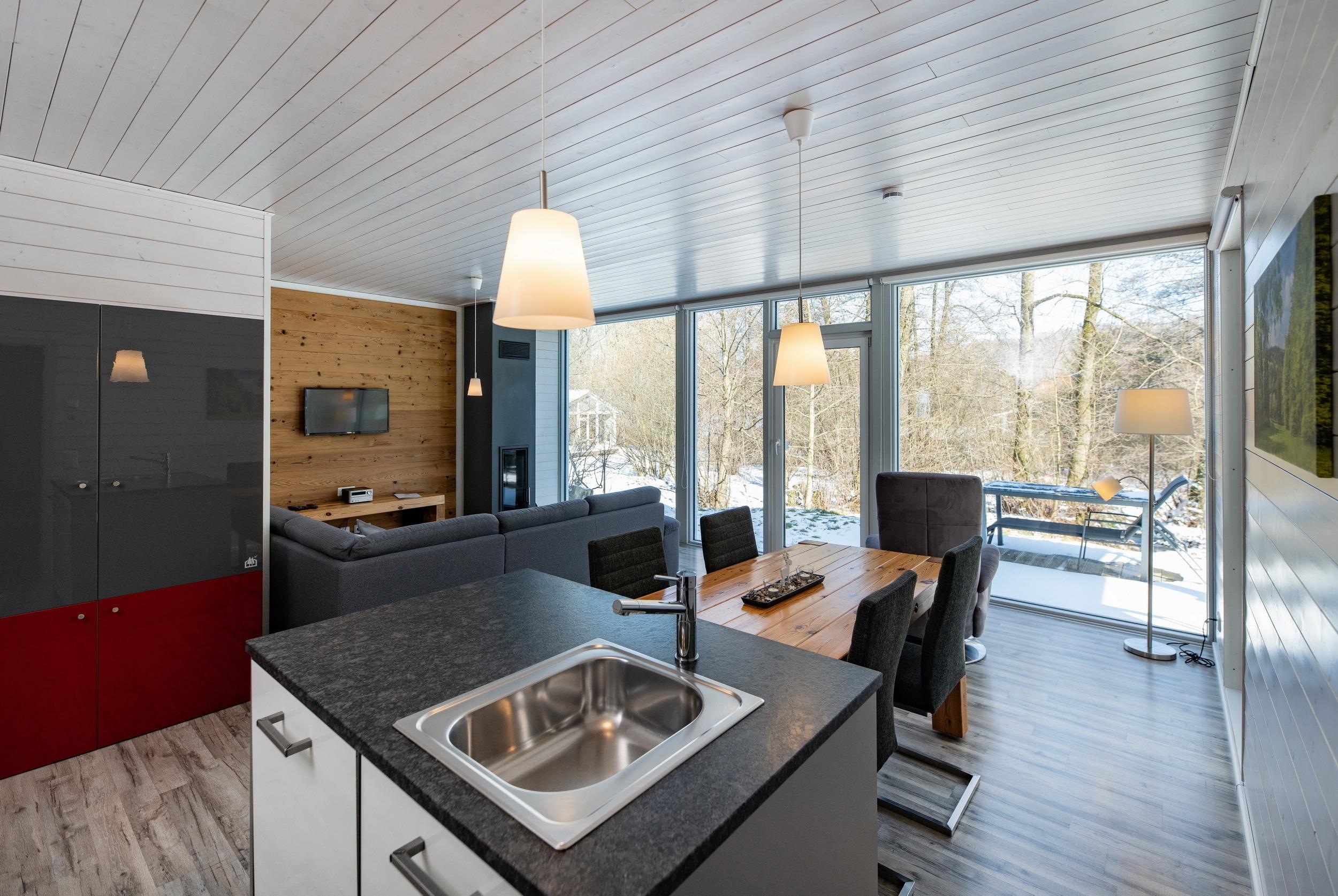 Das Ferienhaus mit einem lichtdurchluteten offenen Wohn- und Küchenbereich, zwei Schlafzimmern und einem Bad bietet Ihnen auf 61 Quadratmetern ausreichend Platz für 4 Personen. Die 7 Meter breite Glasfront lässt die Natur beim Essen oder Relaxen teilhaben. In der kalten Jahreszeit vollendet das knisternde Kaminfeuer das Urlaubsfeeling.