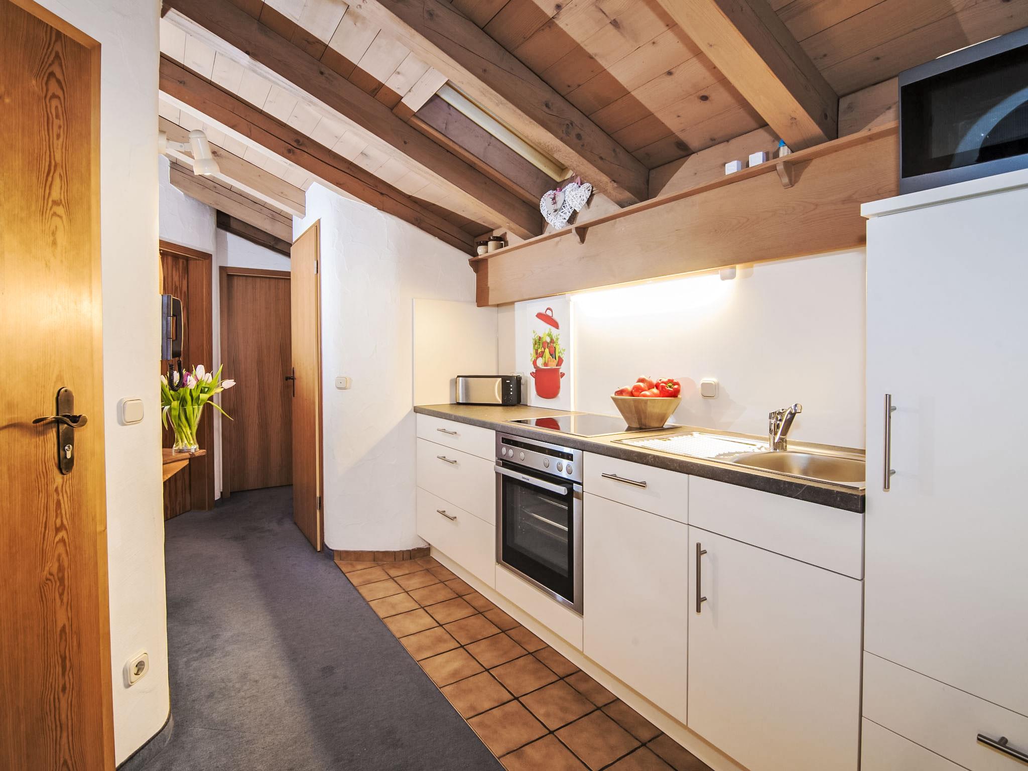 "Wohnung 8 (Am Sonneneck)", 3-room apartment 52 m2, on the top floor. With sloping ceilings, beautiful and cosy furnishings: living/dining room with 1 double sofabed and cable TV (flat screen), radio. Exit to the balcony. 1 double bedroom. Exit to the balcony. 1 small room with 1 bed (120 cm, length 200 cm). Kitchenette in the entrance (oven, dishwasher, 4 ceramic glass hob hotplates, kettle, microwave, electric coffee machine). Shower/WC, sep. WC. Balcony furniture. Facilities: children's high chair, baby cot, hair dryer. Internet (WiFi, free). Please note: non-smokers only. Smoke alarm.
